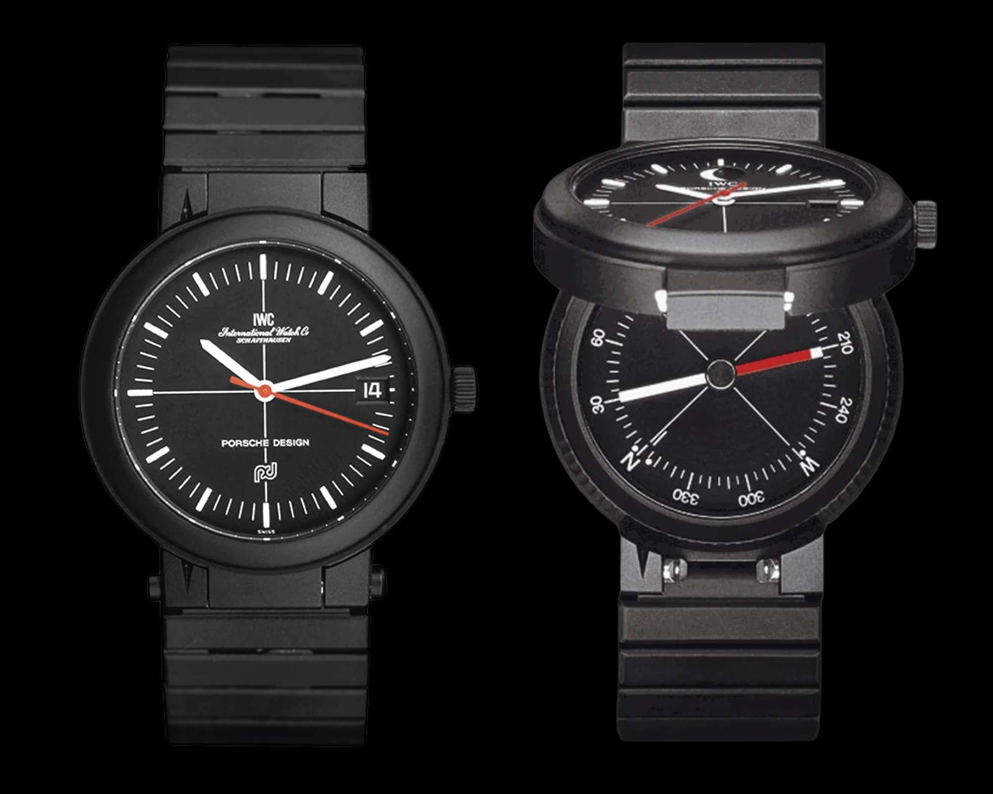 Doch sollte es nicht nur bei der völlig schwarzen Chronograph 1 bleiben. Im Jahr 1978 begann Porsche Design eine Zusammenarbeit mit IWC, in der sie mit der IWC-Referenz 3511 eine sogenannte Kompassuhr realisierten, die eine Verbindung eines amagnetischen Uhrwerks mit einem Kompass im sich aufklappbaren Gehäuseboden präsentierte. Darüber hinaus experimentierte man bei diesem ersten Projekt ebenfalls mit dem schwer zu bearbeitenden, aber für die Uhrenindustrie bestens geeigneten Material Titan als Werkstoff für das Uhrengehäuse.