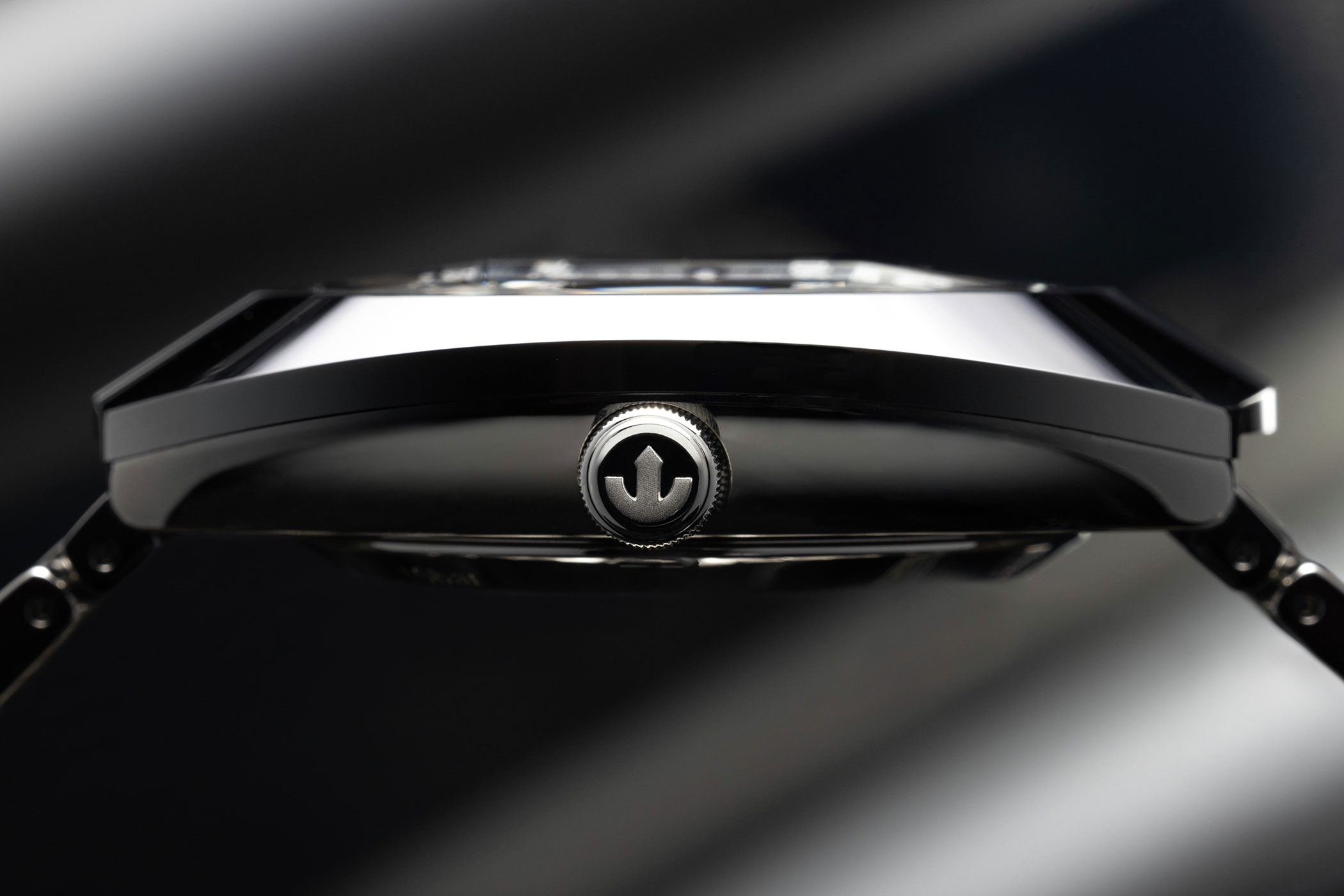 Die Anatom, welche 2023 ein fulminantes Comeback feierte, unterstreicht ihr ohnehin avantgardistisches Design nun zusätzlich durch die Kunst des Skelettierens. Auch hier kommt das in fünf Lagen auf Genauigkeit getestete Automatikkalibers R808 zum Einsatz. Das Uhrwerk ist vollständig anthrazitfarben beschichtet und mit horizontal gebürsteter Verzierung versehen.