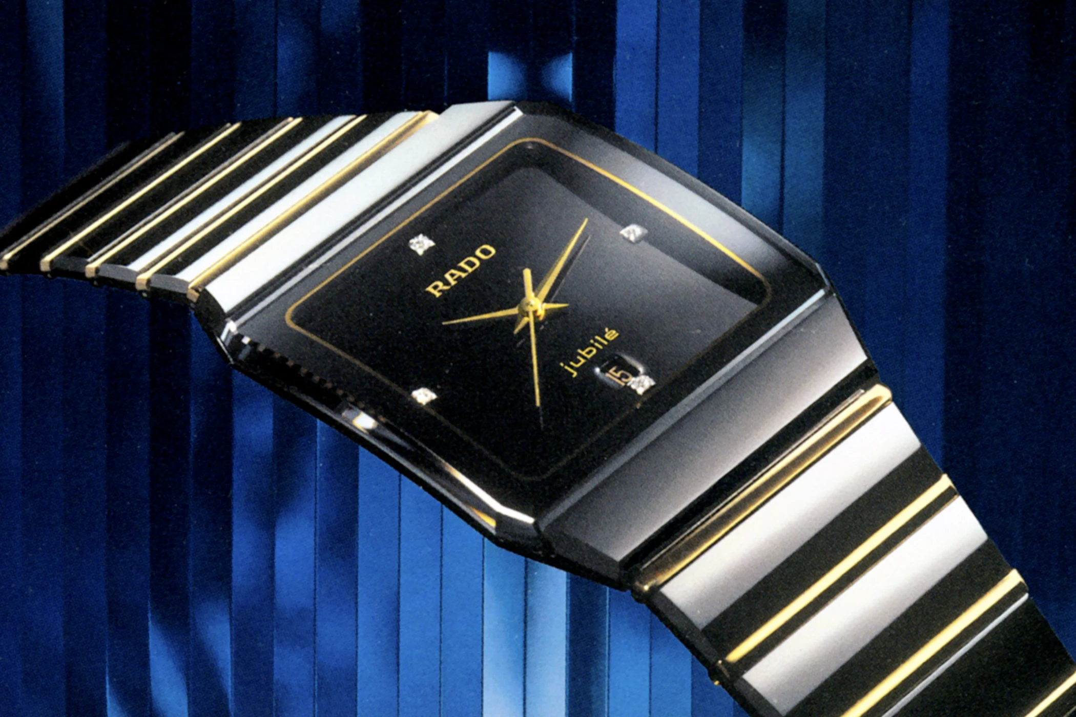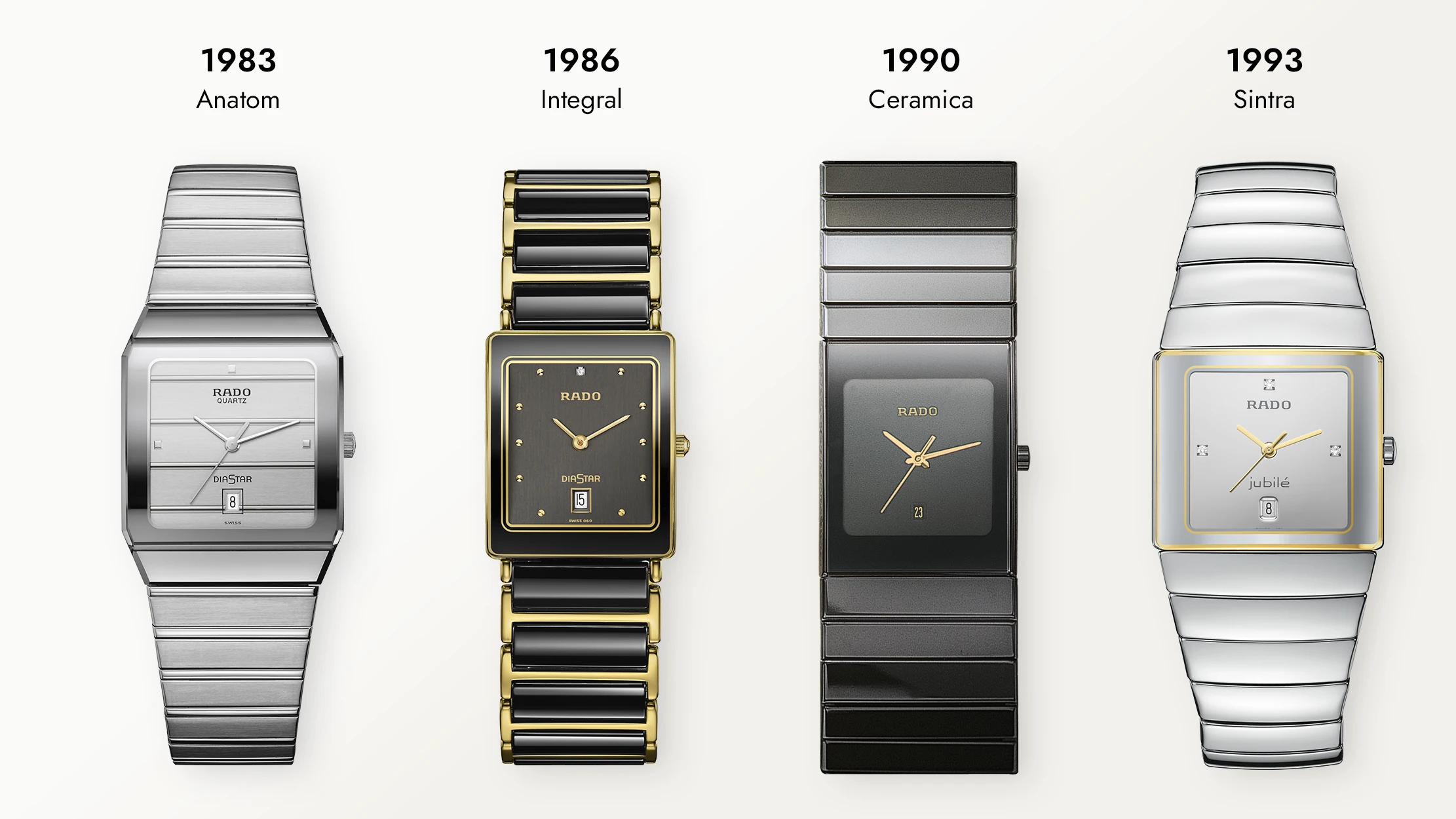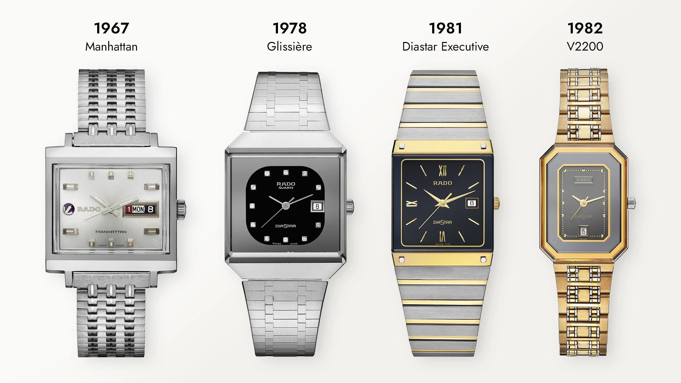 Es gibt viele weitere Beispiele für die historische Rechteck-Kompetenz von Rado, dem Master of Materials. Die Material-Verliebtheit zeigte sich auch 1983 bei der Konstruktion der Anatom. Im Fokus stand synthetisches, kratzfestes Saphirglas, welches damals aufgrund der anspruchsvollen Verarbeitung in der Regel Premiummodellen vorbehalten war. Rado setzte es bei der Anatom von Beginn an konsequent ein. Die konvexe Wölbung des Saphirglases, welches der Form des Handgelenks randlos von einer Gehäusekante zu anderen folgt, stellte Anfang der 1980er-Jahre eine große Herausforderung dar, welche der Meister des Materials souverän meisterte.