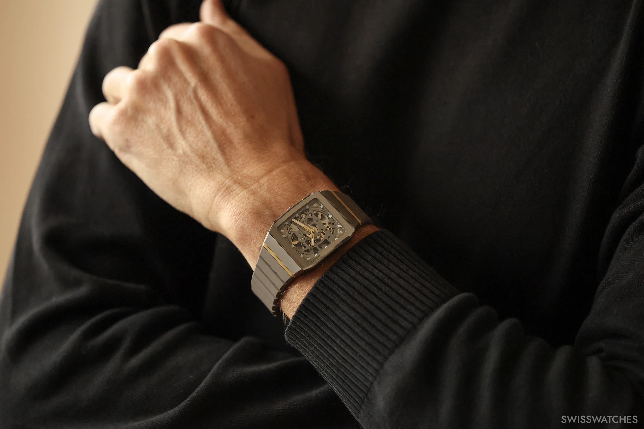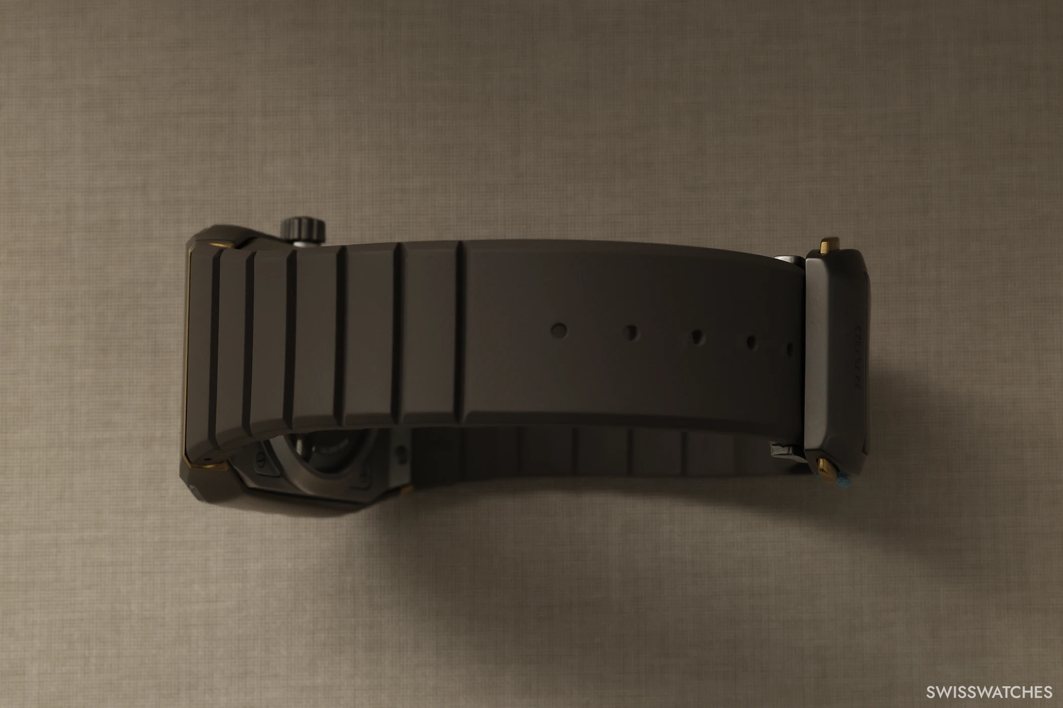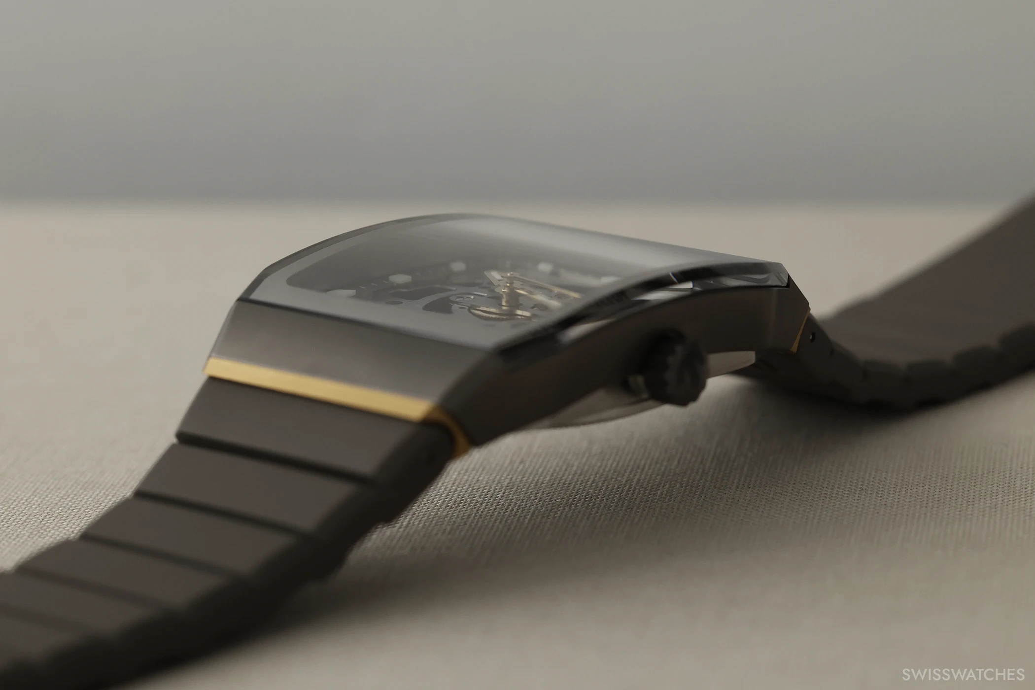 Schutz bietet das bis fünf bar wasserdichte Edelstahlgehäuse mit einer Lünette aus Plasma-Hightech-Keramik mit den Maßen 32,5 x 46,3 x 11,5 Millimeter. Der Edelstahlboden mit Saphirglas bietet neben dem Blick von oben eine weitere offenherzige Perspektive auf das Uhrwerk der Anatom Skeleton. Den Übergang zum grauen Kautschukarmband markiert ein Streifen aus gelbgoldfarbenem, PVD-beschichtetem Edelstahl – abgestimmt auf die skelettierten Minuten- und Stundenzeiger, den zentralen Sekundenzeiger und Teile des Uhrwerks.