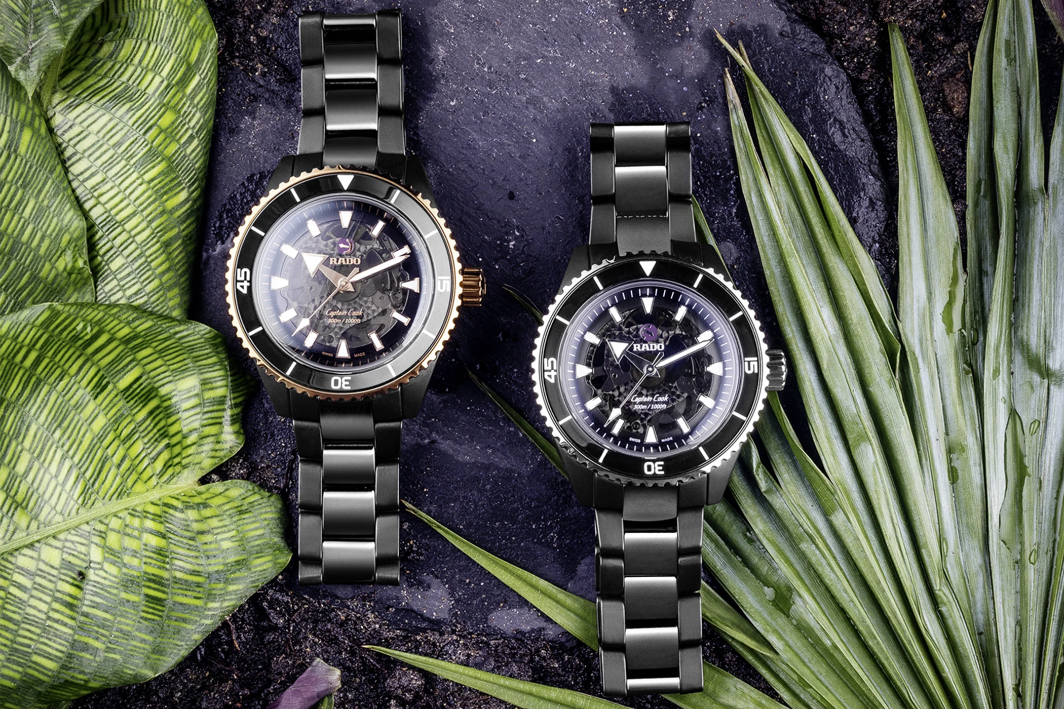 In diesem Jahr wurde Rados Captain Cook erstmals kratzfestes Hightech-Keramik für das Armband als auch für das Monobloc-Gehäuse zuteil. Das Zifferblatt unter dem kastenförmigem Chevé-Saphirglas und der Gehäuseboden bestehen aus schwarz gefärbtem Saphirglas, sodass das Innenleben in Form des skelettierten Uhrwerks R734 aus jedem Blickwinkel erkundet werden kann.