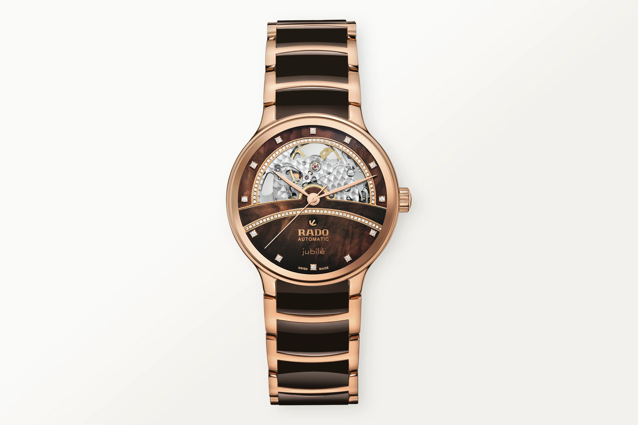 Im Jahr 2010 eingeführt, hat Rado die Kollektion Centrix stets weiterentwickelt. Nach einer teilskelettierten Version im Jahr 2015 erschien 2024 eine weitere Ausführung mit Einblick. Dieser gewährt dem Automatikkaliber R734 eine angemessene Sichtbarkeit: durch den Saphirglasboden des Gehäuses aus roségoldfarbenem PVD-Edelstahl sowie den großzügigen Ausschnitt in der oberen Hälfte des Perlmuttzifferblatts.