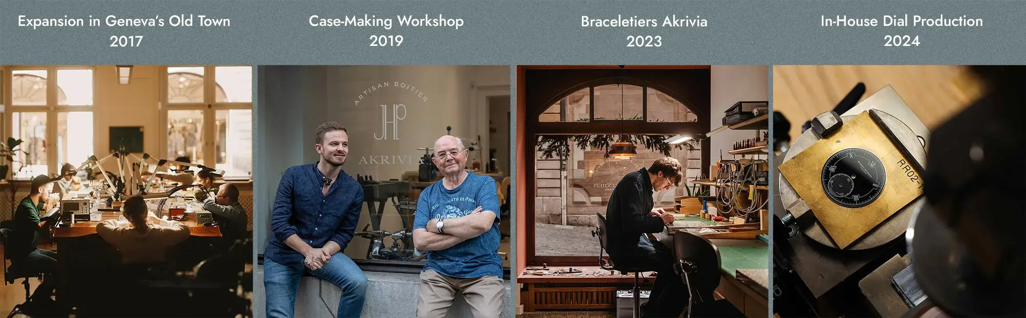 Wer die Grand-Rue in Genf entlanggeht, merkt schnell, wie viel von Rexheps Welt inzwischen hier versammelt ist. Da ist das Zifferblatt-Atelier, in dem Grand-Feu-Email nun intern gefertigt wird. Da ist das Gehäuse-Atelier, in dem der inzwischen verstorbene Jean-Pierre Hagmann bis Anfang vergangenen Jahres Gehäuse vollständig von Hand formte. Mit seinem Tod ging eine Ära zu Ende – nicht jedoch, ohne dass er etwas weitergegeben hätte, das über Stil weit hinausging: eine Art, über Proportion, Konstruktion und die Disziplin des Gehäusebaus nachzudenken. Und da ist die erst kürzlich gegründete Uhrmacherschule, in der Rexhep gemeinsam mit seinem eigenen Lehrer Jean-Marc Figols die nächste Generation von Uhrmachern ausbildet.