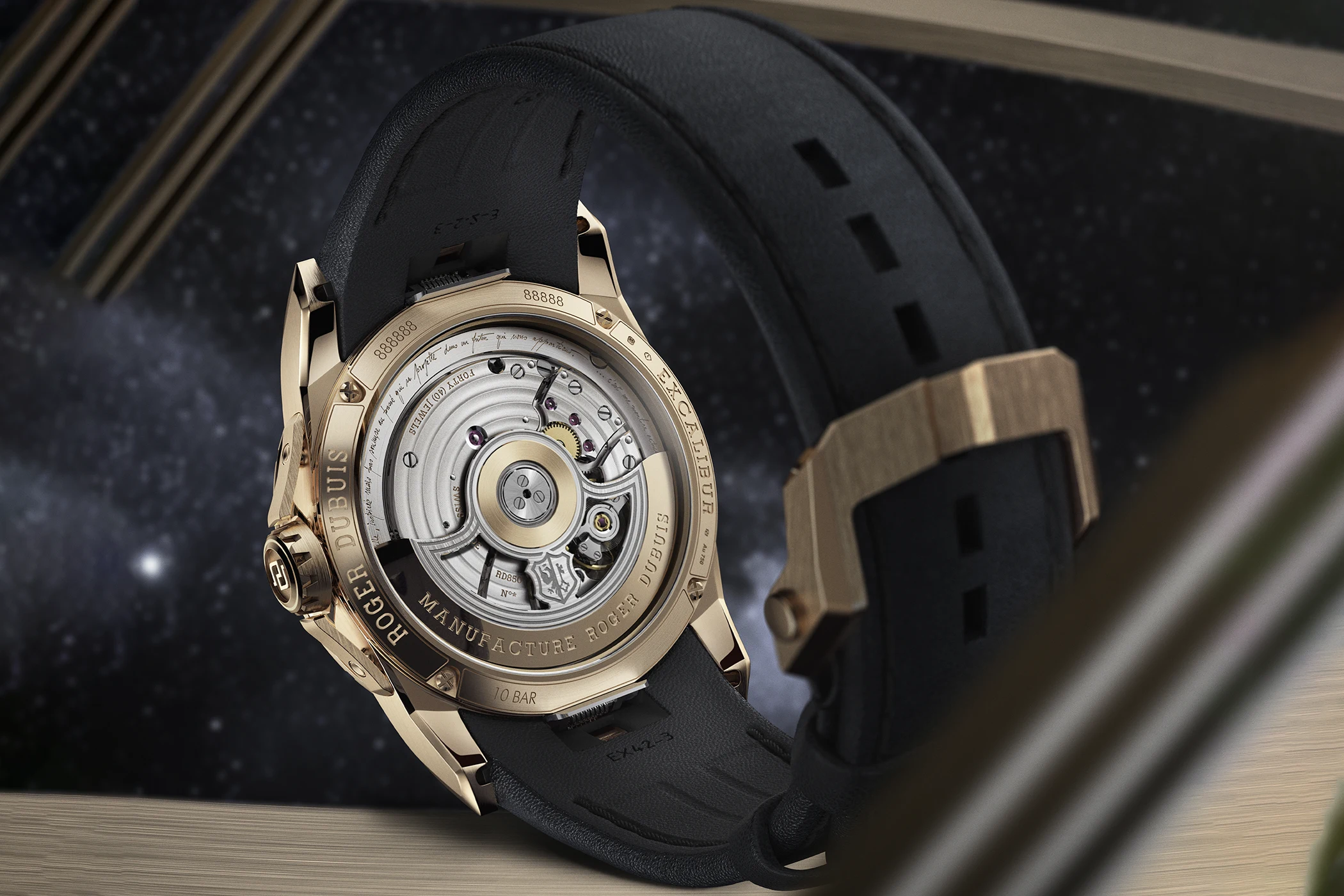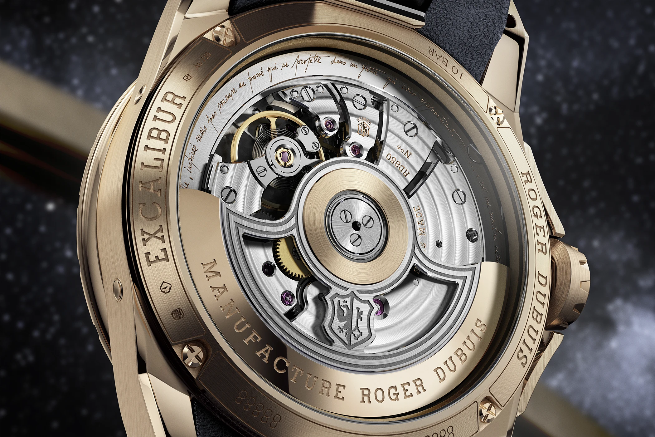 Gerade hier gewinnt die Uhr ihr Profil: Sie zeigt Kalendermechanik nicht als statische Konstruktion, sondern als dynamisch gegliederte Anzeige. Die bi-retrograde Darstellung verleiht der Anzeige von Tag und Datum einen technisch anspruchsvollen Rhythmus, der zugleich eine klare visuelle Identität stiftet. Die bi-retrograde Anzeige wurde 1989 von Roger Dubuis und Jean-Marc Wiederrecht gemeinsam zum Patent angemeldet und fand sich ab 1996 in den frühen Modellen von Roger Dubuis, insbesondere in den ersten bi-retrograden Kalenderuhren der Sympathie- und Hommage-Linie, wieder. Die Excalibur Biretrograde Perpetual Calendar trägt damit nicht nur eine Komplikation, sondern ein Stück Markengeschichte auf dem Zifferblatt.