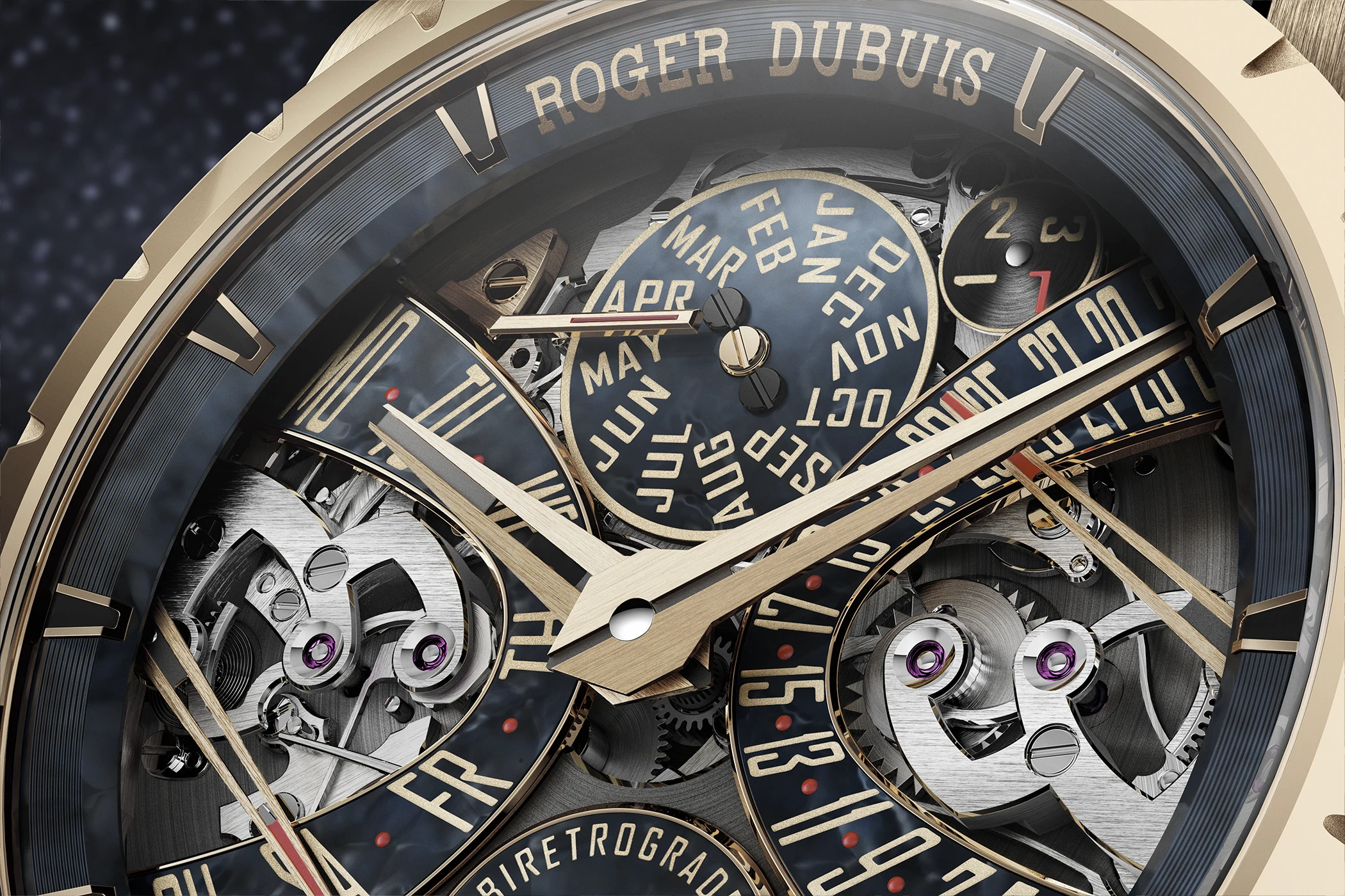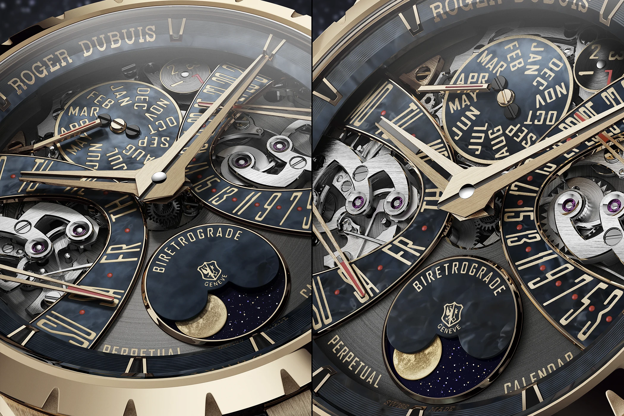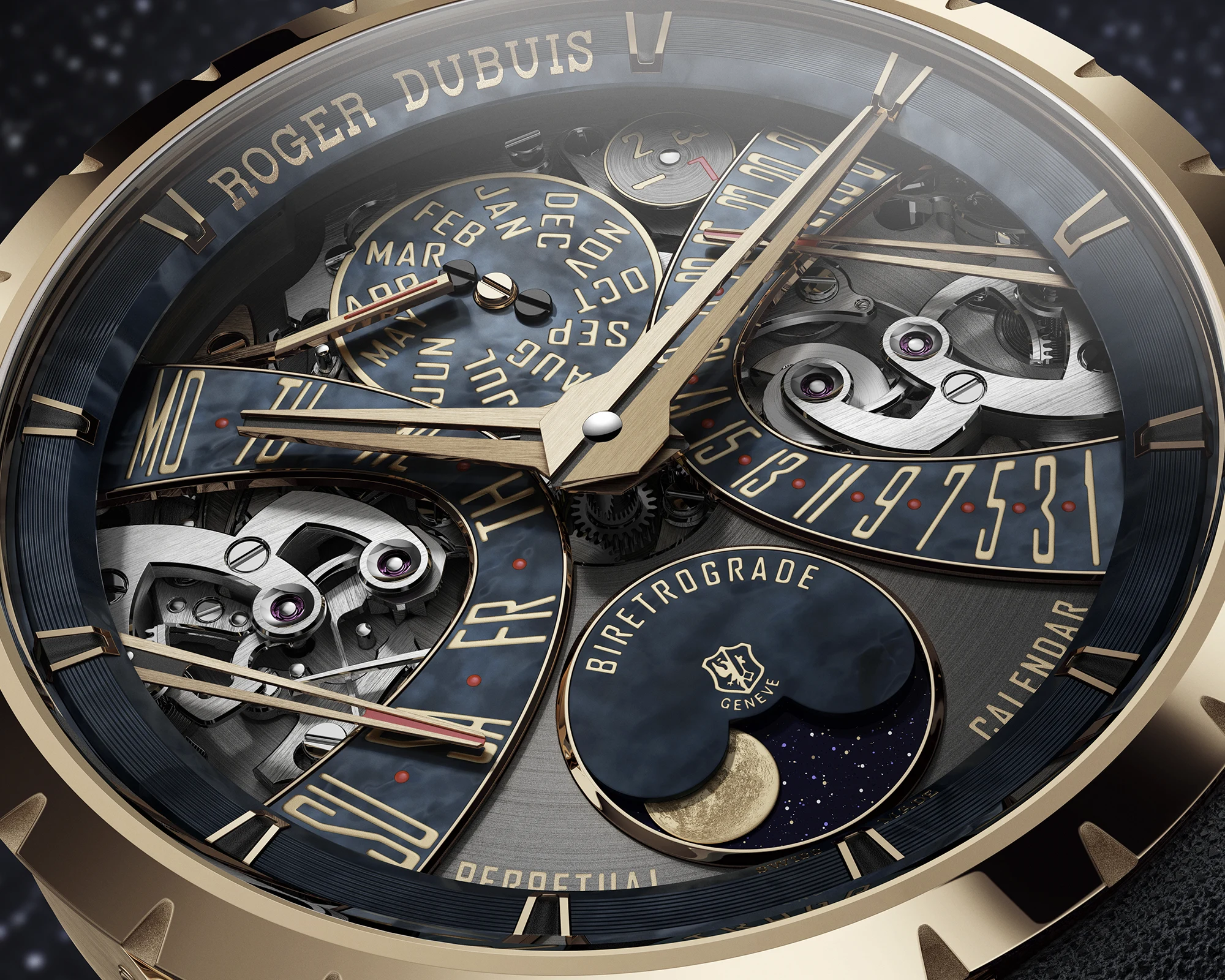 Das Zentrum dieser Excalibur bildet der Ewige Kalender – eine Komplikation, die in der Haute Horlogerie nicht nur als technisch anspruchsvoll gilt, sondern als Paradebeispiel echter Uhrmacherkunst. Roger Dubuis knüpft damit an ein Thema an, das innerhalb der Maison eine besondere historische und technische Bedeutung besitzt. Doch die Neuheit erschöpft sich nicht in der bloßen Wiederaufnahme einer großen klassischen Disziplin. Sie verbindet den Ewigen Kalender mit jener bi-retrograden Anzeige von Tag und Datum, die seit langem zu den gestalterischen und mechanischen Signaturen des Hauses Roger Dubuis zählt. Beide Anzeigen folgen elliptischen Bahnen und springen nach vollendetem Umlauf augenblicklich an ihren Ursprung zurück – eine Lösung, die Präzision und Bewegung gleichermaßen sichtbar macht.