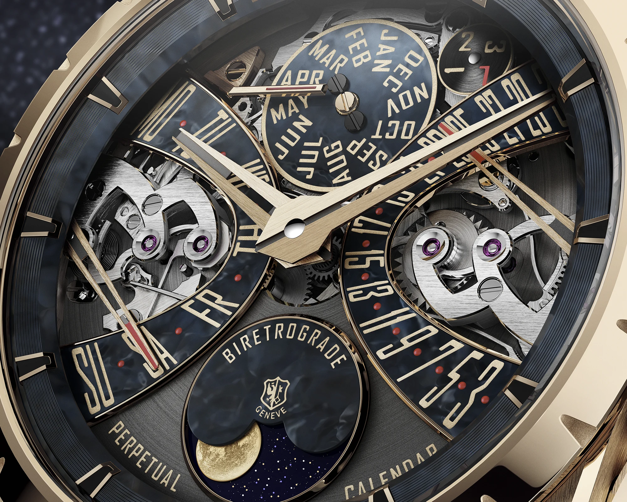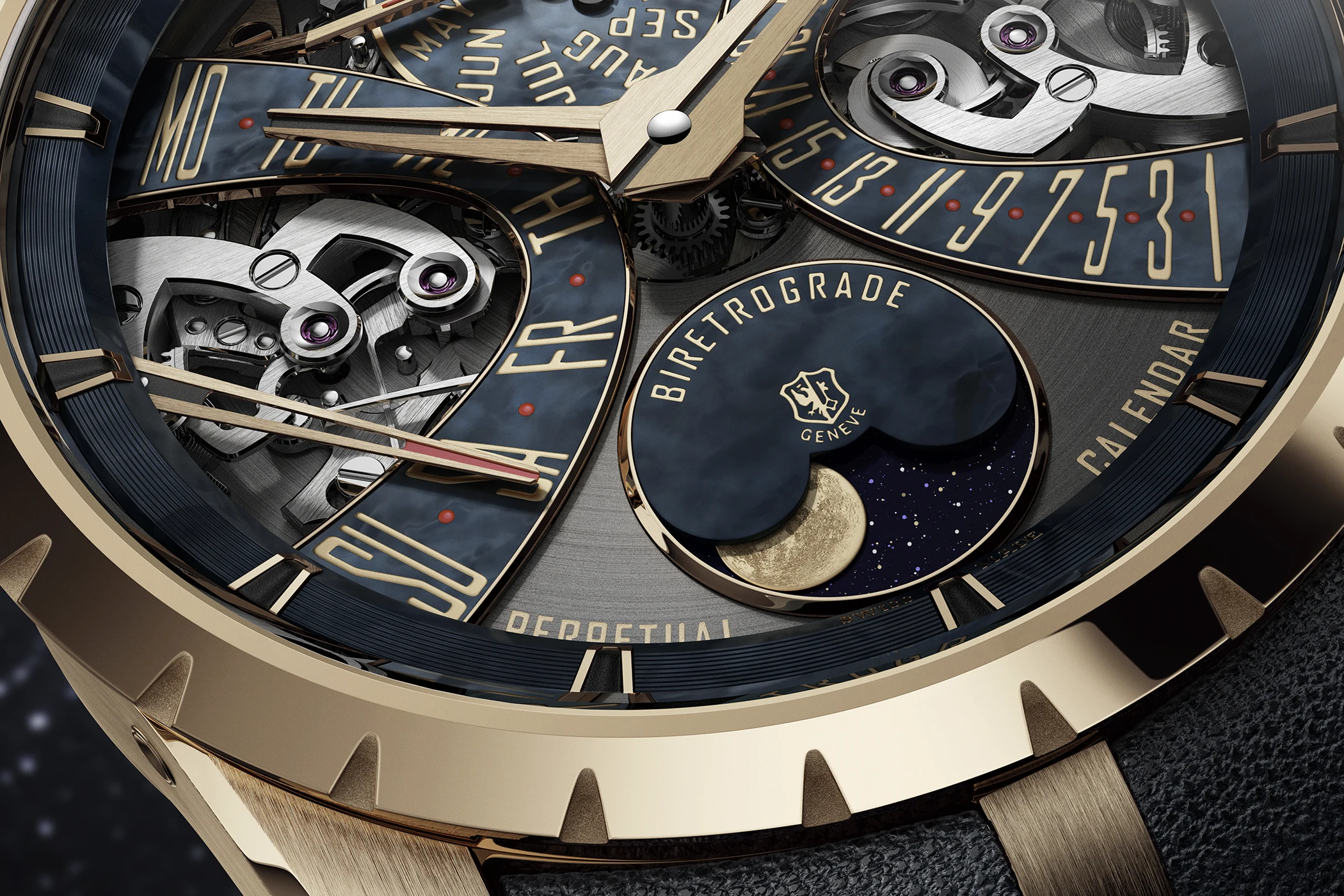 Gestalterisch lebt die Uhr von einem skelettierten Zifferblatt, das sich in neun Ebenen staffelt und daraus eine eindrucksvolle Tiefenwirkung bezieht. Die Konstruktion gibt das Werk nicht einfach preis, sondern organisiert Anzeigen, Flächen und Mechanik zu einer klar gegliederten Raumarchitektur. Im neuen Farbton Astralblau gewinnt diese Komposition eine kühle, souveräne Präsenz, die ihre technische Komplexität deutlich unterstreicht.