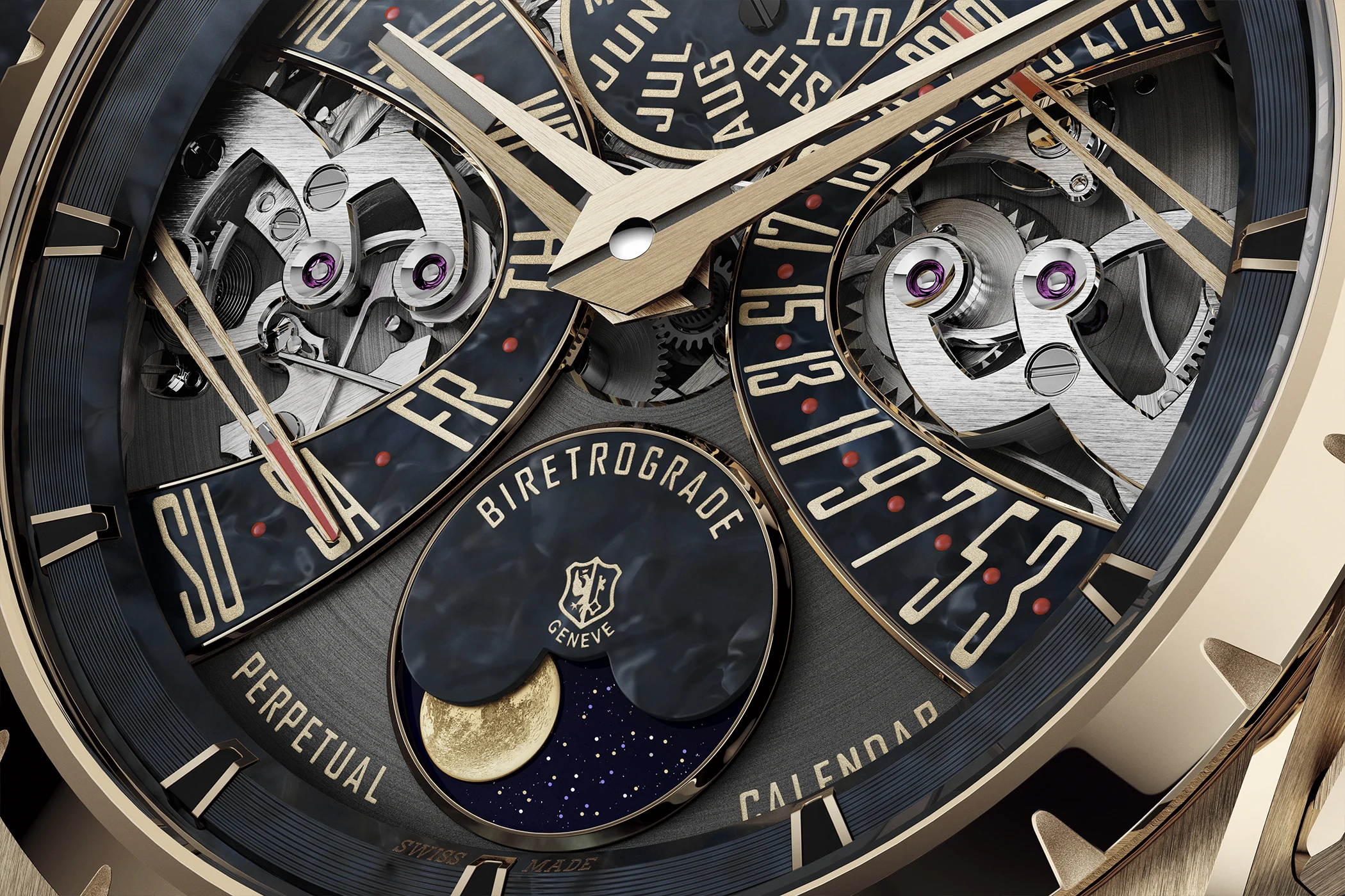 Die Konsequenz ist beachtlich. Während konventionelle Mondphasenanzeigen den Zyklus meist auf etwa 29,5 Tage runden und deshalb nach zwei bis drei Jahren einen Korrekturbedarf von einem Tag aufweisen, bleibt die Anzeige dieser Excalibur rund 122 Jahre exakt, bevor eine Justierung nötig wird. Im Zusammenspiel mit dem Ewigen Kalender entsteht so ein Zeitmesser, der kalendarische Ordnung und astronomischen Rhythmus präzise miteinander verknüpft.