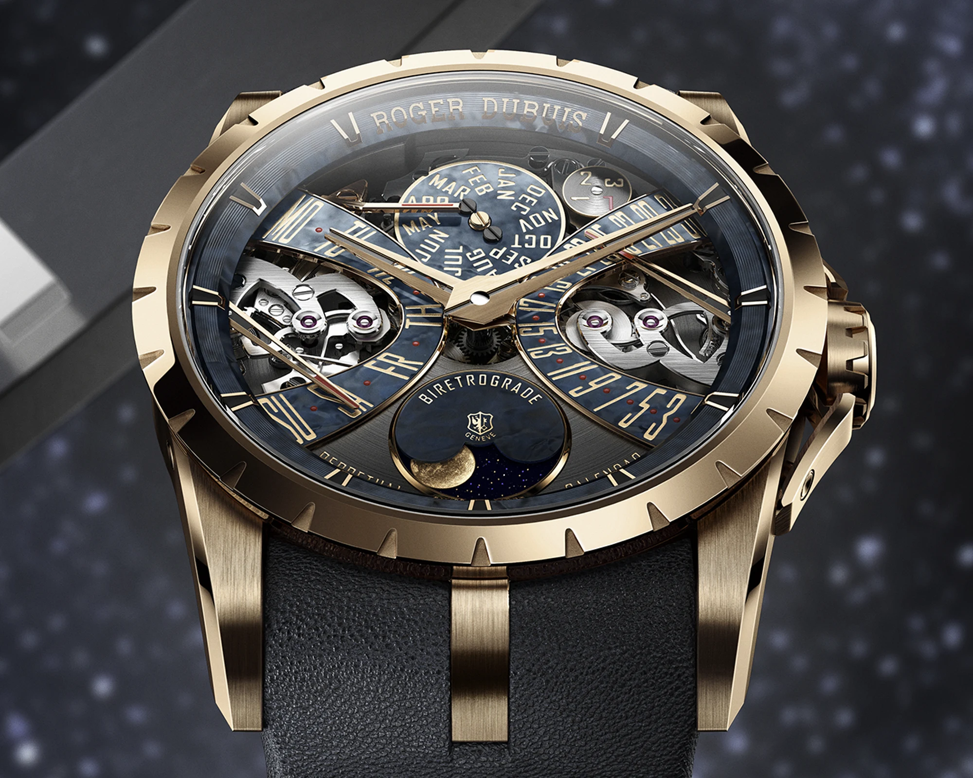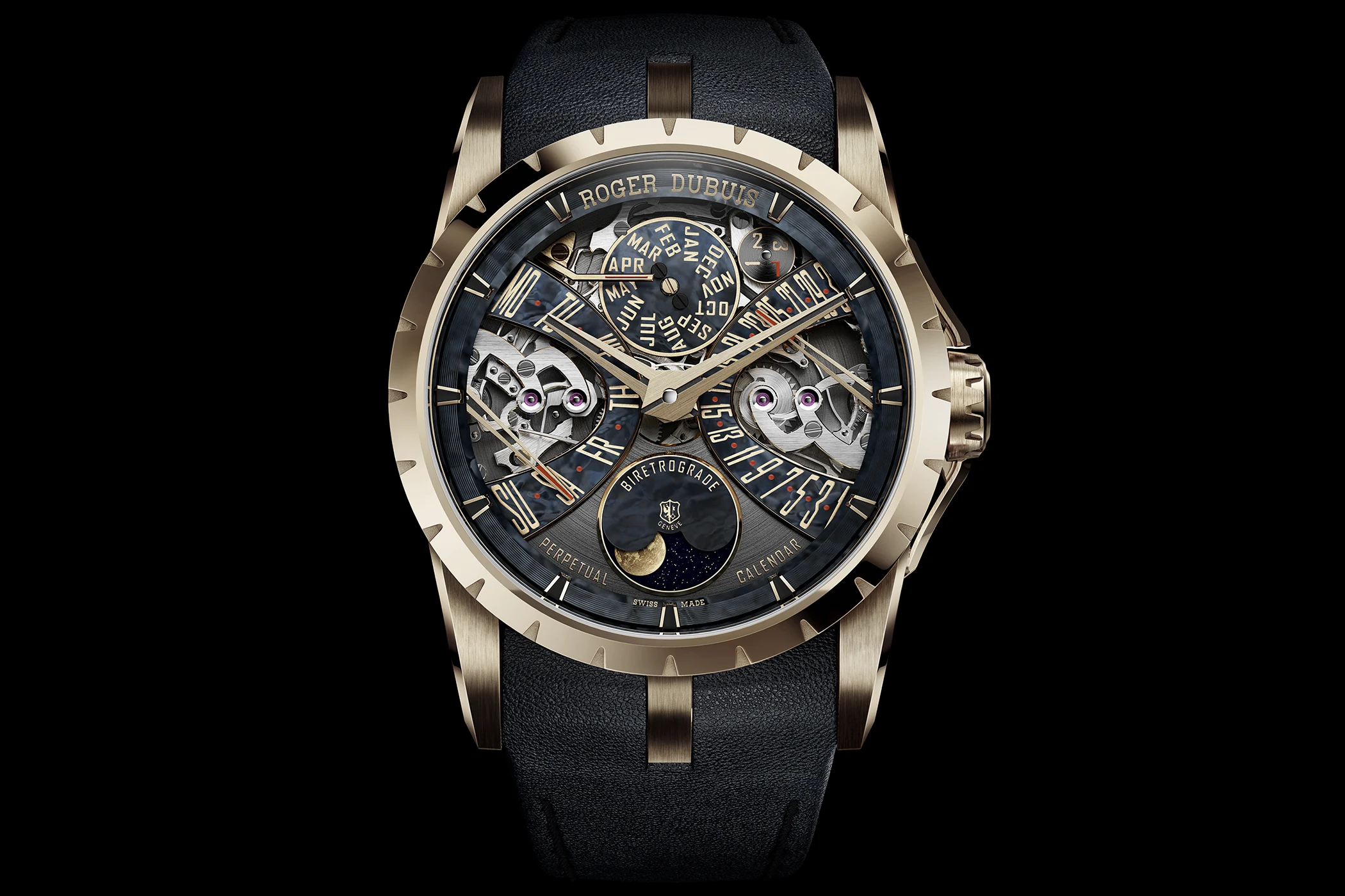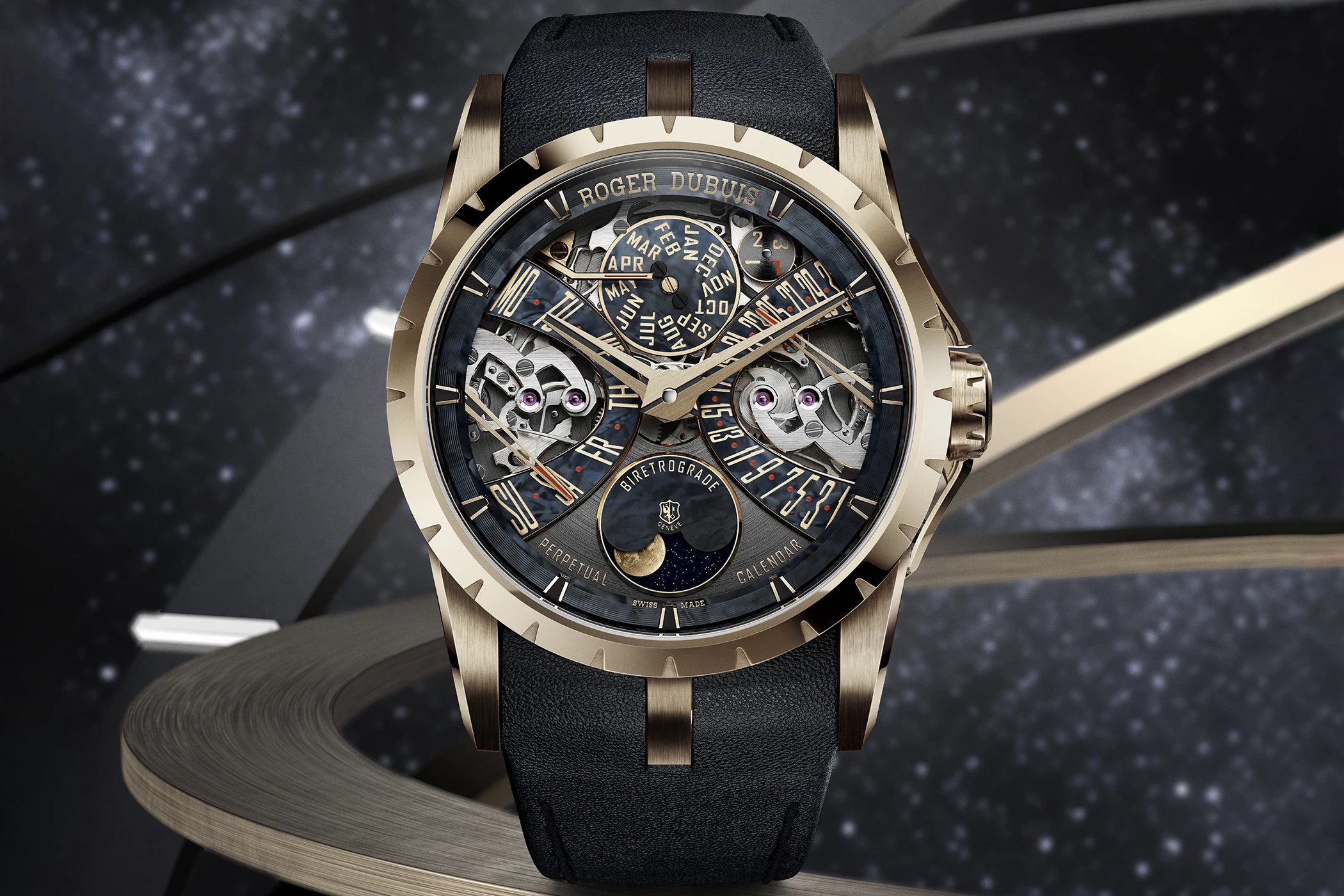 Mit der Excalibur Biretrograde Perpetual Calendar schärft Roger Dubuis das Thema Ewiger Kalender auf bemerkenswert eigenständige Weise. Astronomie, mechanische Ordnung und expressive Gestaltung greifen hier so präzise ineinander, dass die Uhr weniger wie eine Addition einzelner Komplikationen wirkt als wie ein geschlossenes uhrmacherisches Statement.