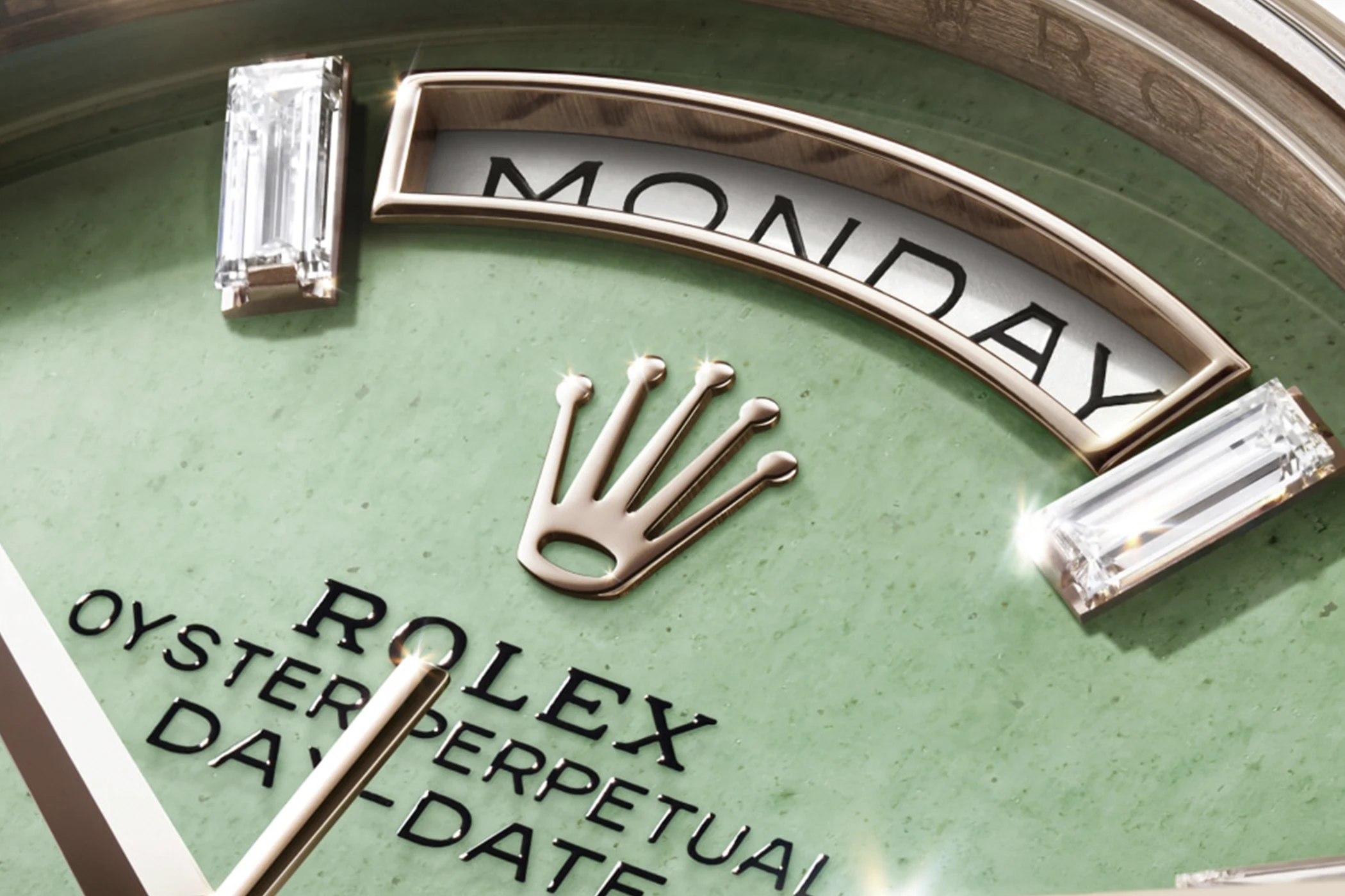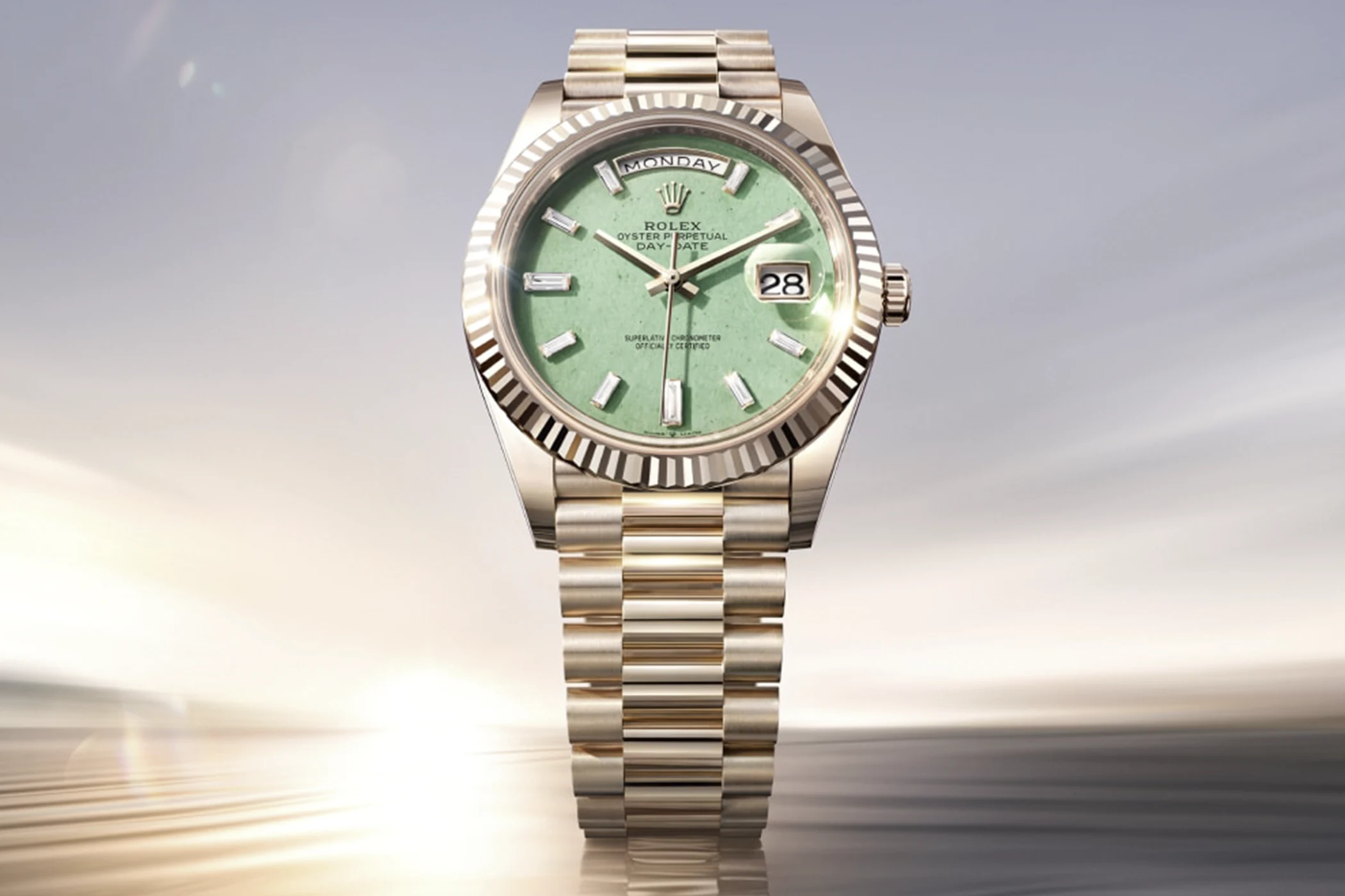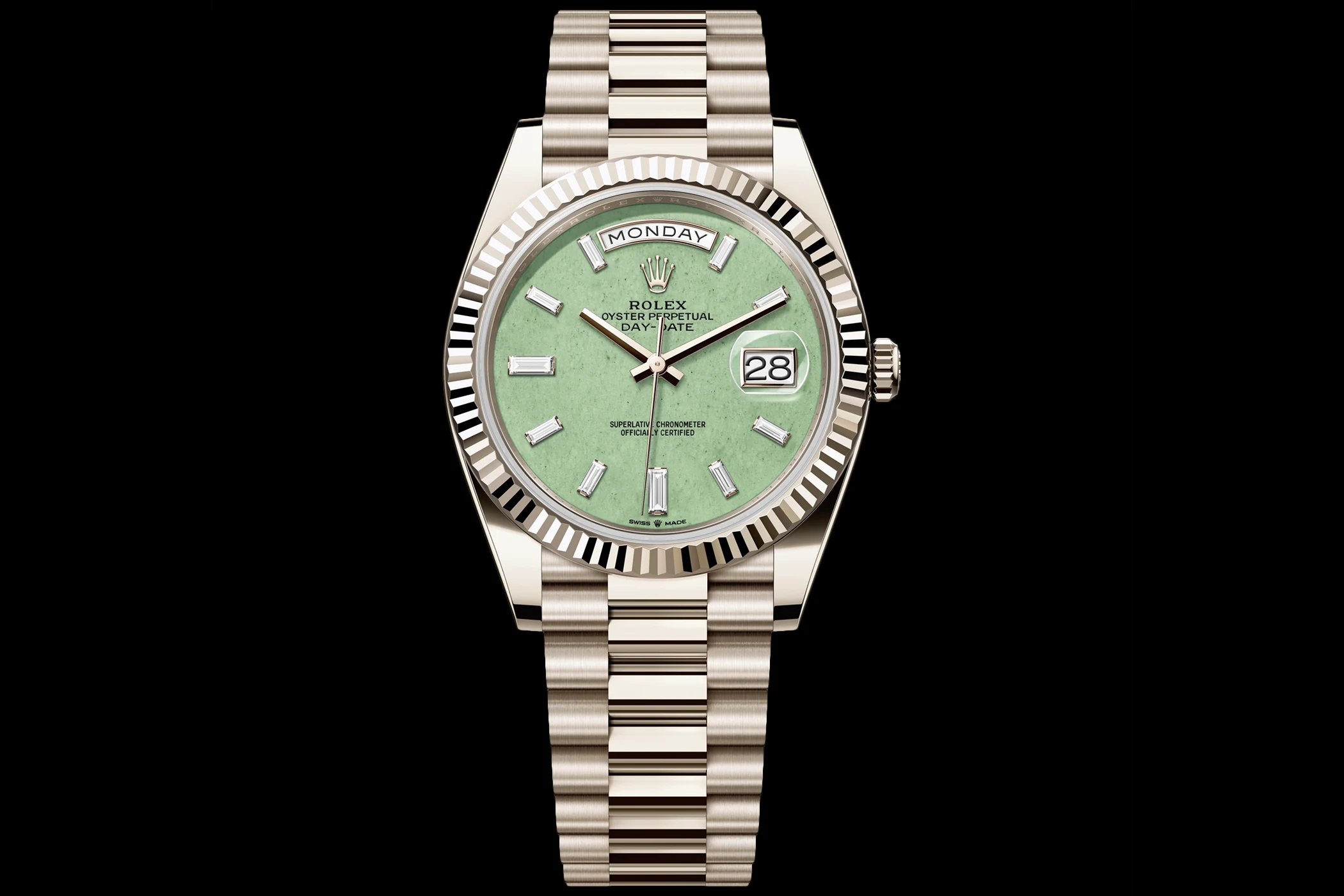 Passend dazu kombiniert Rolex das neue Material mit einem hellgrünen Aventurin-Zifferblatt aus Naturstein und einem Stundenring aus zehn Diamanten im Baguetteschliff. Hinzu kommen die geriffelte Lünette und das berühmt berüchtigte President-Band mit verdeckter Crownclasp. Technisch bleibt die Uhr auf vertrautem Terrain: Im Inneren arbeitet das Kaliber 3255 mit Tages- und Datumsanzeige sowie rund 70 Stunden Gangreserve.