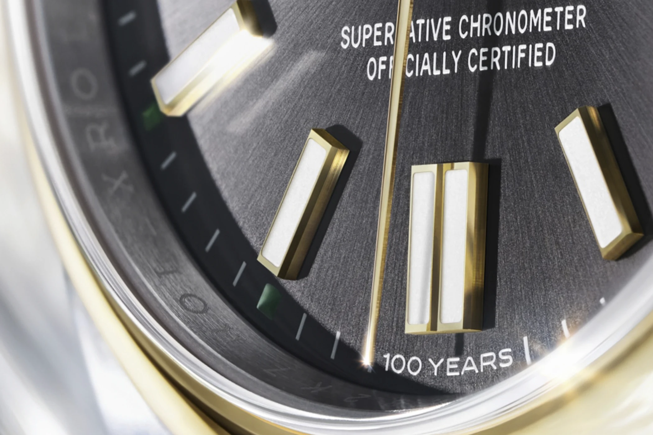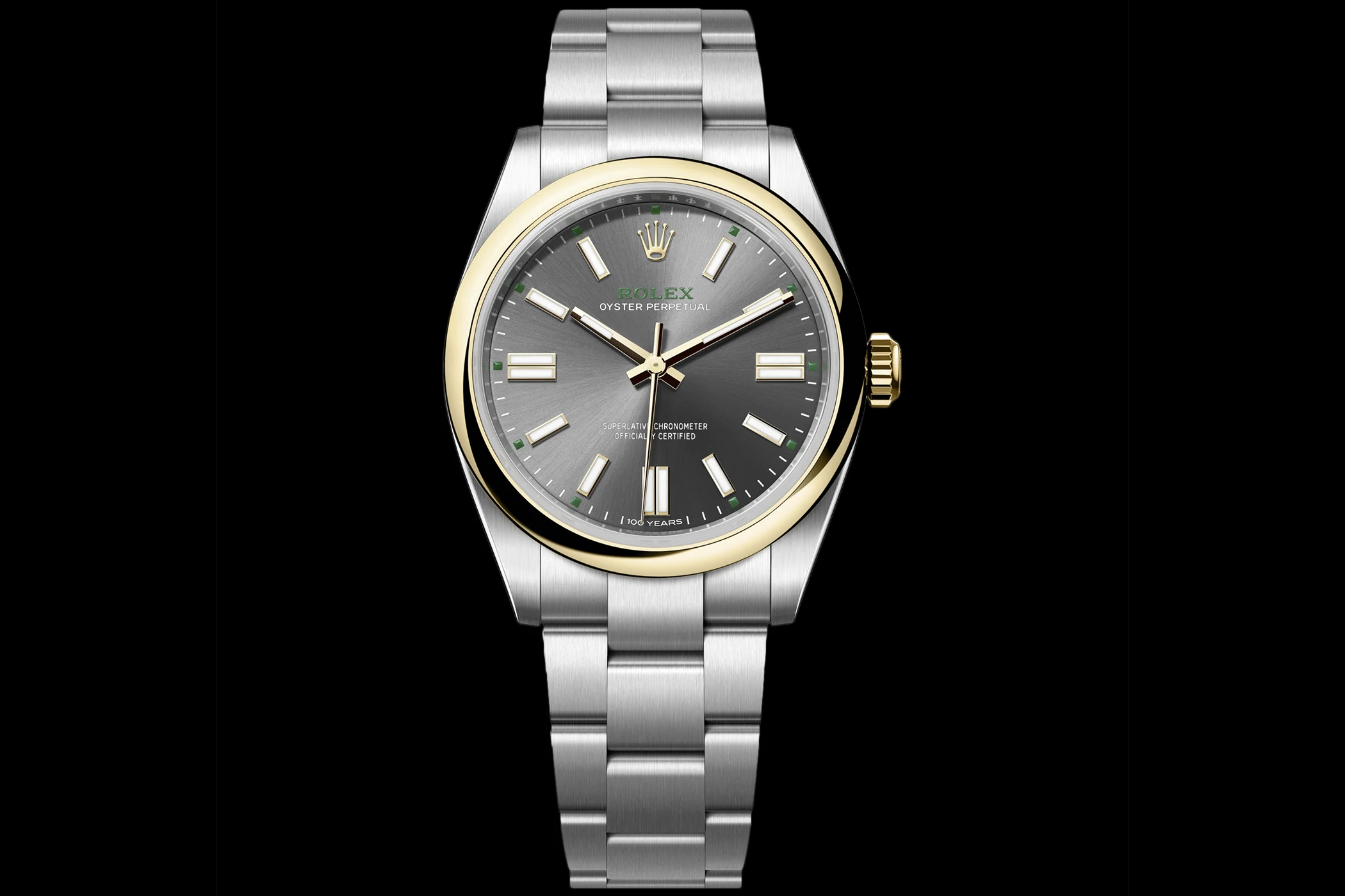 Die vielleicht wichtigste Version innerhalb dieser Familie ist die neue Oyster Perpetual 41 in Rolesor gelb. Allein das ist schon ziemlich außergewöhnlich, denn die Kombination aus Edelstahl Oystersteel und Gelbgold hielt bislang in dieser Form keinen Einzug in die aktuelle Oyster-Perpetual-Linie. Rolex kombiniert hier eine Lünette und Aufzugskrone in Gelbgold mit einem ansonsten vollkommen stählernen Aufbau. Richtig gelesen, auch die Mittelelemente des Armbands bestehen bei diesem Modell komplett aus Oystersteel. Das schiefergraue Zifferblatt verweist zugleich direkt auf das Jubiläum: Die Krone trägt die Reliefzahl „100“, auf sechs Uhr steht statt „Swiss Made“ nun „100 years“, und auch der grüne Rolex-Schriftzug sowie die grünen Quadrate der Minuterie spielen mit den klassischen Farbcodes der Marke. Es ist eine Uhr, die historisches Pathos erstaunlich kontrolliert in eine für heutige Verhältnisse, angemessene Designsprache übersetzt.