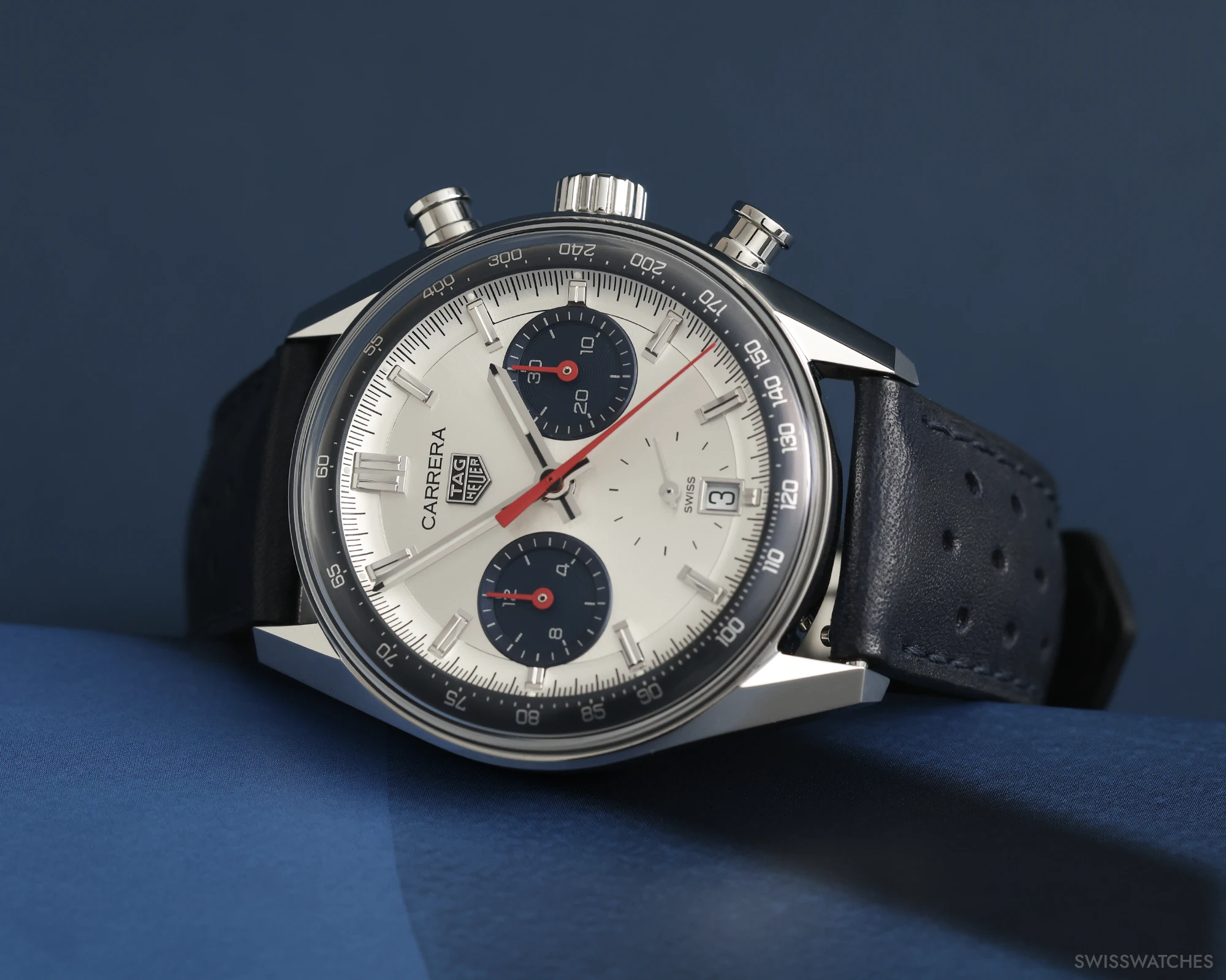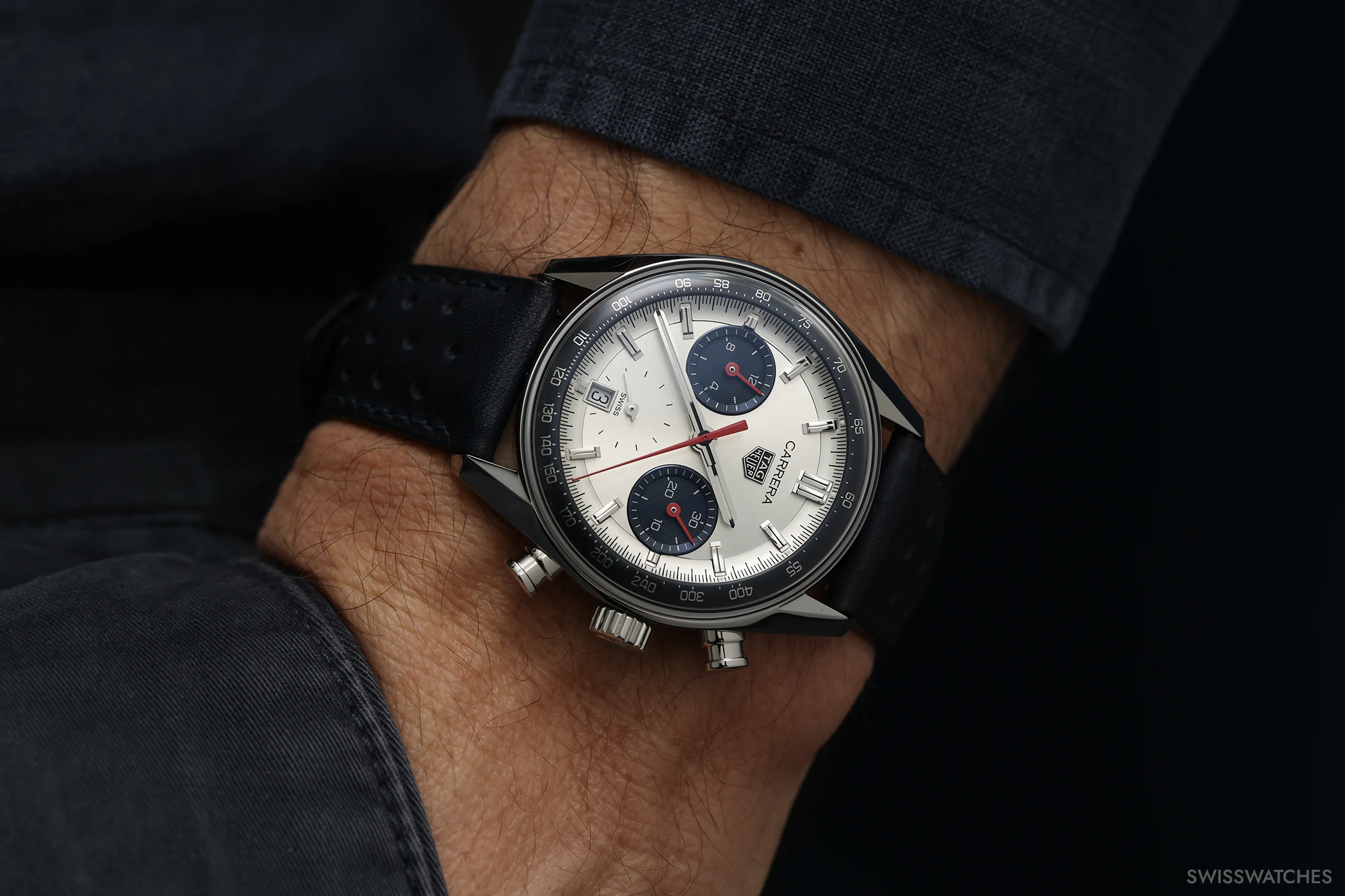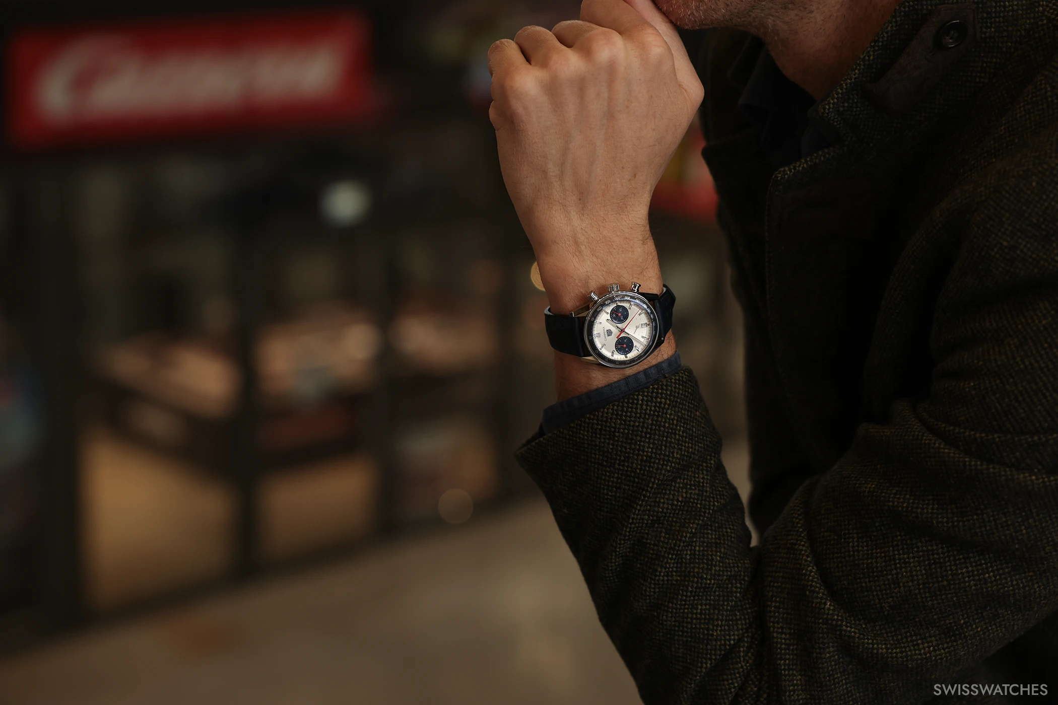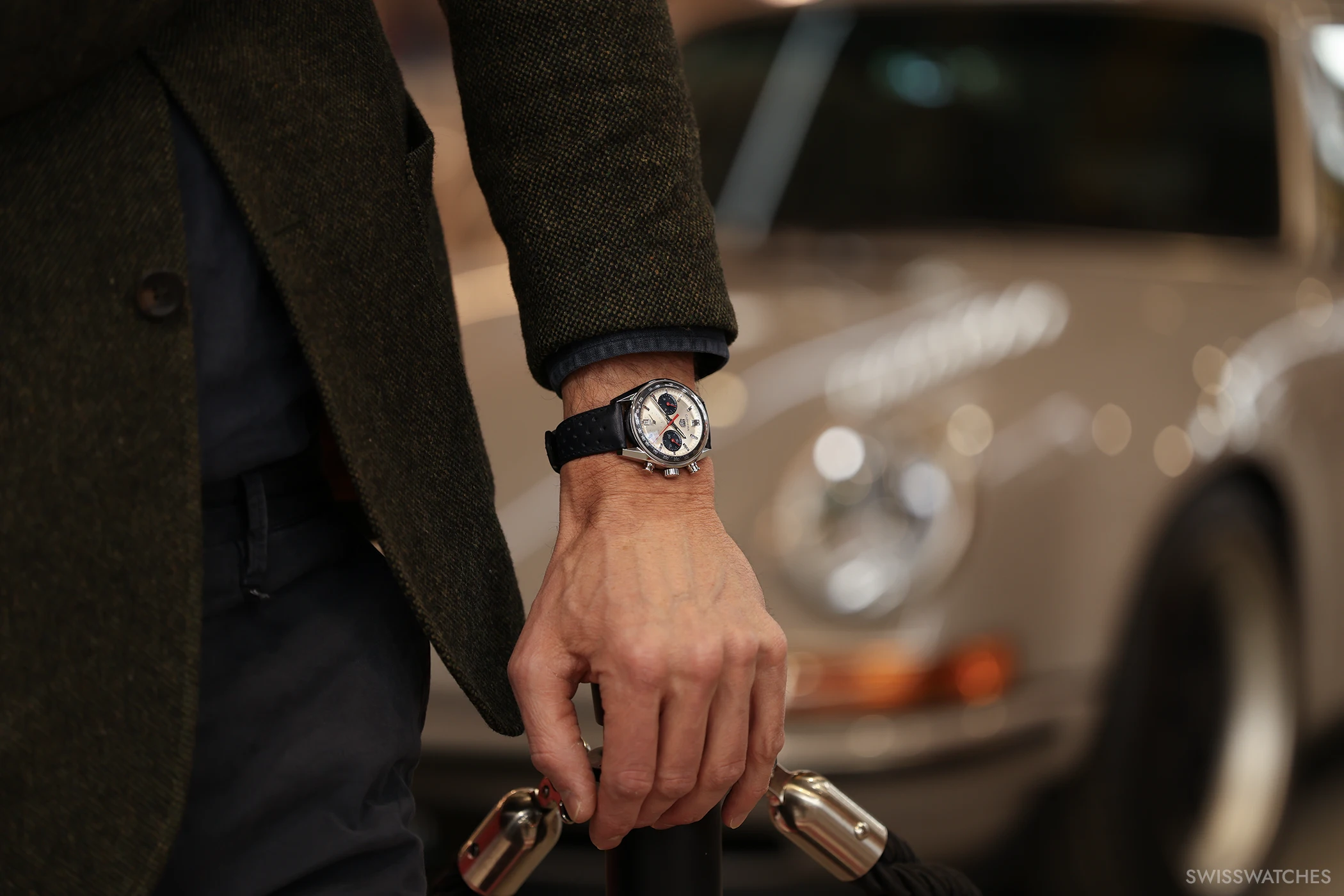 Was Kennern am Wempe-Tag-Heuer-Modell sofort auffällt: Blau-silberne Carrera-Modelle sind in der Geschichte der Uhr extrem selten: Wie Nicholas Biebuck, Heritage Director bei TAG Heuer in seinem wirklich lesenswerten Buch “The Race Never Stops” in einer Übersicht aller historischen Carrera und Pre-Carrera Modelle ausführlich beschreibt, ist blau zu Beginn eine Ausnahmefarbe in der Modellreihe, die eher auf schwarzen, silberfarbenen Elementen basiert: Unter den frühen Pre-Carreras und Carreras findet man sie gar nicht, erst mit der Carrera Chronomatic von 1969 erhält sie Einzug in die Reihe, später dann auch mit dem Kaliber 12 Automatik-Chronographen 1971. 2013 gab es eine Jack Heuer 81 Boutique Edition in Blausilber und dem Kaliber 17, ansonsten sind in jüngster Zeit blaue Modelle vor allem komplett blau und nicht in der für Sammler spannenden Zweifarb-Ausführung mit abgesetzten Totalisatoren erhältlich.