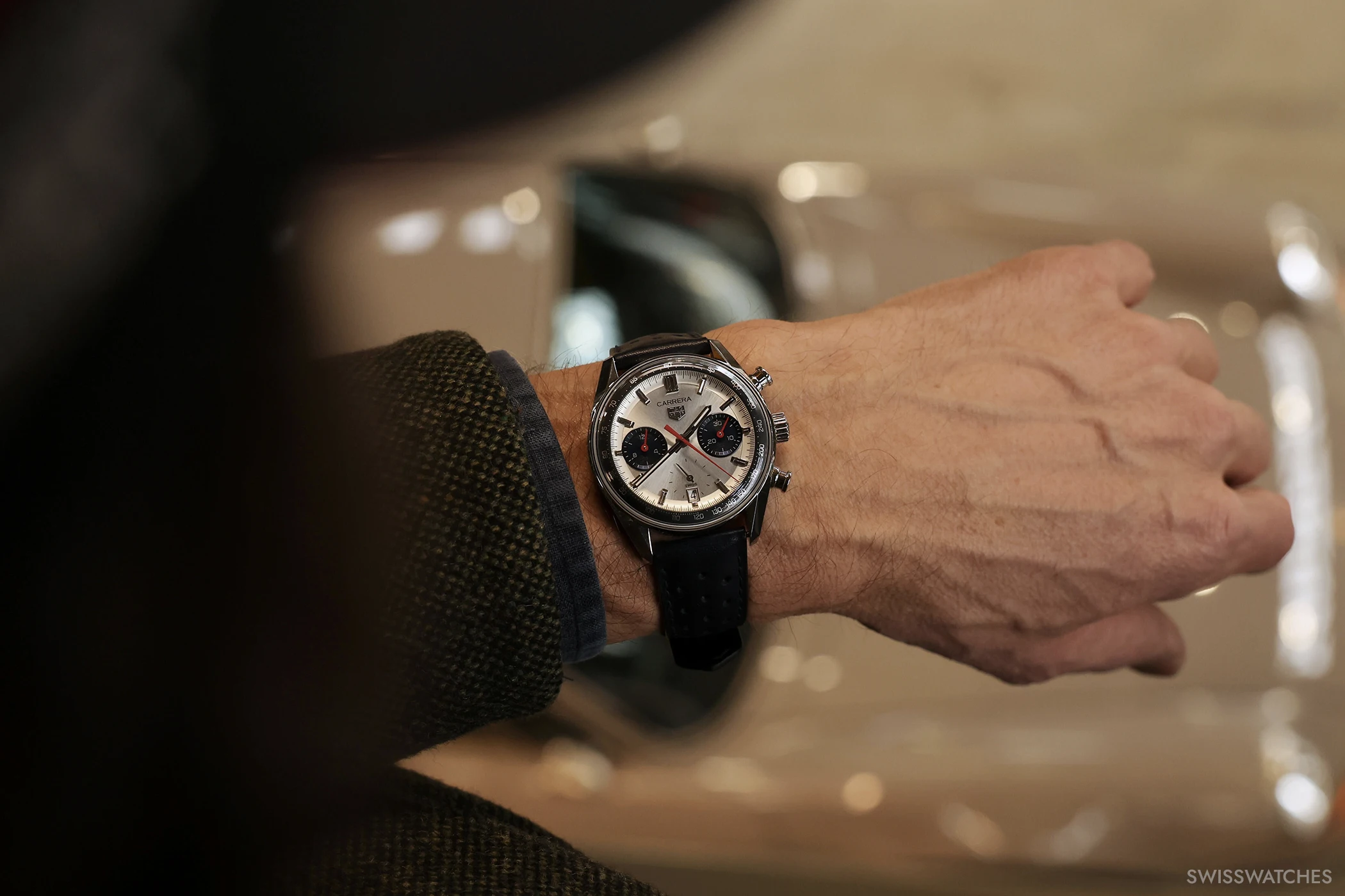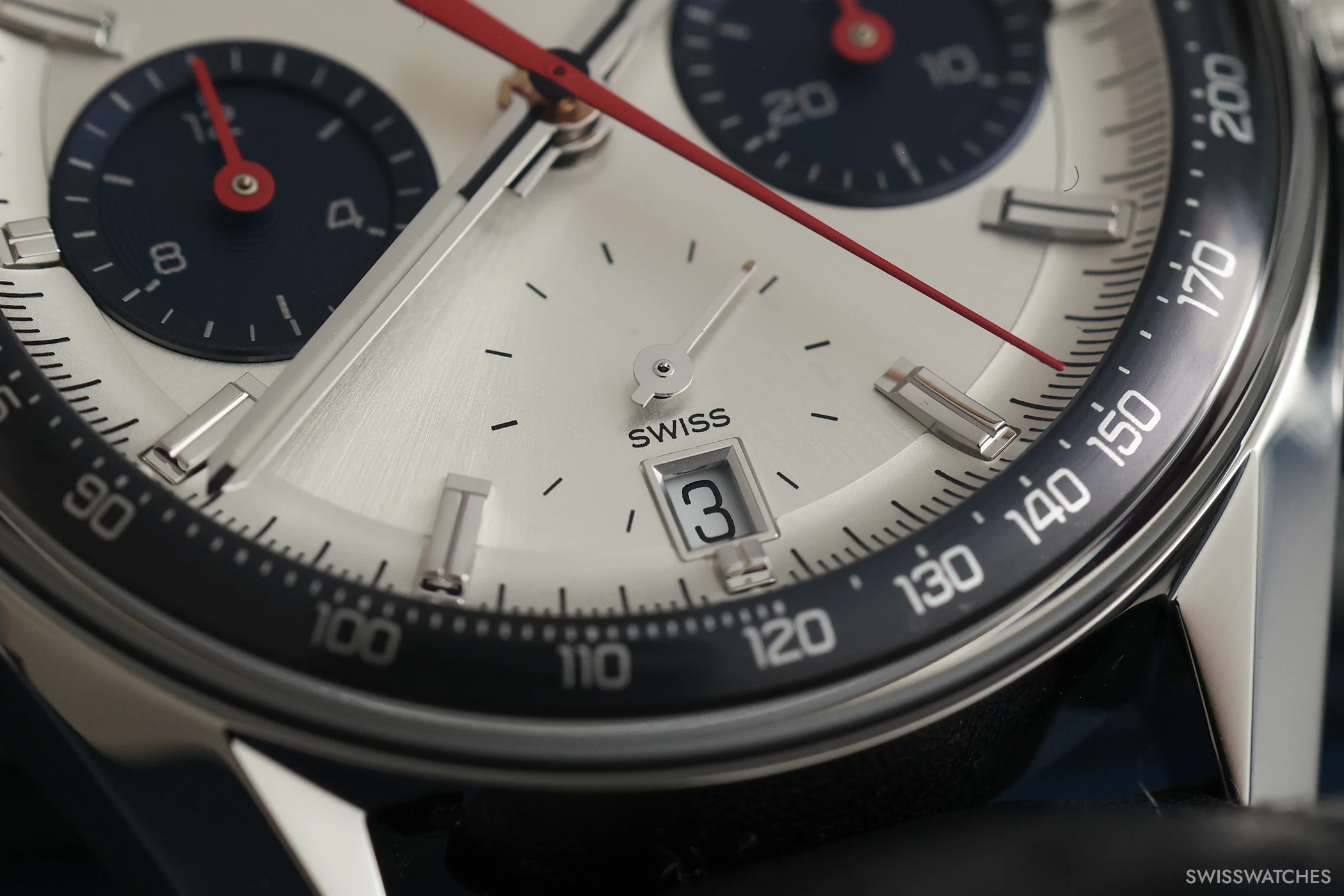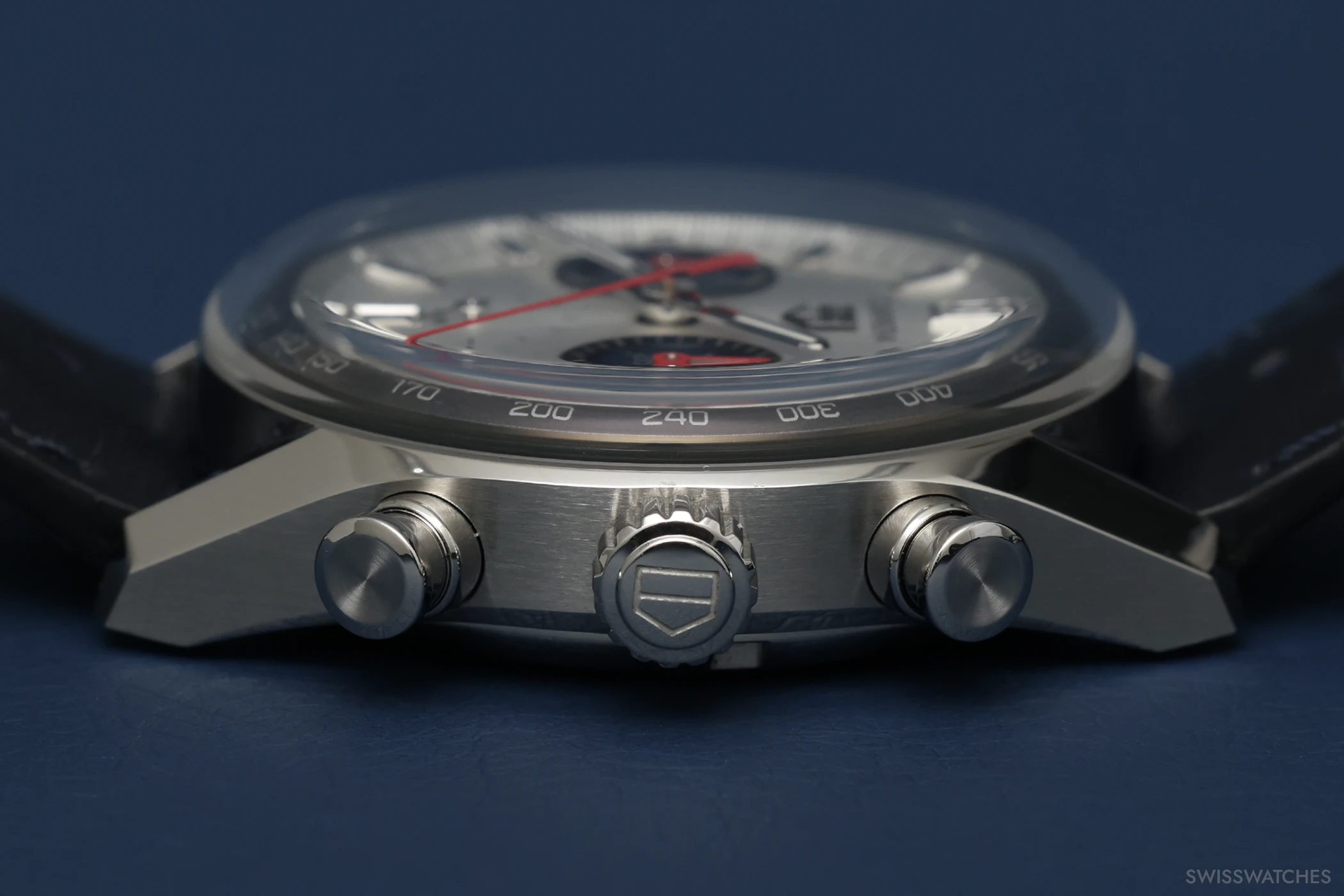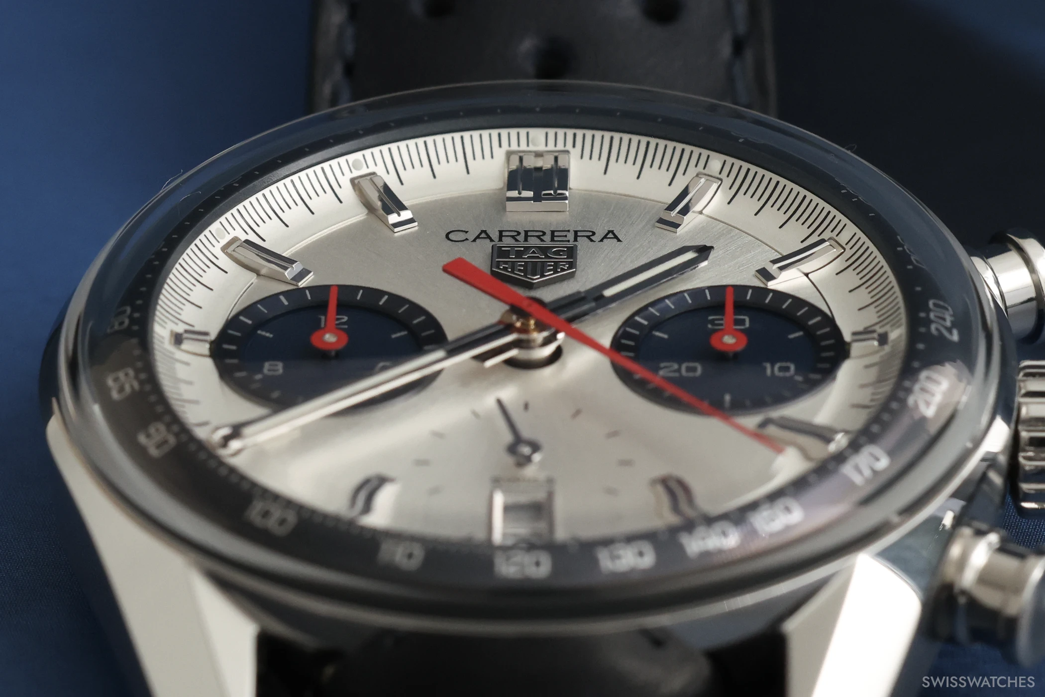 Natürlich ist diese Uhr gestalterisch angelehnt an den wichtigsten Relaunch in der Historie der Uhr: 2023, zum 60. Jubiläum der Carrera, besann man sich bei TAG Heuer zurück auf seine Wurzeln: Mit dem als „Glassbox“ bezeichneten Design kehrte das stark gewölbte Glas ebenso zurück wie die in einen Zifferblattring integrierte Strich-Skala, die schon im ersten 36-Millimeter-Modell von 1963 ebenfalls unter dem Glasrand lag. Was heute Saphirglas ist, bestand damals allerdings noch aus dem Kunststoff Hesalit. Im Gegensatz zur ersten Carrera von 1963 ist allerdings die Sekundenskala einer Tachymeterskala zum Messen von Durchschnittsgeschwindigkeiten gewichen, was nicht nur wegen des größeren Gehäuses Sinn macht, sondern für Motorsportfans fast selbstverständlich im Chronographenbereich ist.