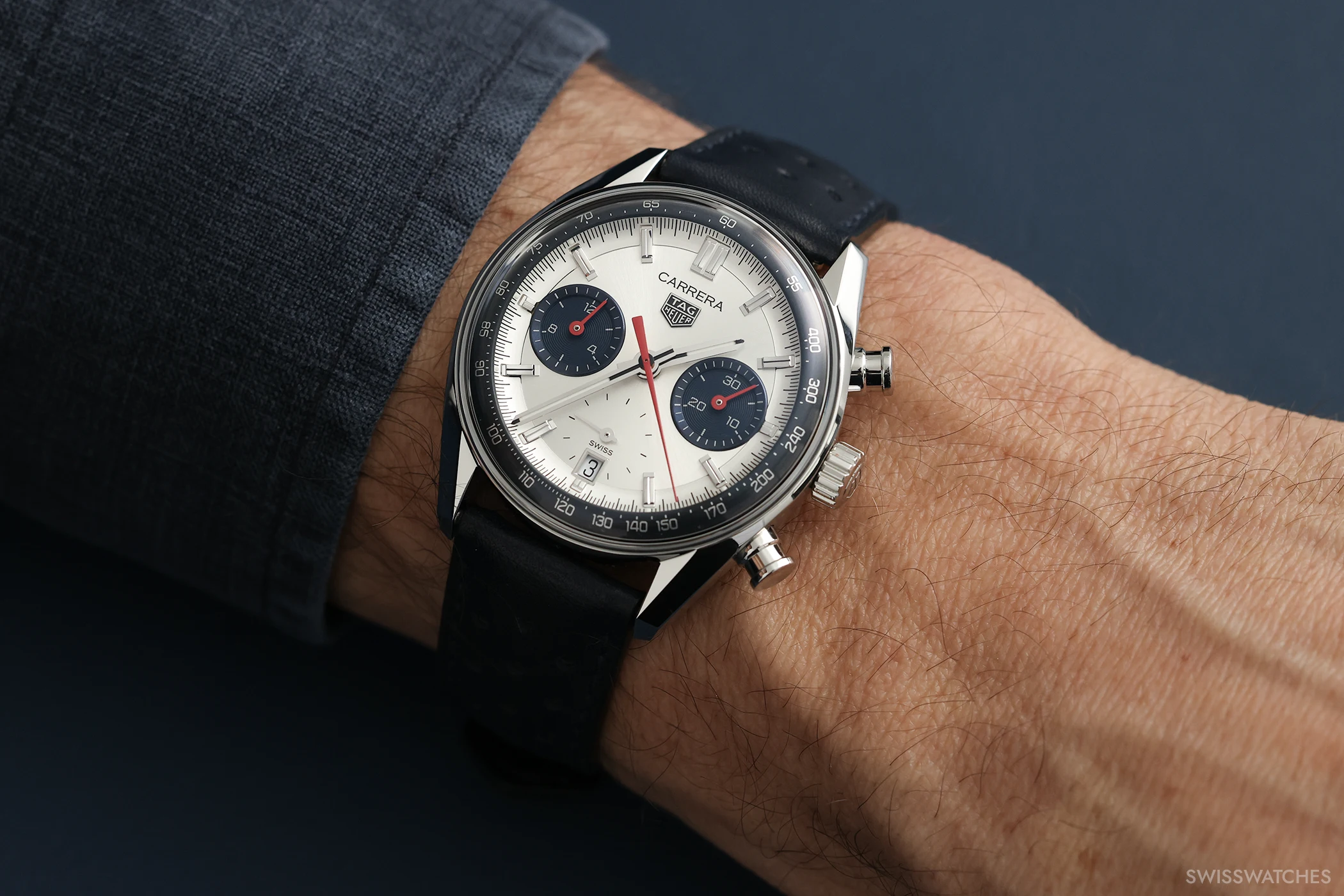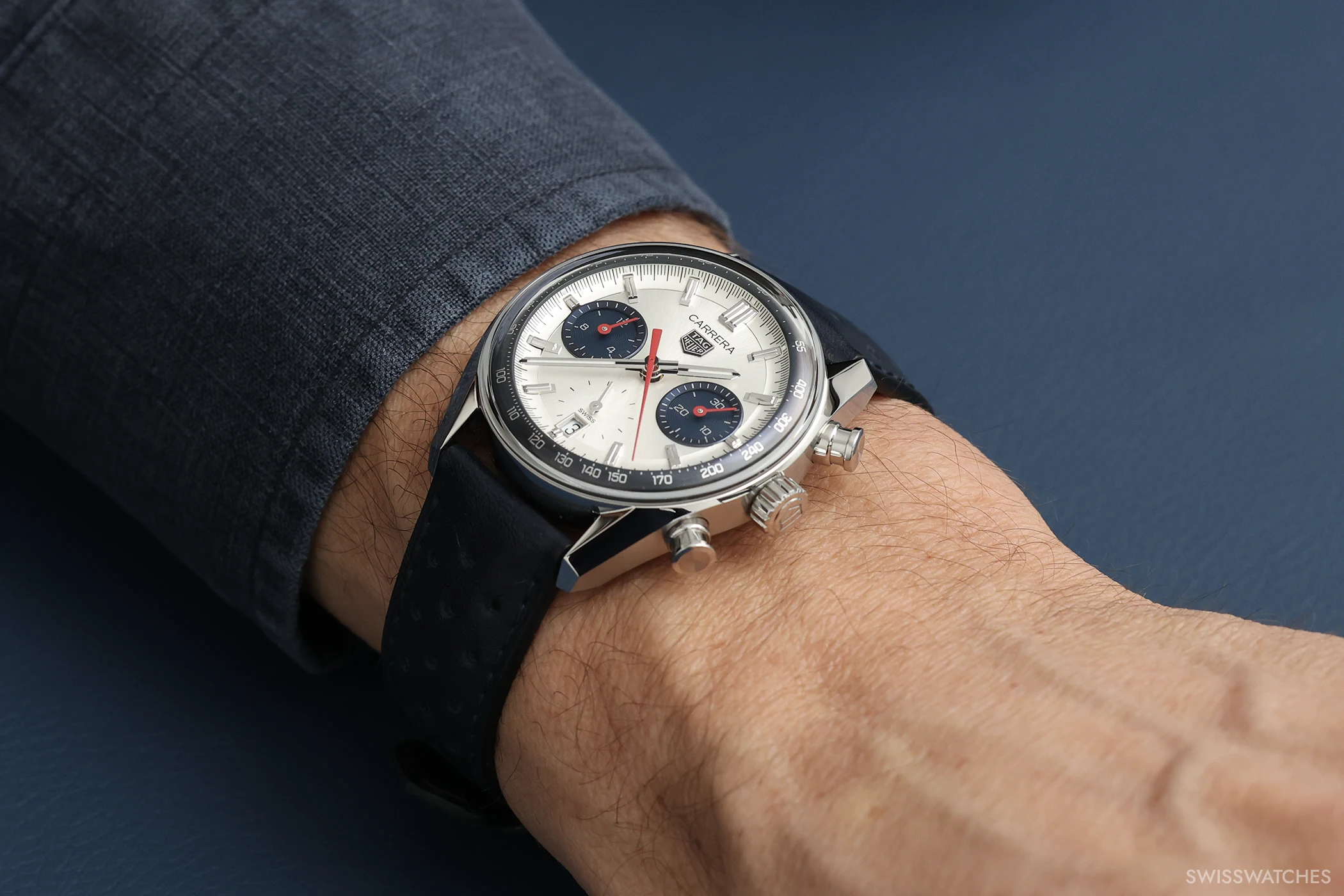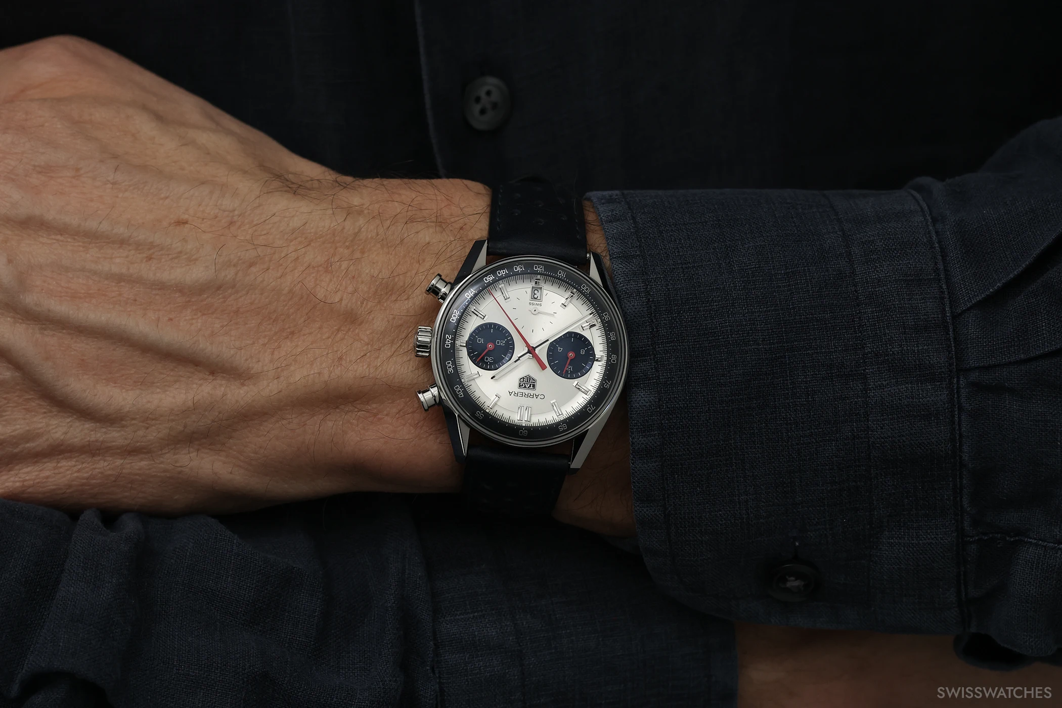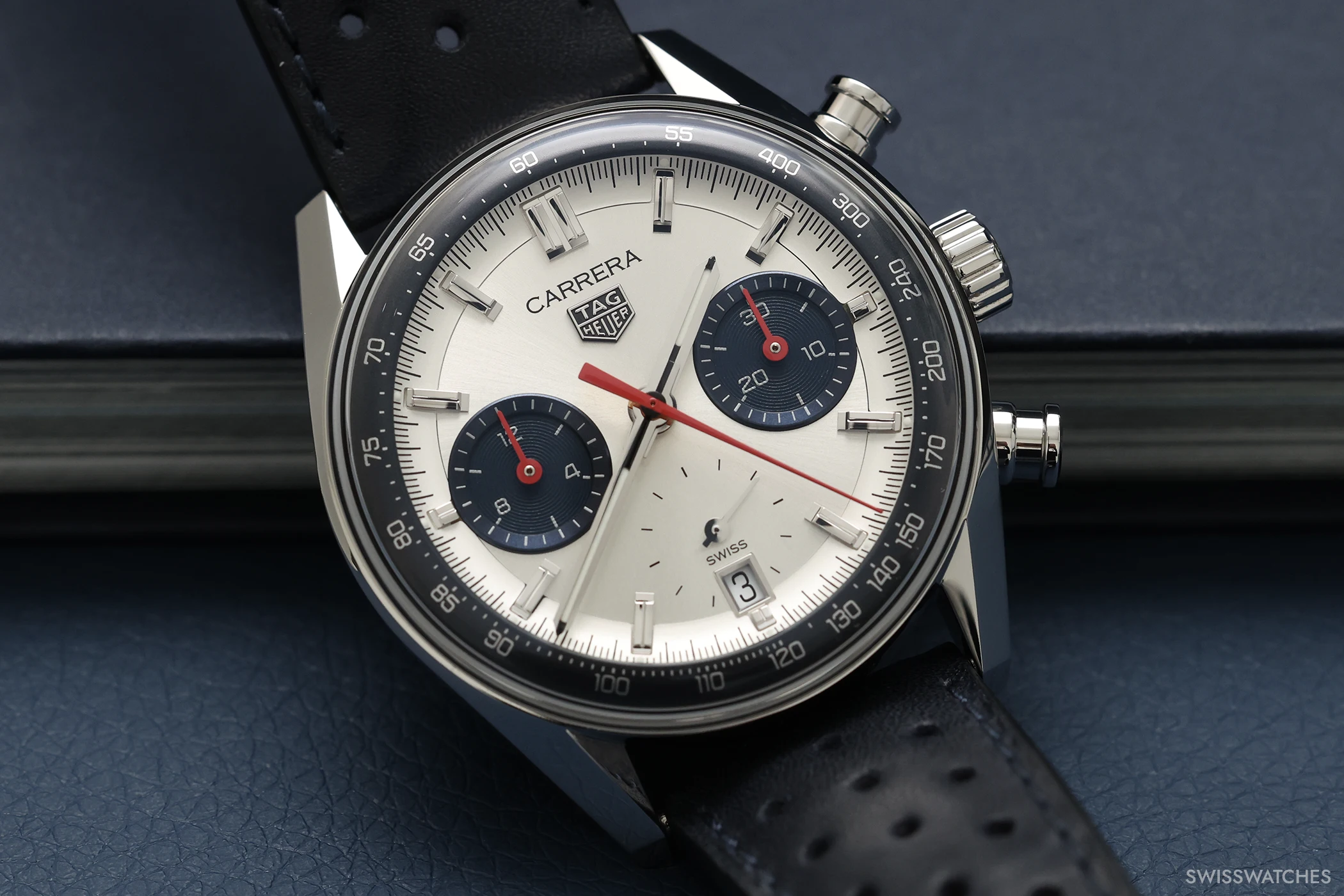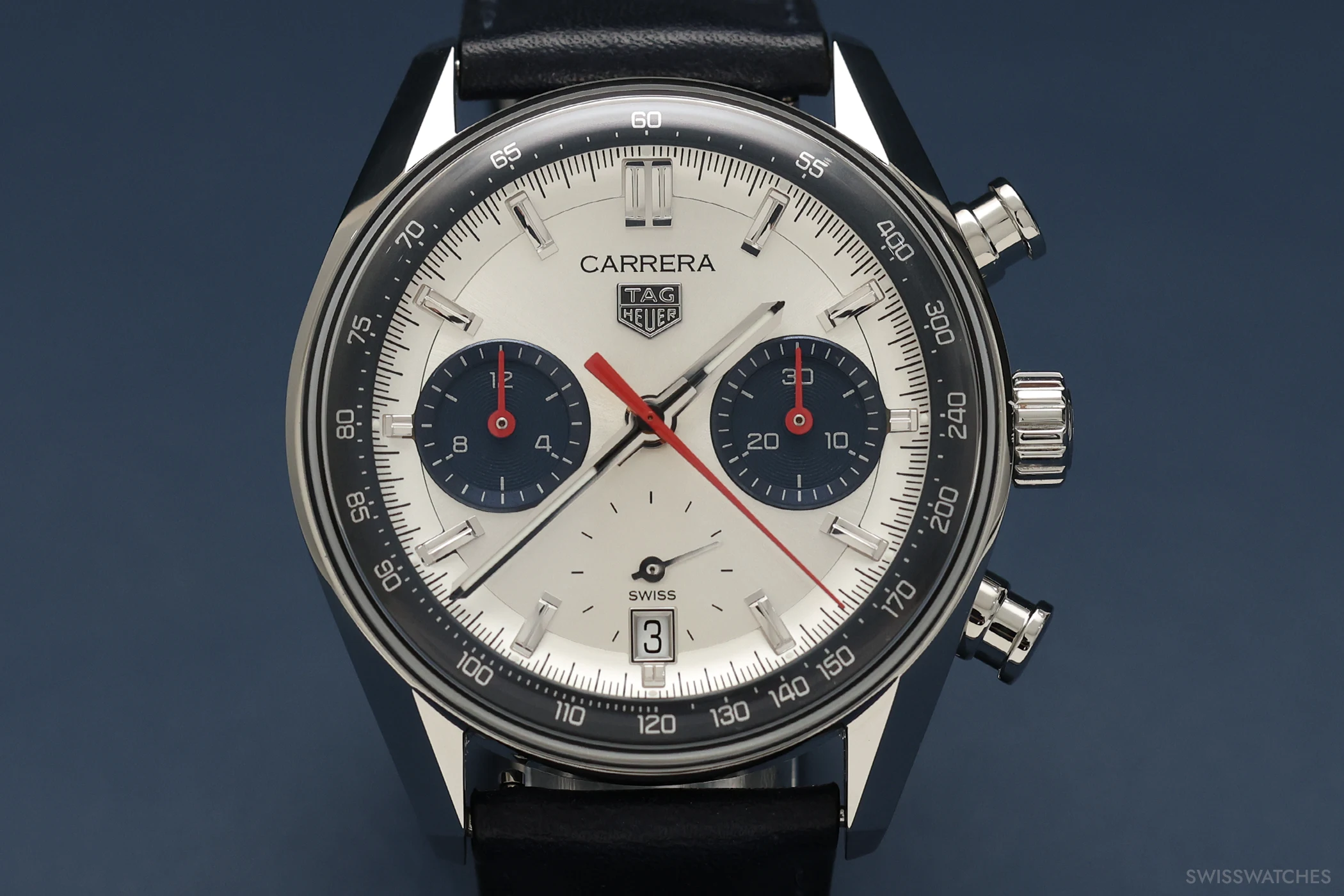 Natürlich ist diese Uhr gestalterisch angelehnt an den wichtigsten Relaunch in der Historie der Uhr: 2023, zum 60. Jubiläum der Carrera, besann man sich bei TAG Heuer zurück auf seine Wurzeln: Mit dem als „Glassbox“ bezeichneten Design kehrte das stark gewölbte Glas ebenso zurück wie die in einen Zifferblattring integrierte Strich-Skala, die schon im ersten 36-Millimeter-Modell von 1963 ebenfalls unter dem Glasrand lag. Was heute Saphirglas ist, bestand damals allerdings noch aus dem Kunststoff Hesalit. Im Gegensatz zur ersten Carrera von 1963 ist allerdings die Sekundenskala einer Tachymeterskala zum Messen von Durchschnittsgeschwindigkeiten gewichen, was nicht nur wegen des größeren Gehäuses Sinn macht, sondern für Motorsportfans fast selbstverständlich im Chronographenbereich ist.