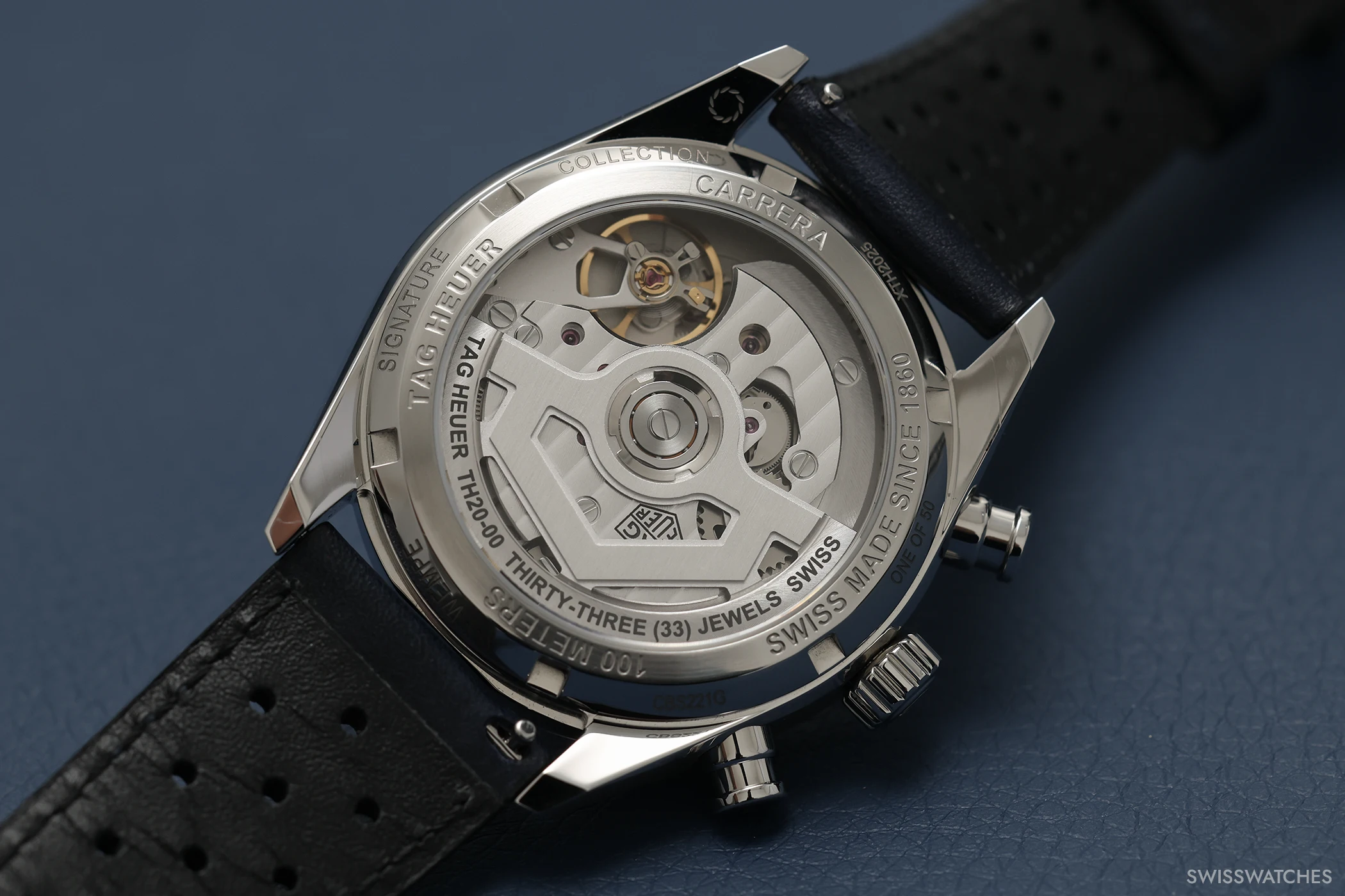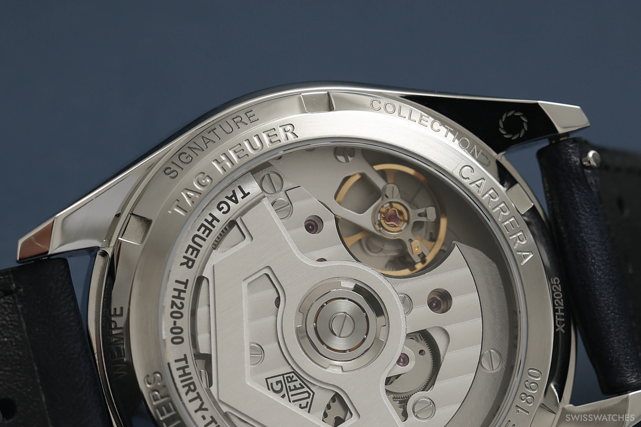 Das mechanische Chronographenwerk TH20-00 überarbeitete vor drei Jahren die von Cartier zu TAG Heuer gewechselte Ausnahme-Chefuhrmacherin Carole Forestier. Das damalige Kaliber Heuer 02 Automatik mit 80 Stunden Gangreserve, Achtelsekunden-Stoppgenauigkeit, Schaltradsteuerung und Schwingtrieb-Kupplung wurde dank des neuen bidirektionalen Aufzugs optimiert. Durch den Glasboden ist der Anblick des Werkes nun auch noch schöner: Das Uhrwerk ist hochwertiger veredelt und verfügt über einen neuen, skelettierten Rotor, der in Form des TAG-Heuer-Wappens gestaltet ist.