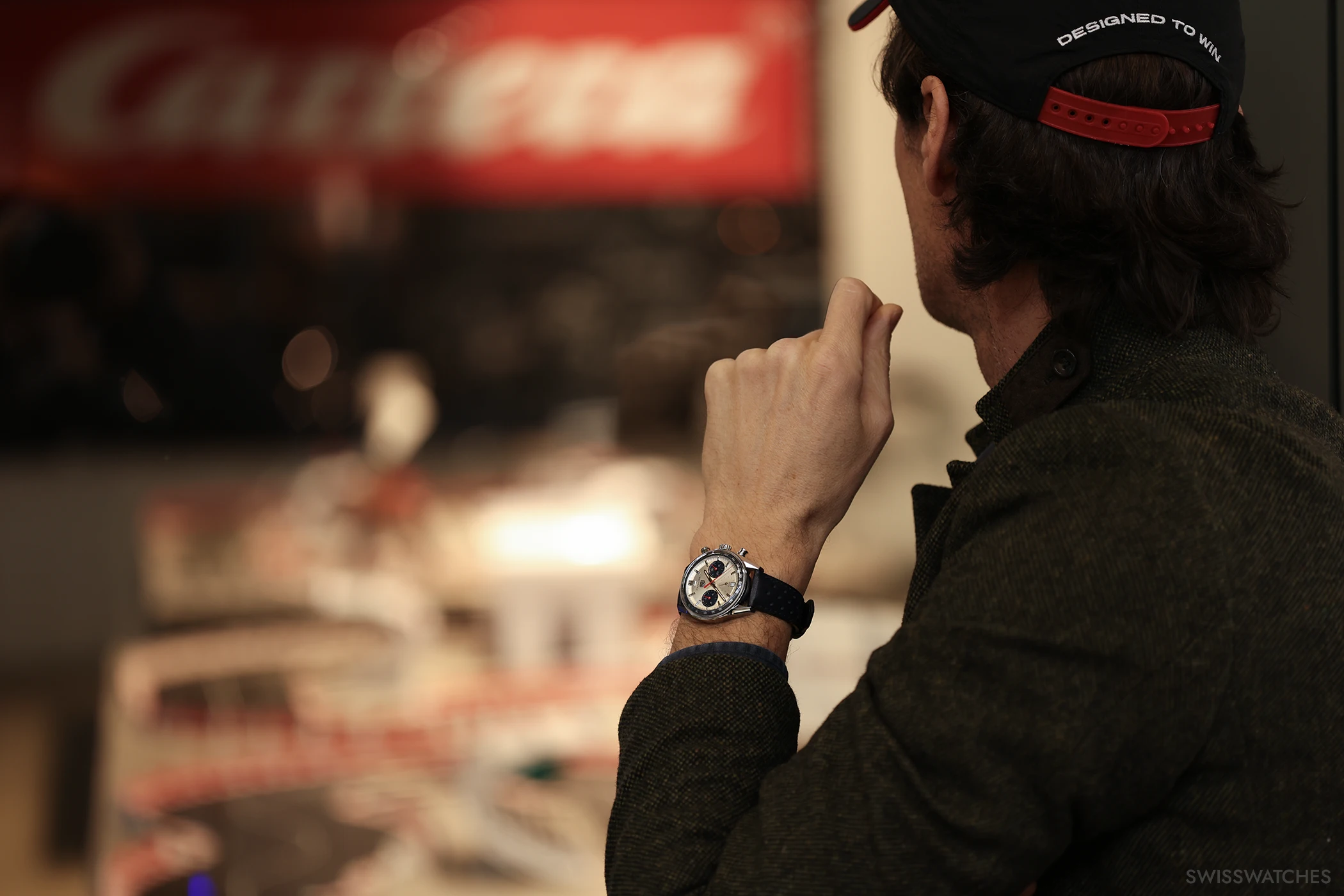 Denn der Armbandchronograph hat sich ebenso in die Geschichte des Motorsports eingebrannt wie Reifenabrieb in den Asphalt bei Formel-1-Rennen. Bereits 1969 war das Logo der Marke erstmals auf einem Formel-1-Auto zu sehen, als Rennfahrer Jo Siffert mit Heuer-Uhren unterwegs war – lange bevor offizielle Sponsorenverträge üblich wurden. Steve McQueen machte 1971 sein Rennfahrervorbild Siffert, der viel zu früh verstarb, im Film Le Mans mit Rennanzug und Heuer-Logo unsterblich.