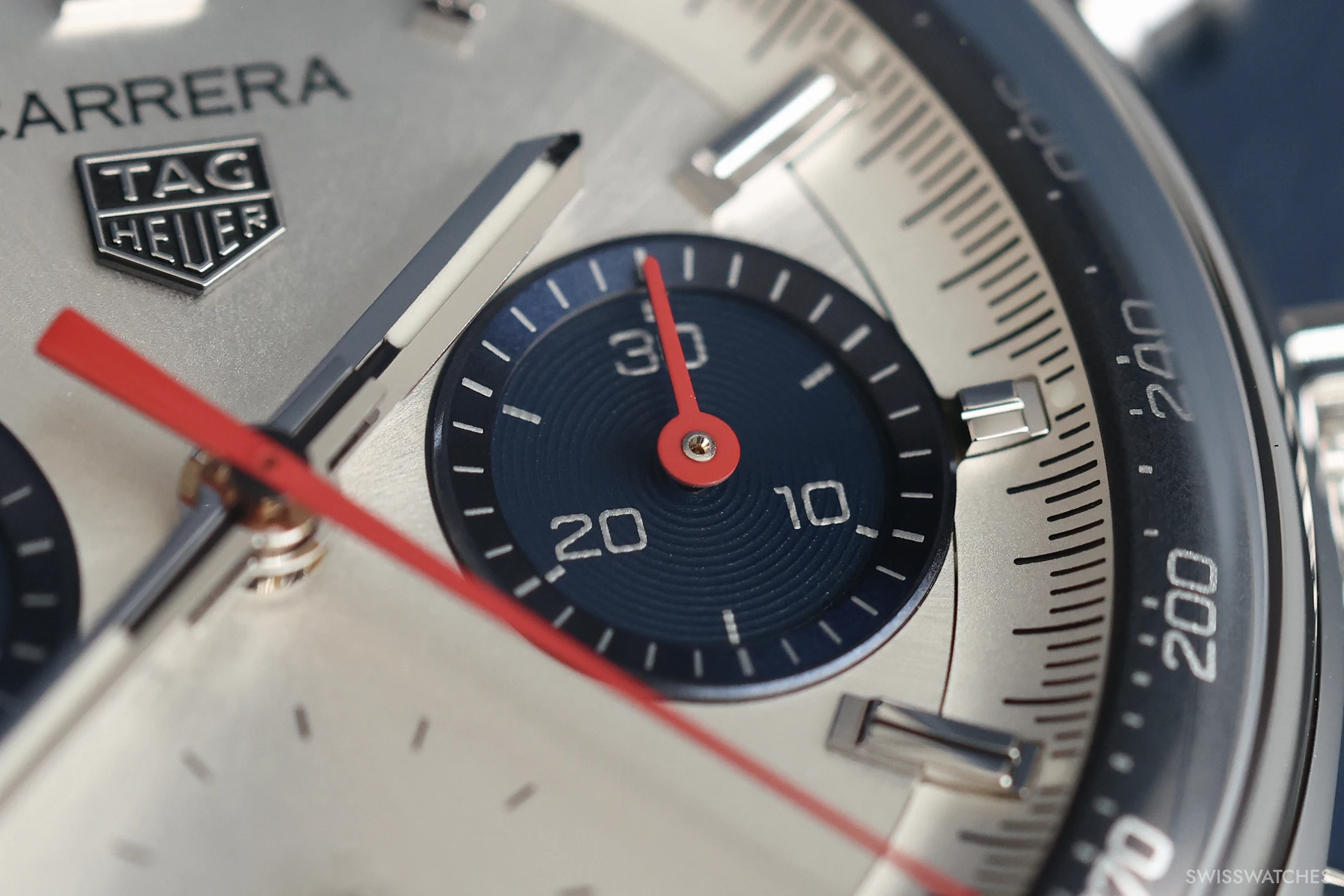 Und natürlich war die berühmte Referenz 2447 S 1a, die erste Armbanduhr mit dem Carrera-Logo, mit dem Kaliber Valjoux 72 ein Handaufzugschronograph ohne Datumsanzeige und kein Automatikchronograph mit Datum wie im aktuellen Modell. Desweiteren hat Wempe die Ablesbarkeit der Chronographenfunktion deutlich und elegant einfach erhöht: Die Sekunden- und Tachymeterskala sowie die beiden Totalisatoren bei 3 Uhr und 9 Uhr zum Ablesen der gestoppten Stunden und Minuten sind blau abgesetzt, die kleine Sekunde bei 6 Uhr ist dagegen wie das Zifferblatt in Silber gehalten, um nicht den Anschein zu Erwecken, dass sie etwas mit der Zeitanzeige zu tun hat, da die Stoppsekunde aus dem Zentrum der Uhr erfolgt. So ergeben sich auch logisch die rot angelegten Zeiger fürs Stoppen und die silbernen für die Zeitmessung. Es sind diese Details, die Sammler und Fans der präzisen Zeitmessung sicher sehr schätzen werden.