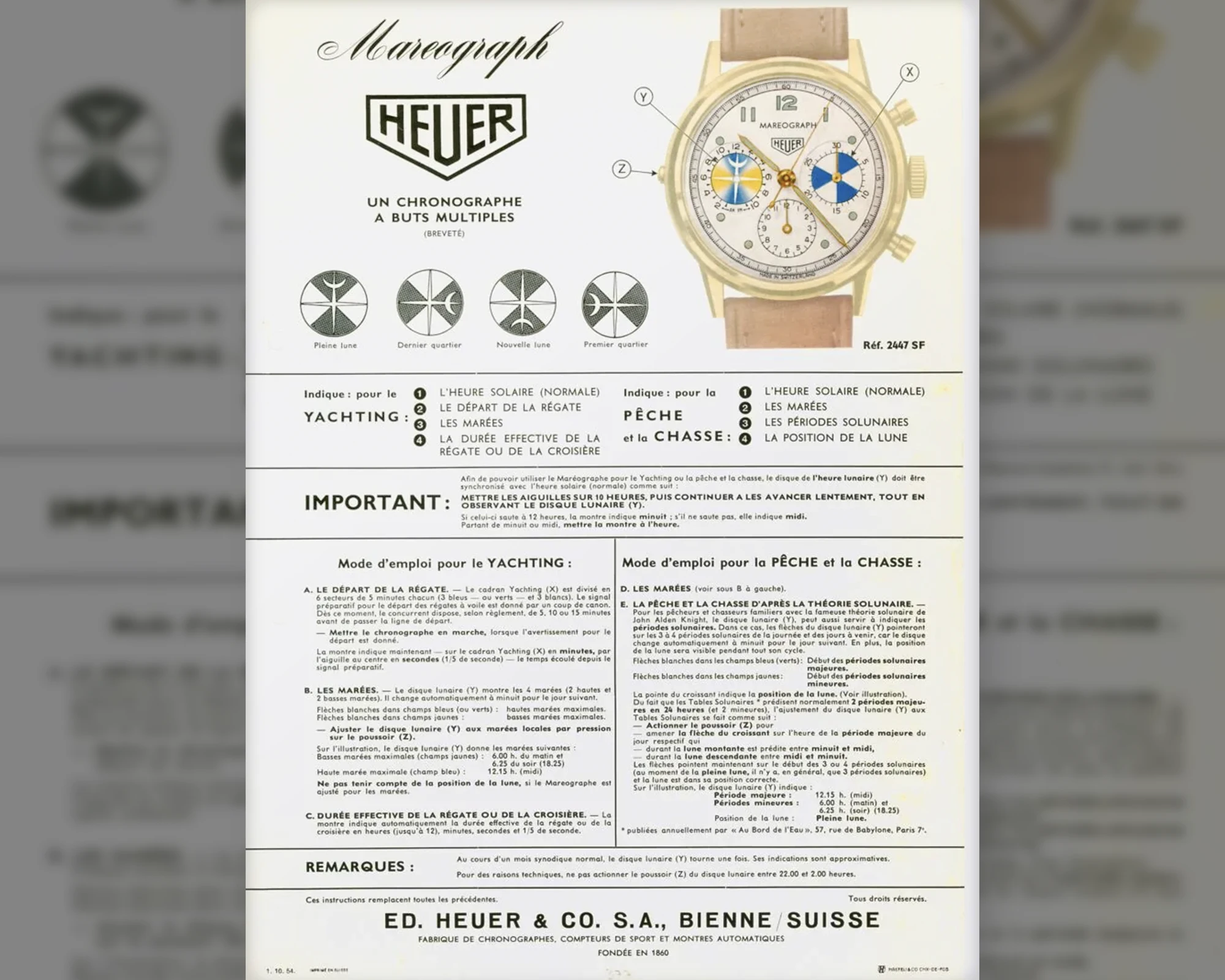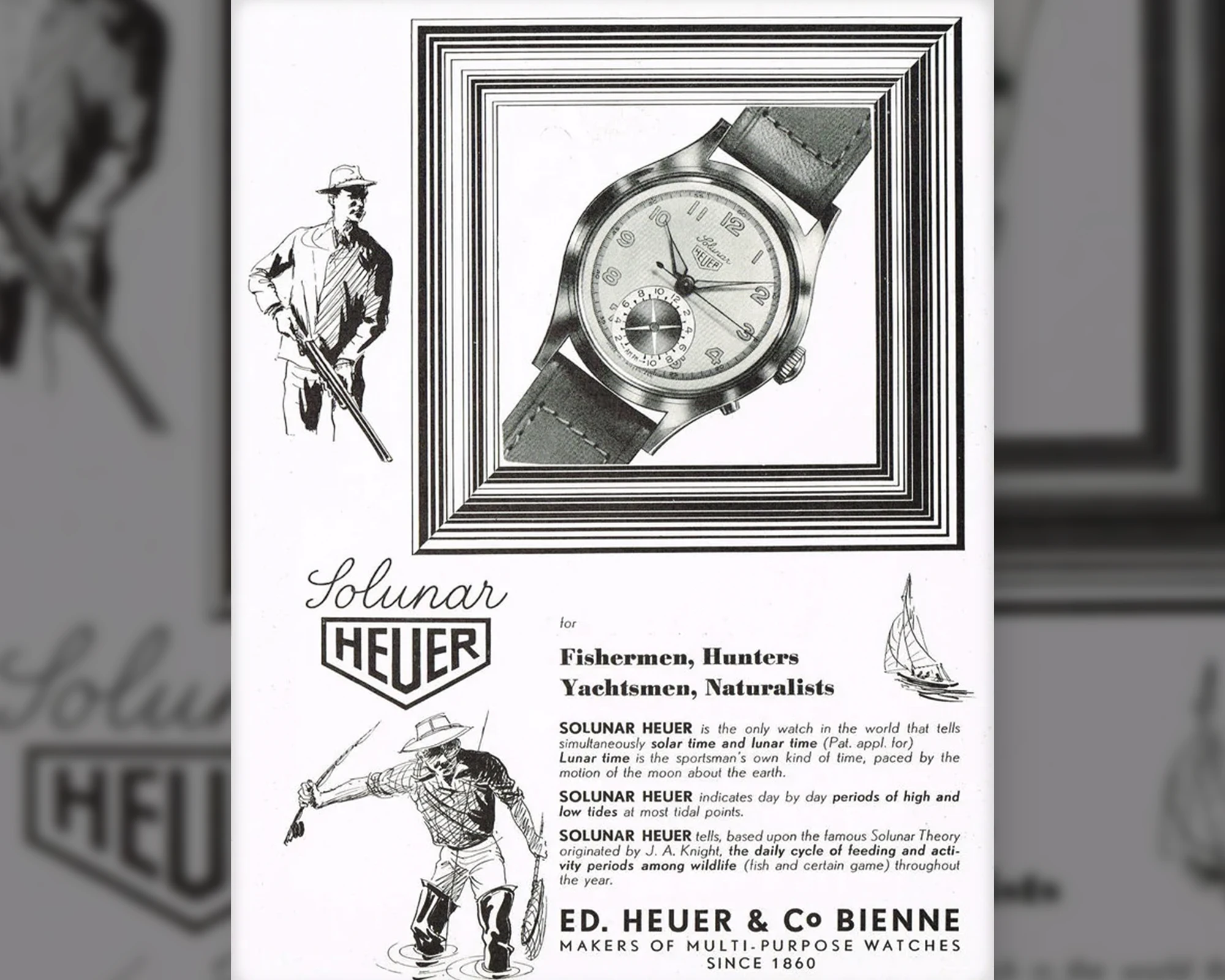 Mit ihrer ungewöhnlichen Anzeige legte die Solunar den Grundstein für einen Zeitmesser, der die Gezeitenanzeige erstmals mit einer Chronographenfunktion verband: den Heuer „Mareograph“, der um das Jahr 1950 erstmals erschien und der nun vorgestellten „Seafarer“ bereits sehr nahe kommt. Die Uhr kombinierte das Gezeitenzifferblatt der Solunar bei 9 Uhr mit einem 12-Stunden-Zähler bei 6 Uhr und einem 30-Minuten-Zähler bei 3 Uhr, der zugleich als Regatta-Zähler fungierte. Durch die Unterteilungen in jeweils fünfminütige Intervalle konnte der Zähler genutzt werden, um den Start von Yacht- oder Bootswettkämpfen zu messen. Das Konzept dieses Chronographen, der von Abercrombie & Fitch unter dem Namen „Seafarer“ und später von Orvis unter dem Namen „Solunagraph“ verkauft wurde – obgleich all diese Modelle von Heuer hergestellt wurden –, gelang im Jahr 2024 erneut zu Ruhm, als er durch die TAG Heuer Carrera Chronograph Seafarer × Hodinkee in einer modernen und auf 968 Exemplare limitierten Wiederaufnahme einen neuen Morgen erlebte.