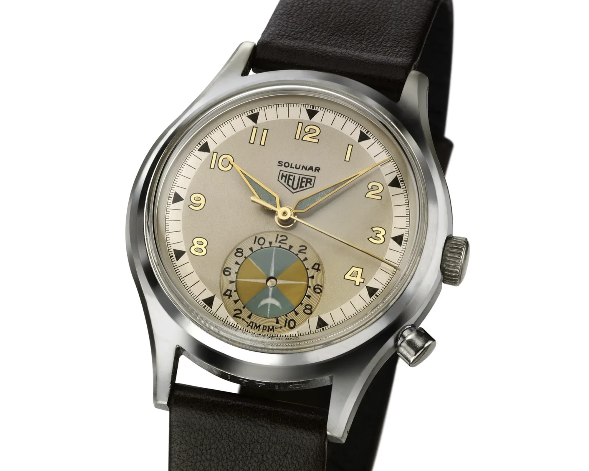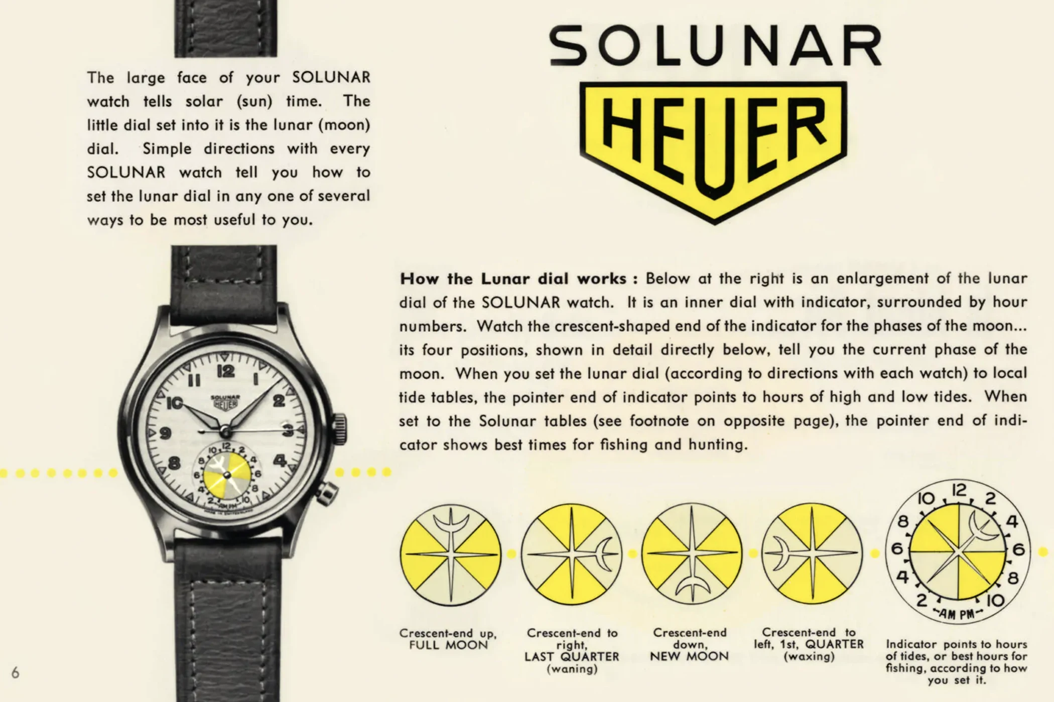Das Ergebnis aus der einstigen Idee Walter Haynes’, der Fertigungsexpertise Heuers und den Berechnungen des Physiklehrers Dr. Heinz Schilt war schlussendlich ein echtes Kuriosum in dem seinerzeit von Chronographen geprägten Produktportfolio Heuers und der Vorreiter der späteren Seafarer: die im Jahr 1949 lancierte Solunar (der Name setzt sich aus „Solar“ und „Lunar“ zusammen) – die erste Uhr überhaupt mit einem Gezeitenanzeiger auf der 6-Uhr-Position.