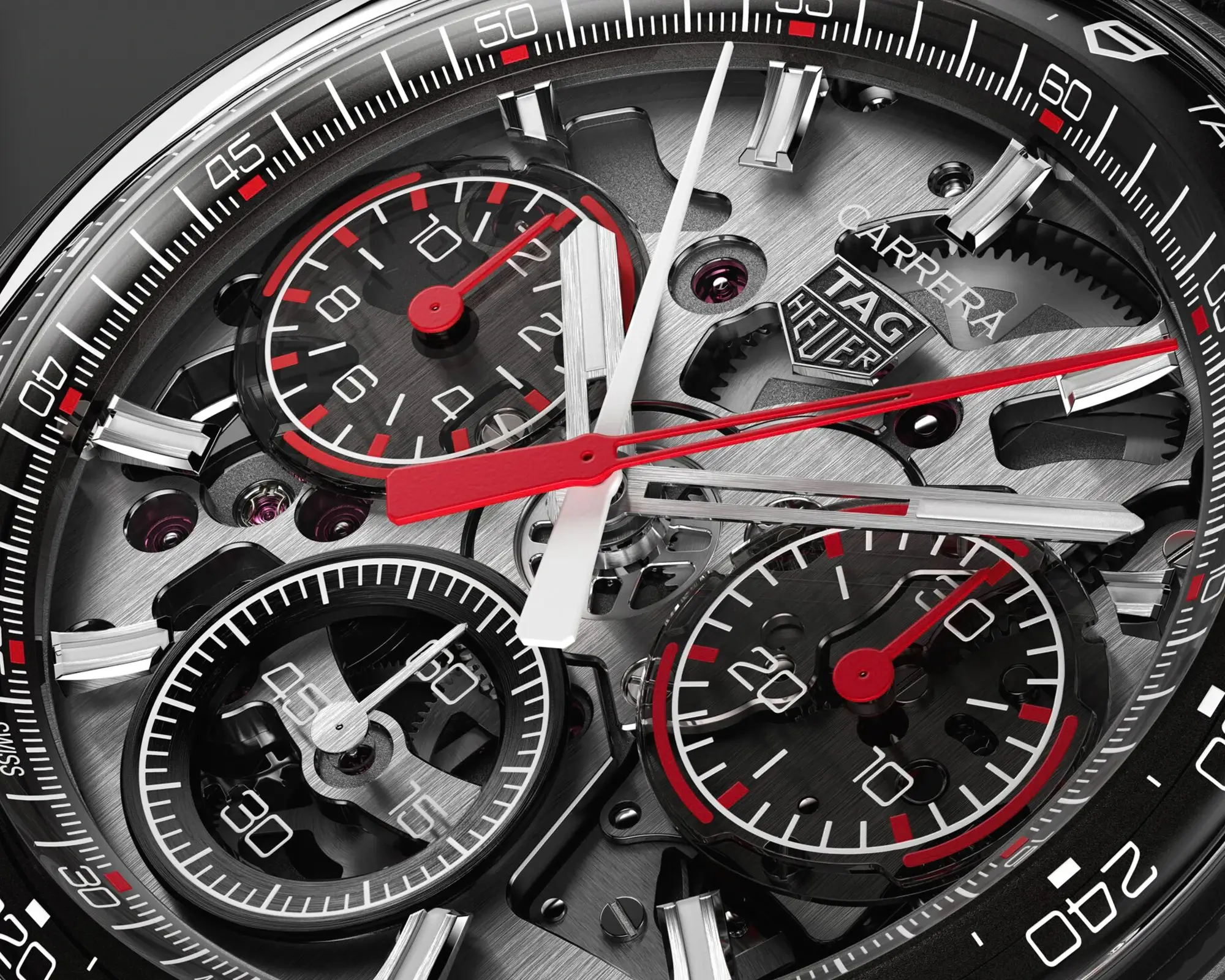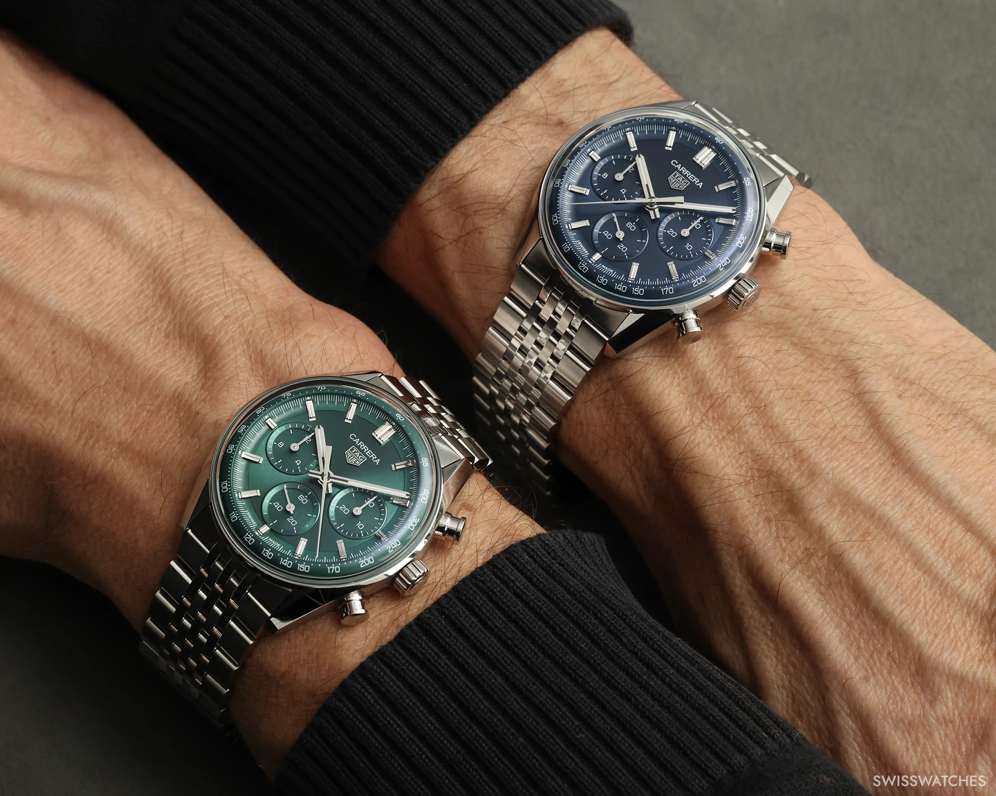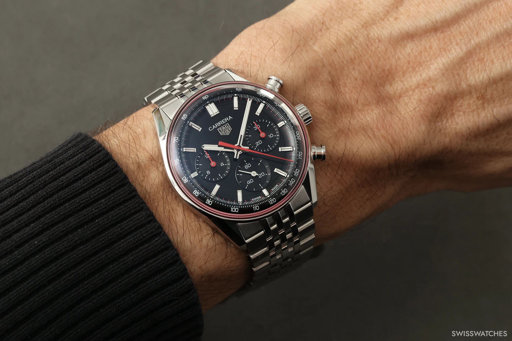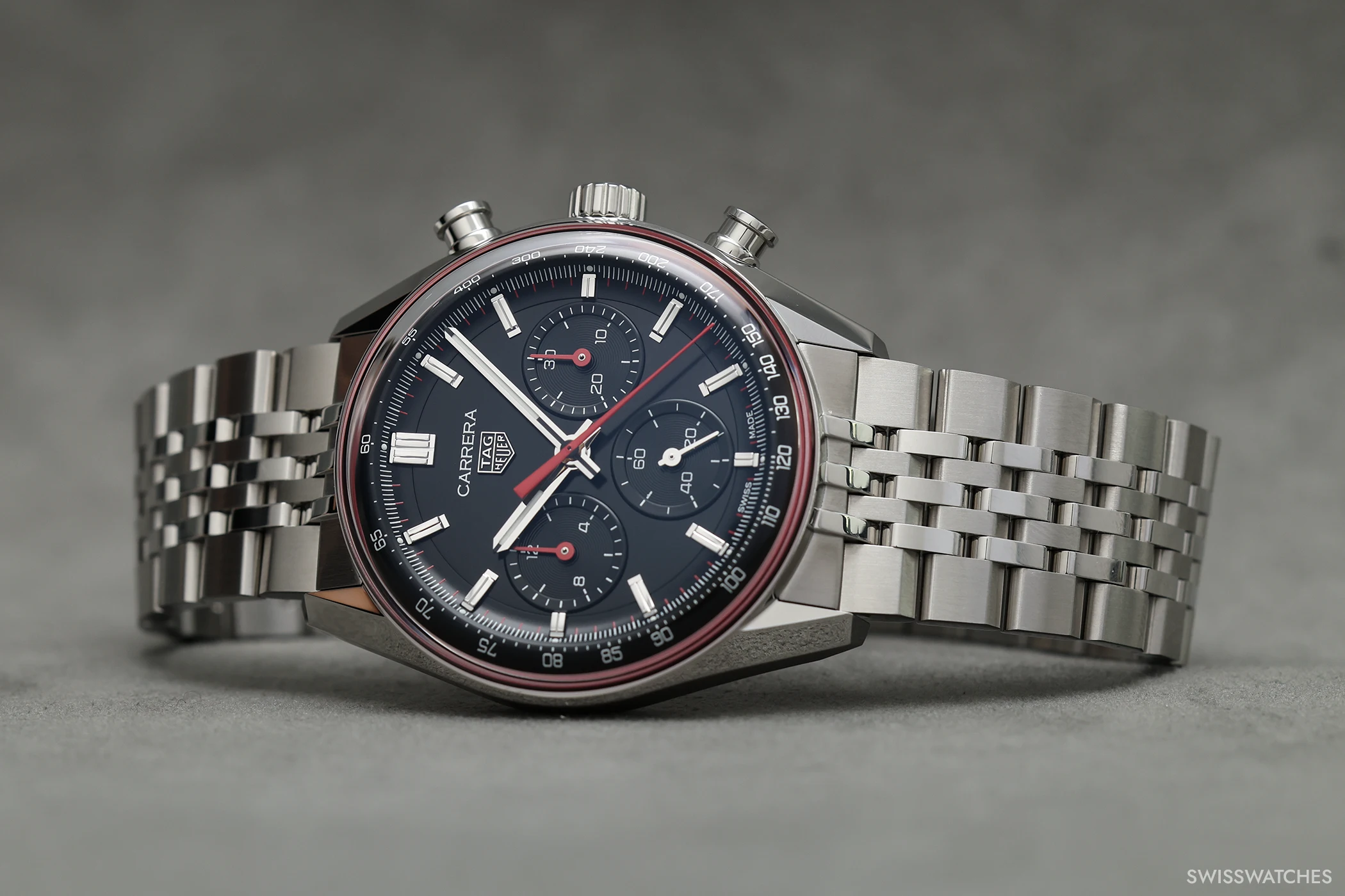 Doch kommen wir von den Gemeinsamkeiten zu dem, was die drei neuen Carrera-Varianten in 41-mm-Gehäusen voneinander unterscheidet: Die blaue sowie die grüne Version setzen auf ein kreisförmig satiniertes Zifferblatt mit ebenfalls vollständig in Blau beziehungsweise Grün ausgeführten Totalisatoren. Beide Modelle präsentieren zudem facettierte Stunden-, Minuten- sowie Chronographensekundenzeiger, die – ebenso wie die applizierten Indizes – vollständig rhodiniert sind. Zudem sind bei beiden Modellen Stunden- und Minutenzeiger mit weißer Super-LumiNova-Füllung versehen, einem Leuchtstoff, der auch bei dunklen Lichtverhältnissen für gute Ablesbarkeit sorgt. Die dritte Variante hingegen verfügt über ein schwarzes Zifferblatt, bei dem die Zeiger des Chronographen-30-Minuten-Zählers sowie des Chronographen-12-Stunden-Zählers zur besseren Unterscheidung ebenso wie der zentrale Chronographensekundenzeiger in einem markanten Rotton ausgeführt sind. Um dem Zifferblatt einen dezenten Rahmen zu geben, zieht sich am Rand des Saphirglases zudem eine rote Kontur entlang.