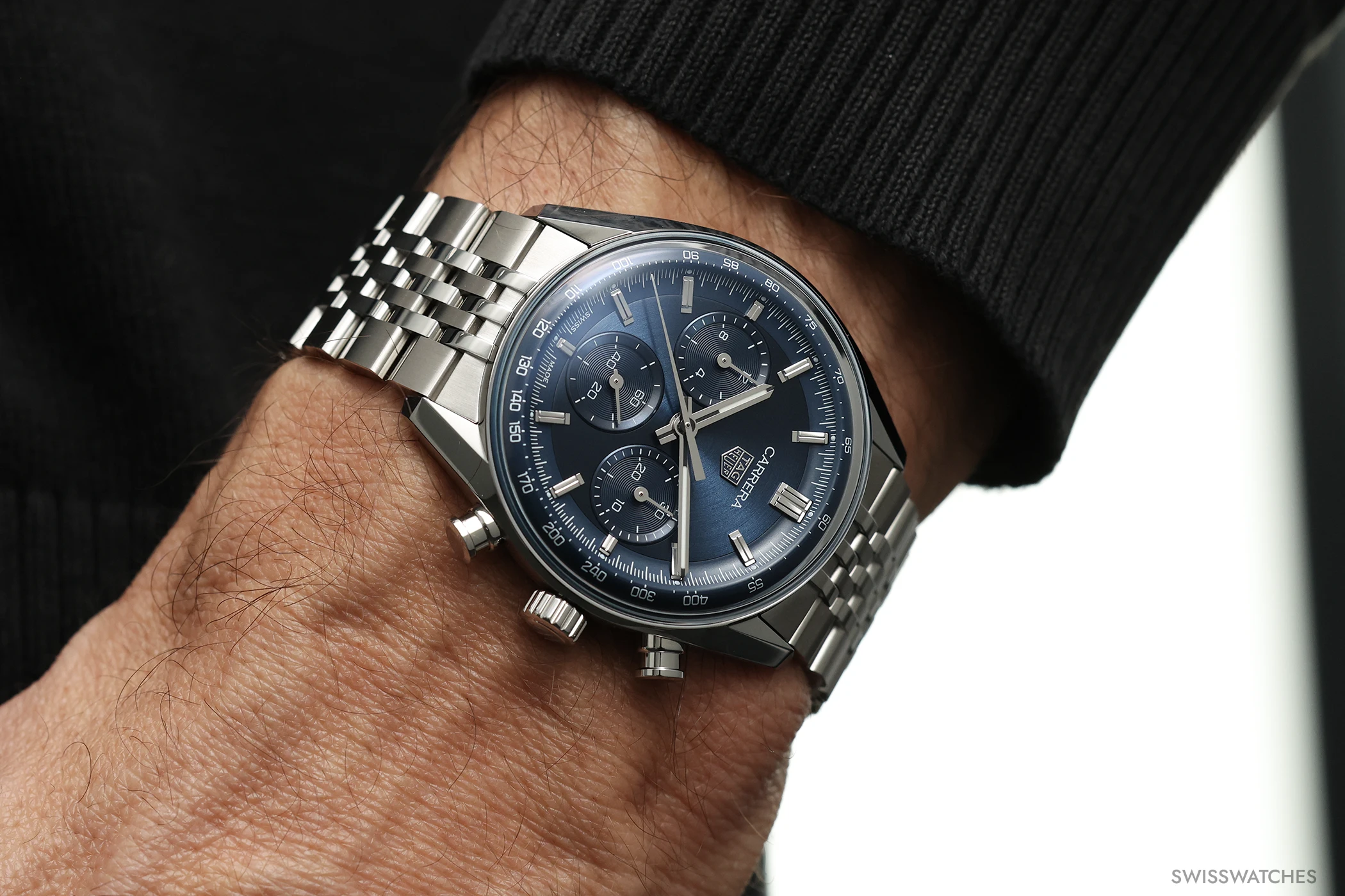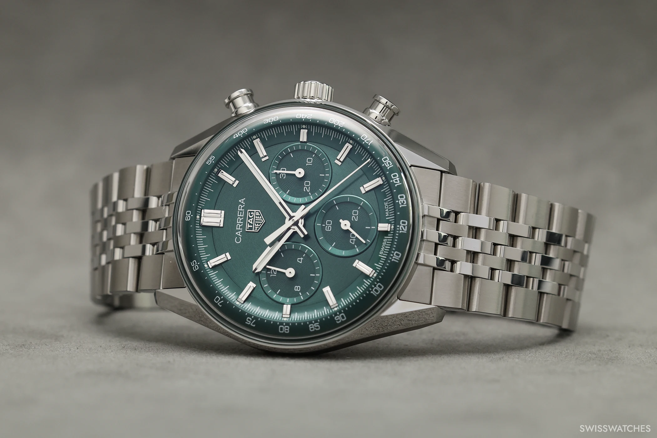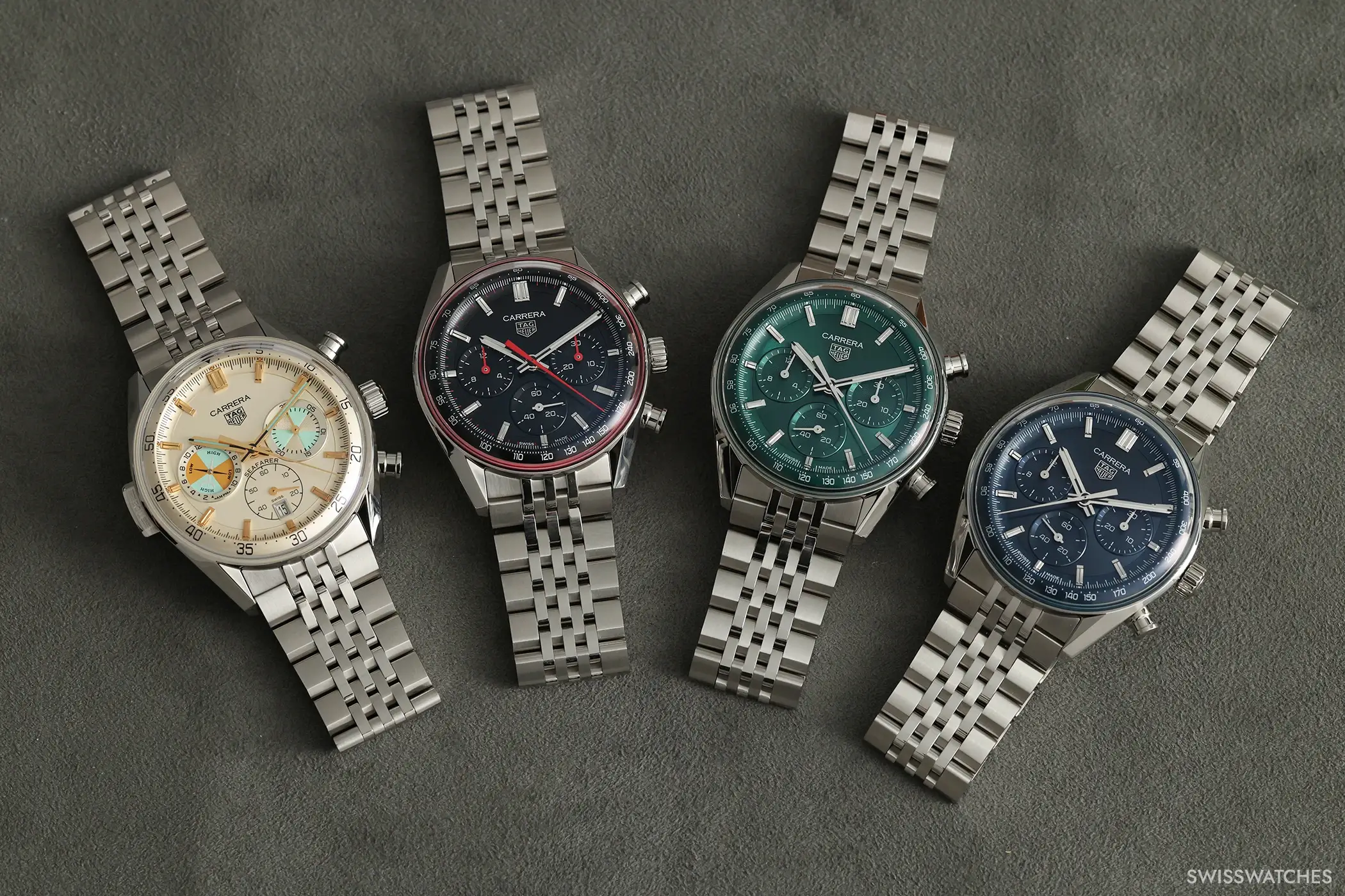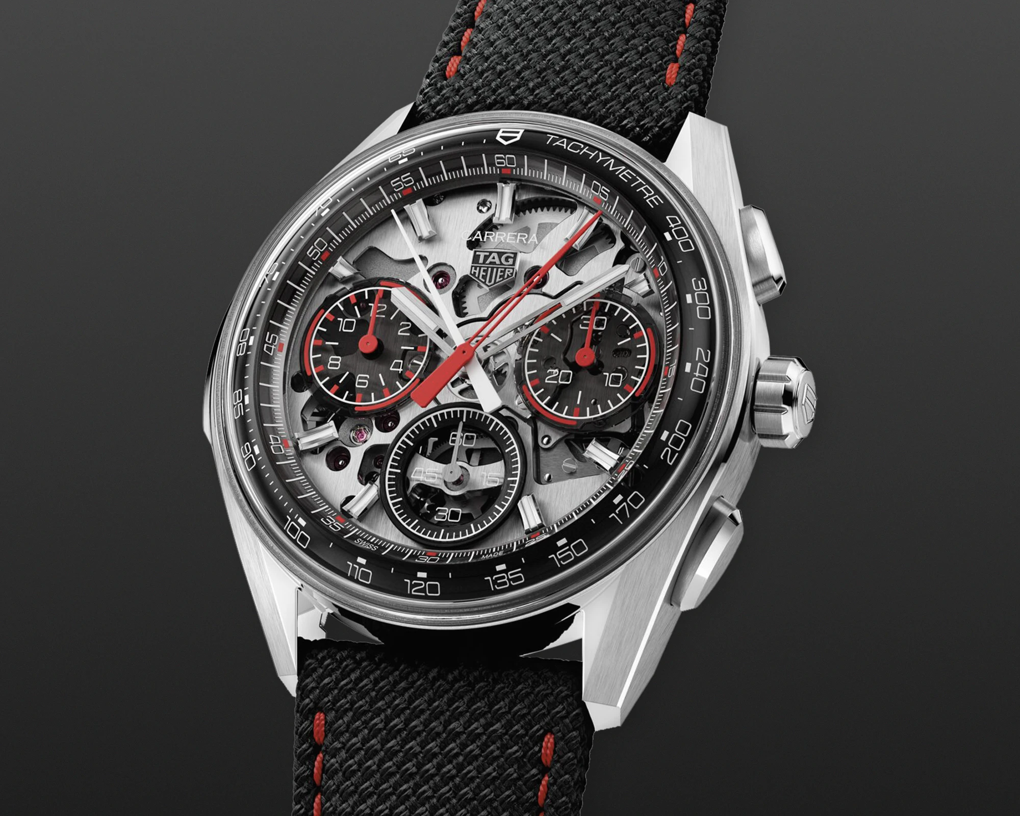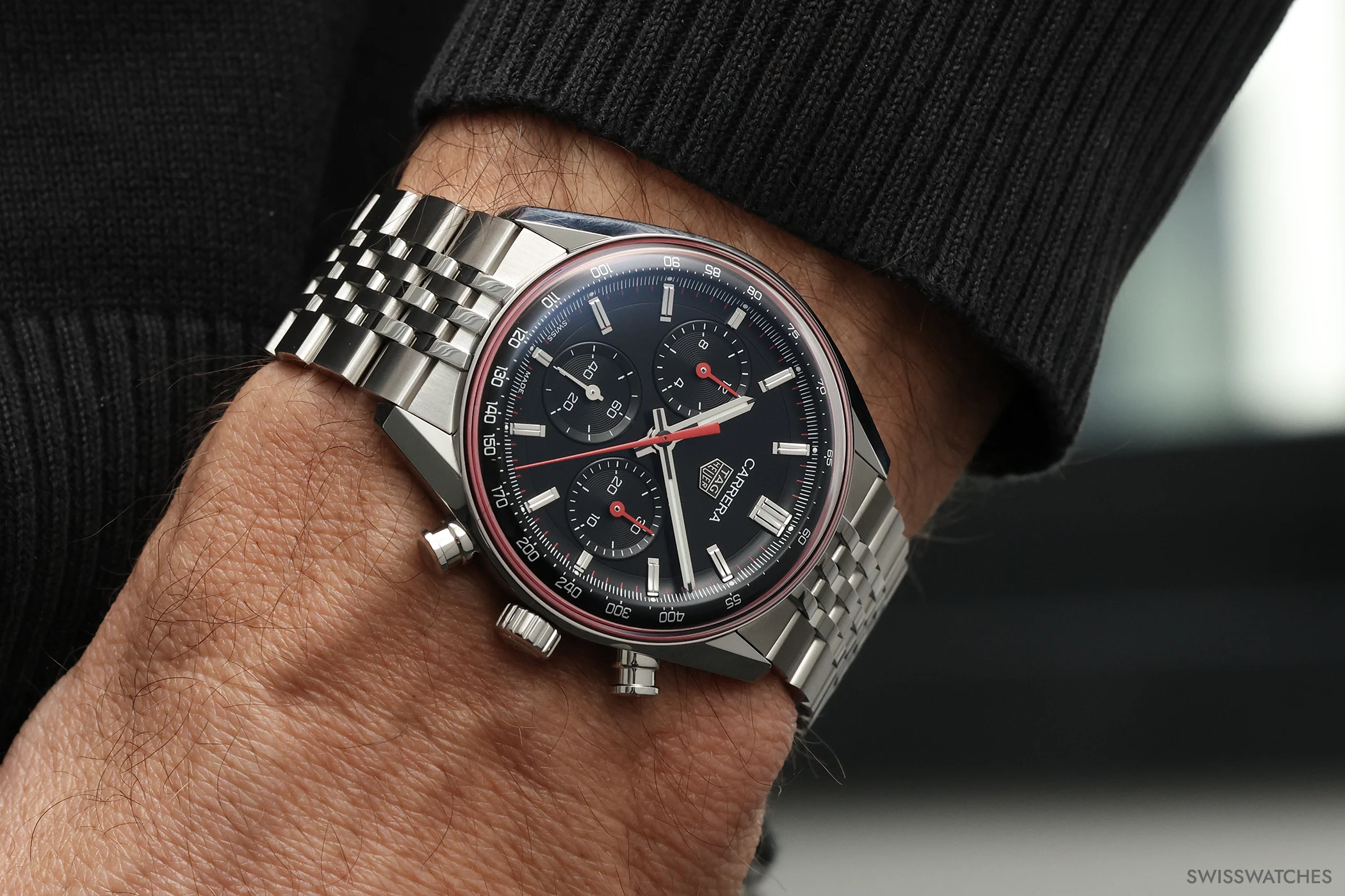 Doch kommen wir von den Gemeinsamkeiten zu dem, was die drei neuen Carrera-Varianten in 41-mm-Gehäusen voneinander unterscheidet: Die blaue sowie die grüne Version setzen auf ein kreisförmig satiniertes Zifferblatt mit ebenfalls vollständig in Blau beziehungsweise Grün ausgeführten Totalisatoren. Beide Modelle präsentieren zudem facettierte Stunden-, Minuten- sowie Chronographensekundenzeiger, die – ebenso wie die applizierten Indizes – vollständig rhodiniert sind. Zudem sind bei beiden Modellen Stunden- und Minutenzeiger mit weißer Super-LumiNova-Füllung versehen, einem Leuchtstoff, der auch bei dunklen Lichtverhältnissen für gute Ablesbarkeit sorgt. Die dritte Variante hingegen verfügt über ein schwarzes Zifferblatt, bei dem die Zeiger des Chronographen-30-Minuten-Zählers sowie des Chronographen-12-Stunden-Zählers zur besseren Unterscheidung ebenso wie der zentrale Chronographensekundenzeiger in einem markanten Rotton ausgeführt sind. Um dem Zifferblatt einen dezenten Rahmen zu geben, zieht sich am Rand des Saphirglases zudem eine rote Kontur entlang.