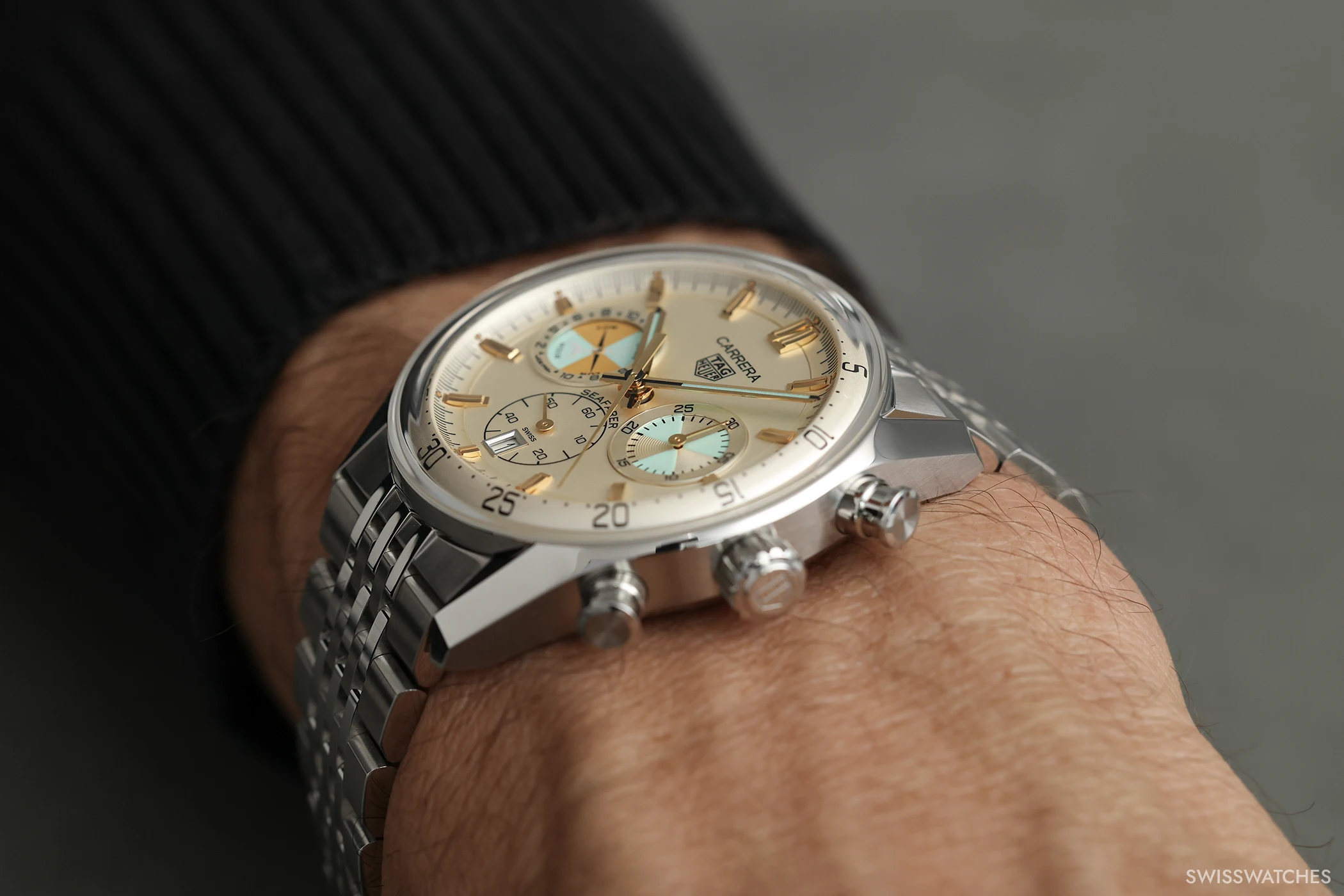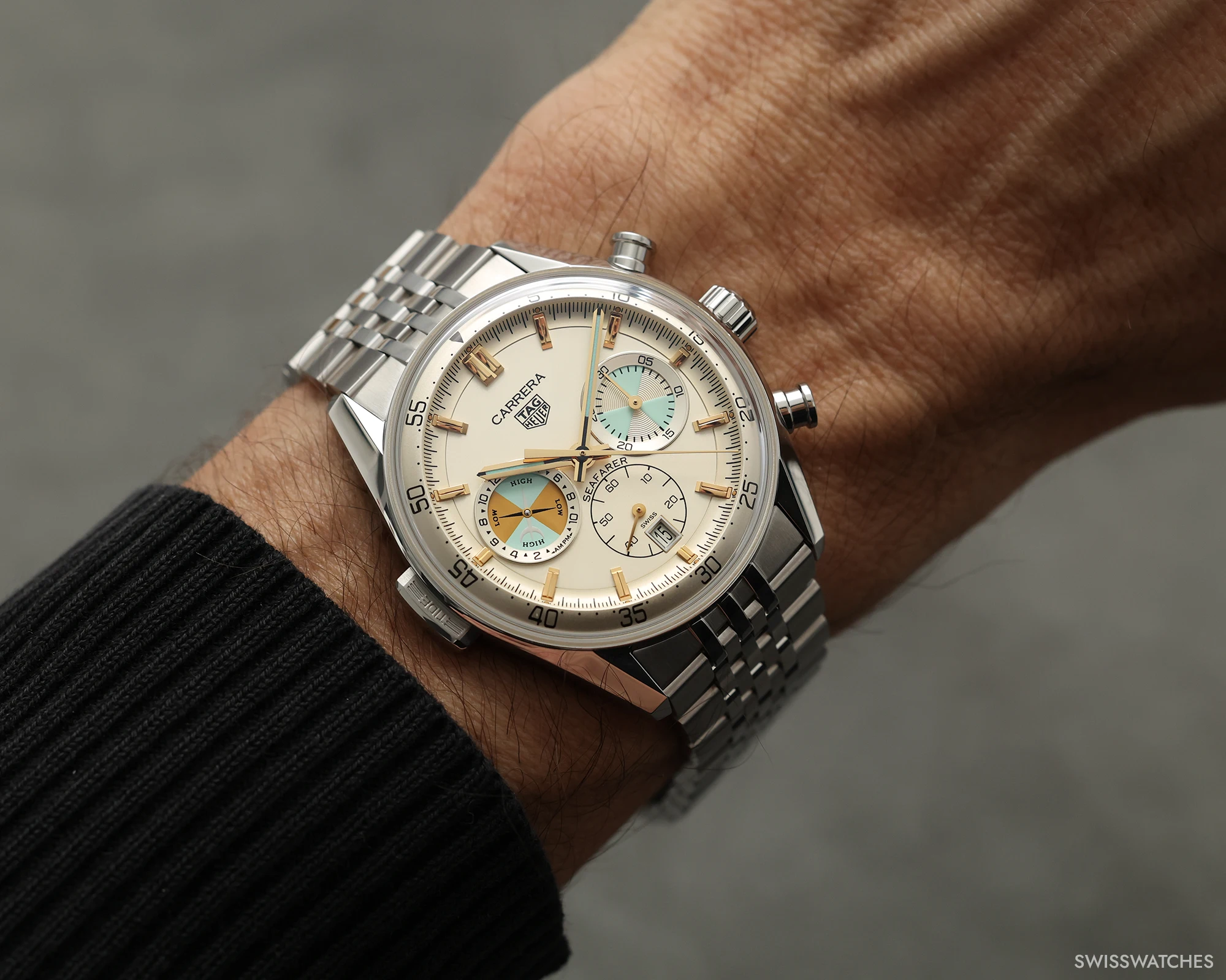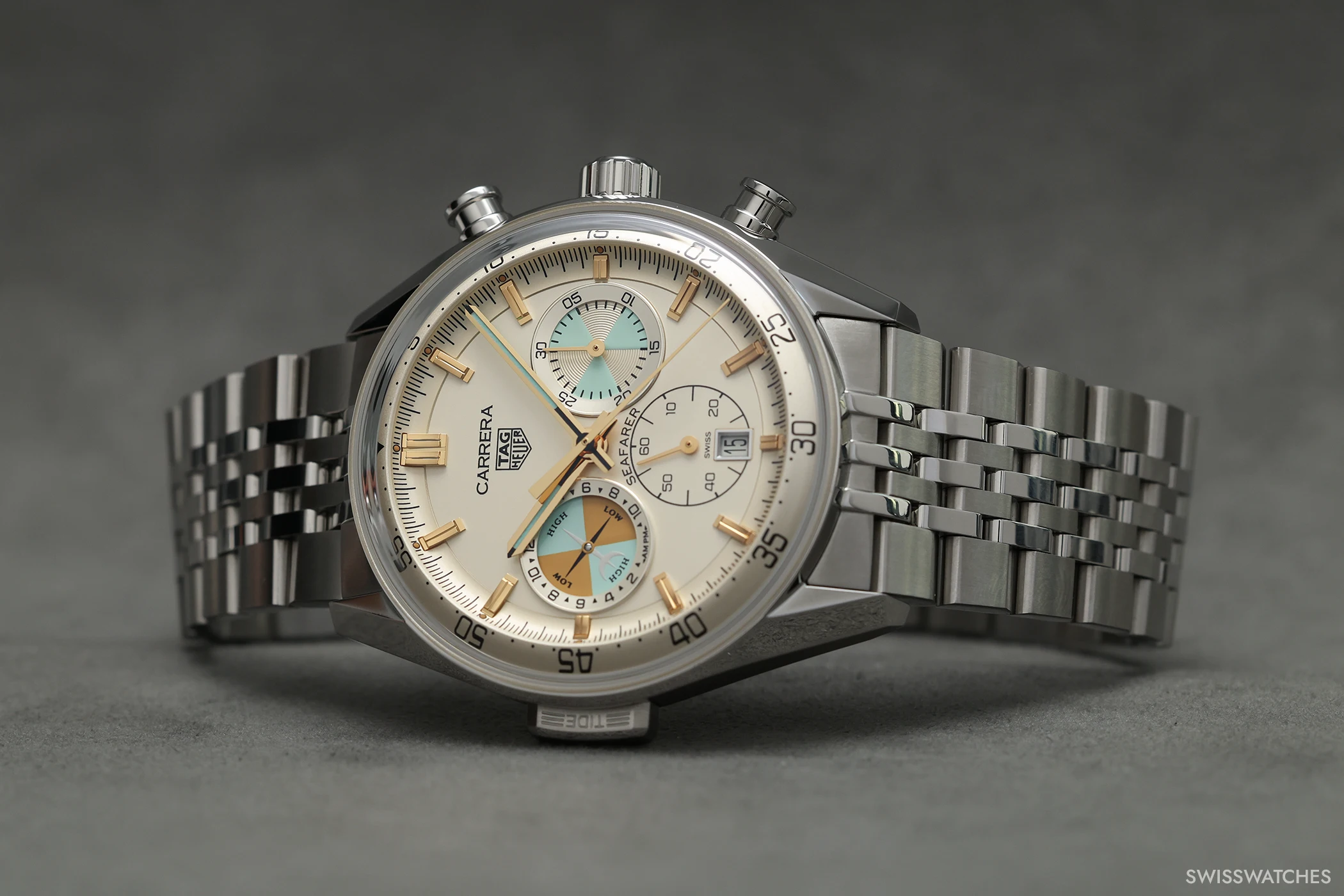 Die TAG Heuer Carrera Seafarer (Ref. CBS2016.EB0430), die im Rahmen der TAG Heuer LVMH Watch Week 2026 vorgestellt wurde, wird ab März 2026 erhältlich sein, verfügt über eine fünfjährige Garantie und wird zu einem Preis von 8.300 CHF angeboten. Neben dem im Jahr 2025 überarbeiteten siebenreihigen Edelstahlarmband im „Beads-of-Rice“-Stil liegt der Seafarer ein beigefarbenes Textilarmband bei, das den historischen Charakter der Gezeitenanzeige komplementiert.