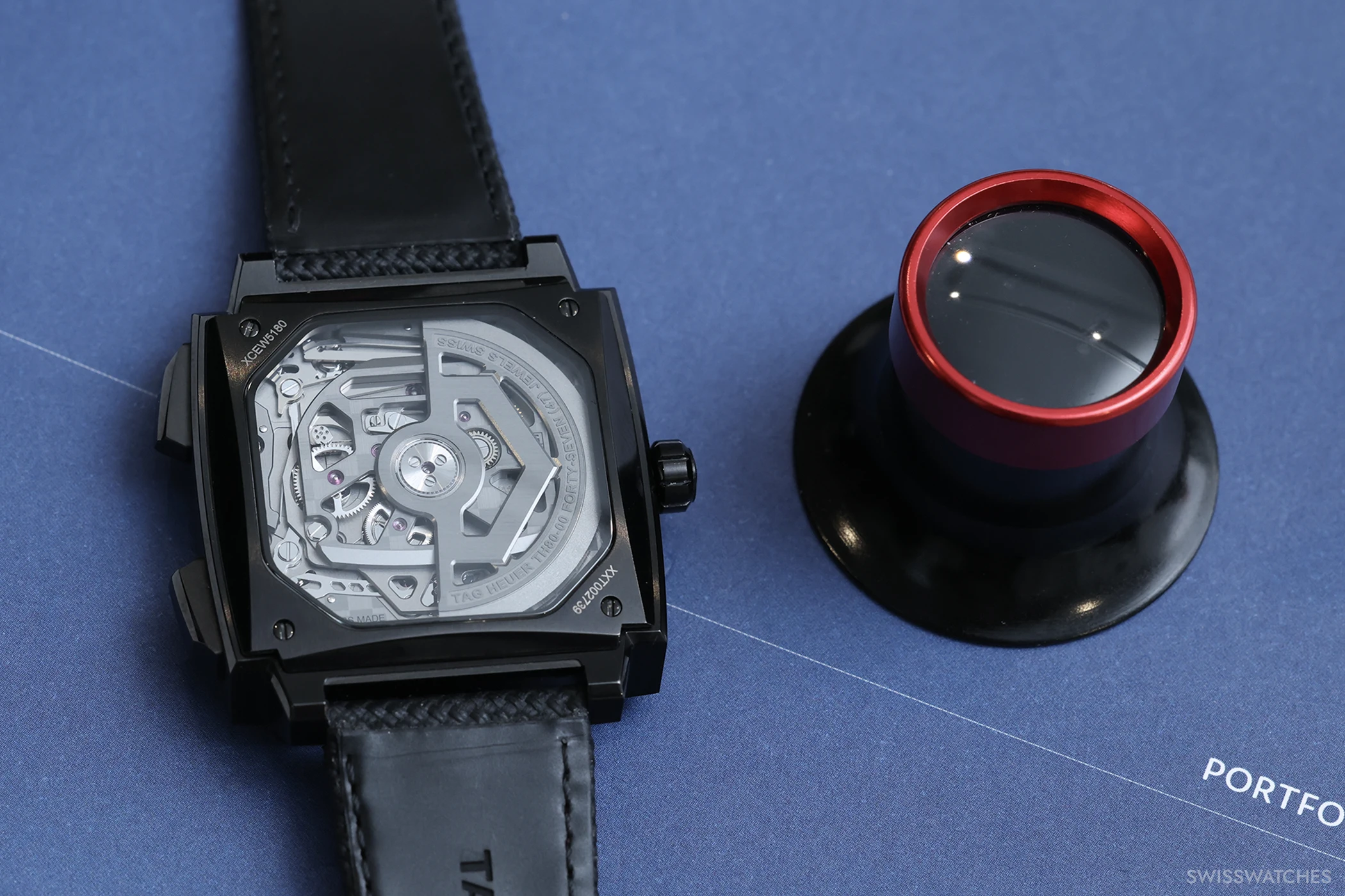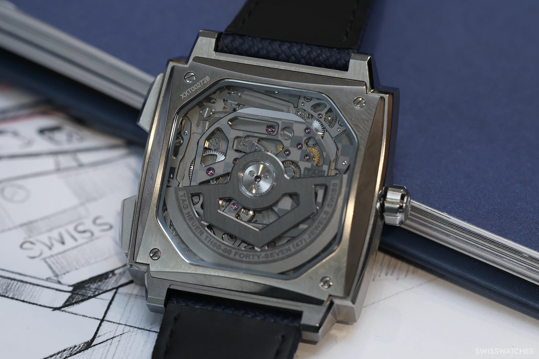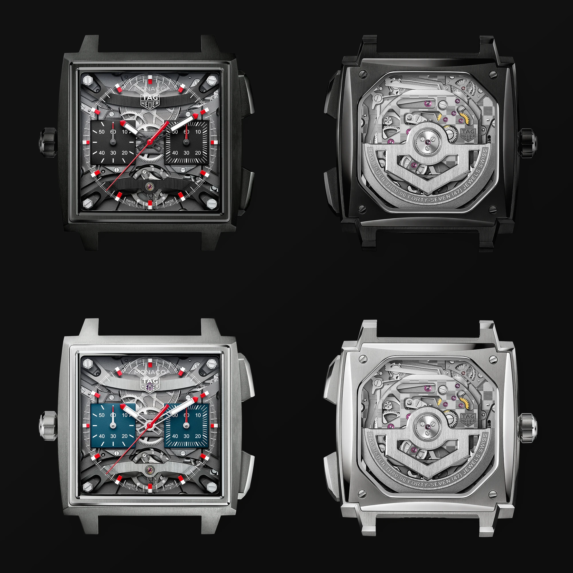 Während der einzigartige Chronographen-Mechanismus mit flexiblen Komponenten von TAG Heuer entwickelt wurde, arbeitete man beim neuen quadratischen Formwerk der TAG Heuer Monaco Evergraph mit dem Werkspezialisten Vaucher Manufacture Fleurier zusammen. Das Kaliber TH80-00 ist so aufgebaut, dass es auch optisch einiges bietet: Unruh und Federhaus sind auf die Vorderseite verlegt und unter zwei symmetrischen, gebogenen Brücken sichtbar. Den neuartigen Chronographenmechanismus kann man auf der Rückseite betrachten. Unter dem Aufzugsrotor und der mit Zielflaggenmotiv verzierten Brücke bewegt sich das komplexe Nullstellteil mit integrierten Federn.