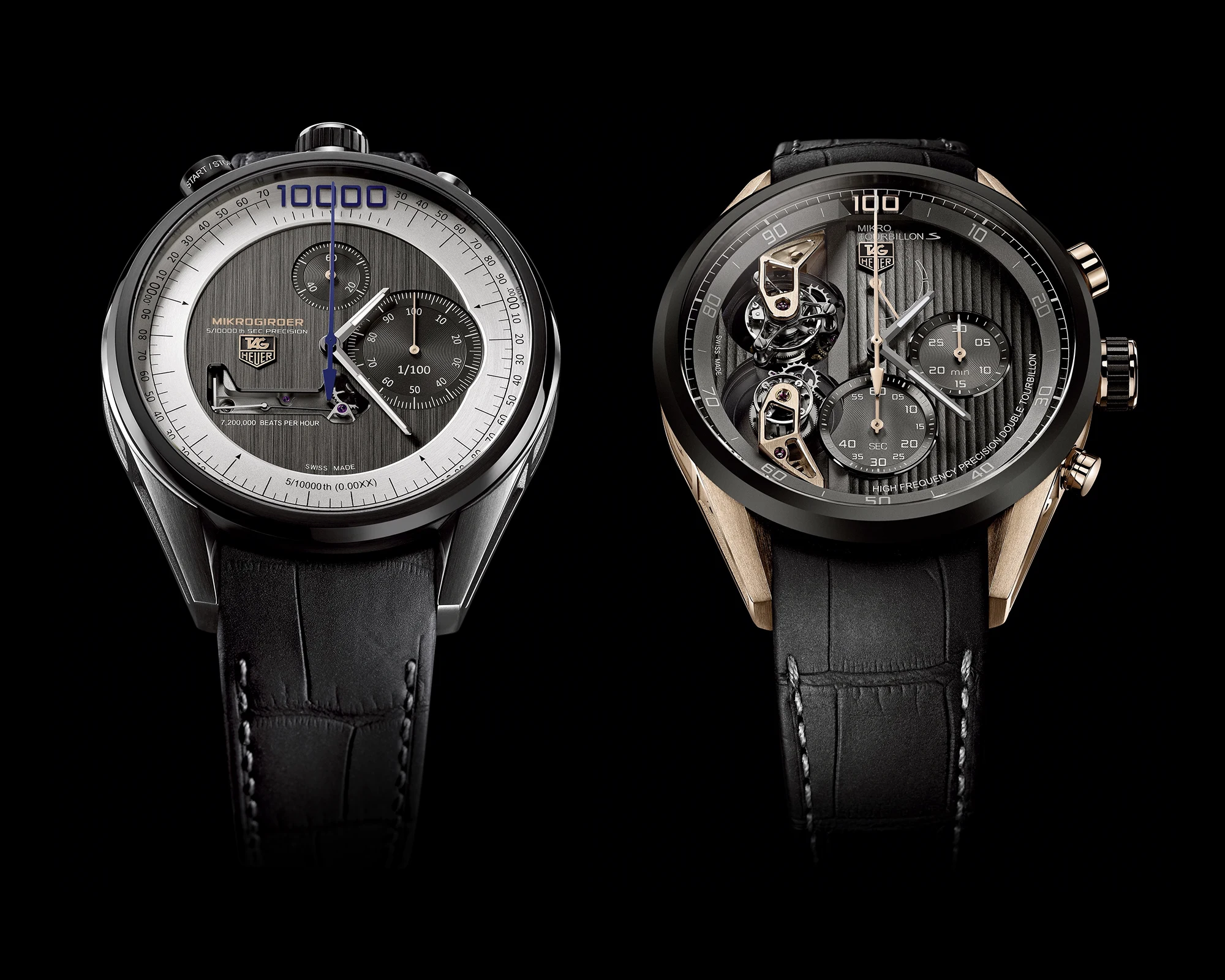 Und auch bei mechanischen Chronographen gab sich TAG Heuer nicht mit dem Erreichten zufrieden. Ab 2011 erschien eine Serie von Uhren, die die Grenzen der mechanischen Stoppzeitmessung immer weiter verschoben: Der Carrera Mikrograph stoppte auf eine Hundertstelsekunde genau und nutzte dafür eine zweite, schnellschwingende Unruh. Der Mikrotimer Flying 1000 im selben Jahr kam auf eine Tausendstelsekunde, und der Mikrogirder verdoppelte die Präzision nochmals. Sein Stoppzeiger machte alle 0,0005 Sekunden einen Schritt und erreichte damit die etwas ungewöhnliche Genauigkeit von einer Zweitausendstelsekunde.