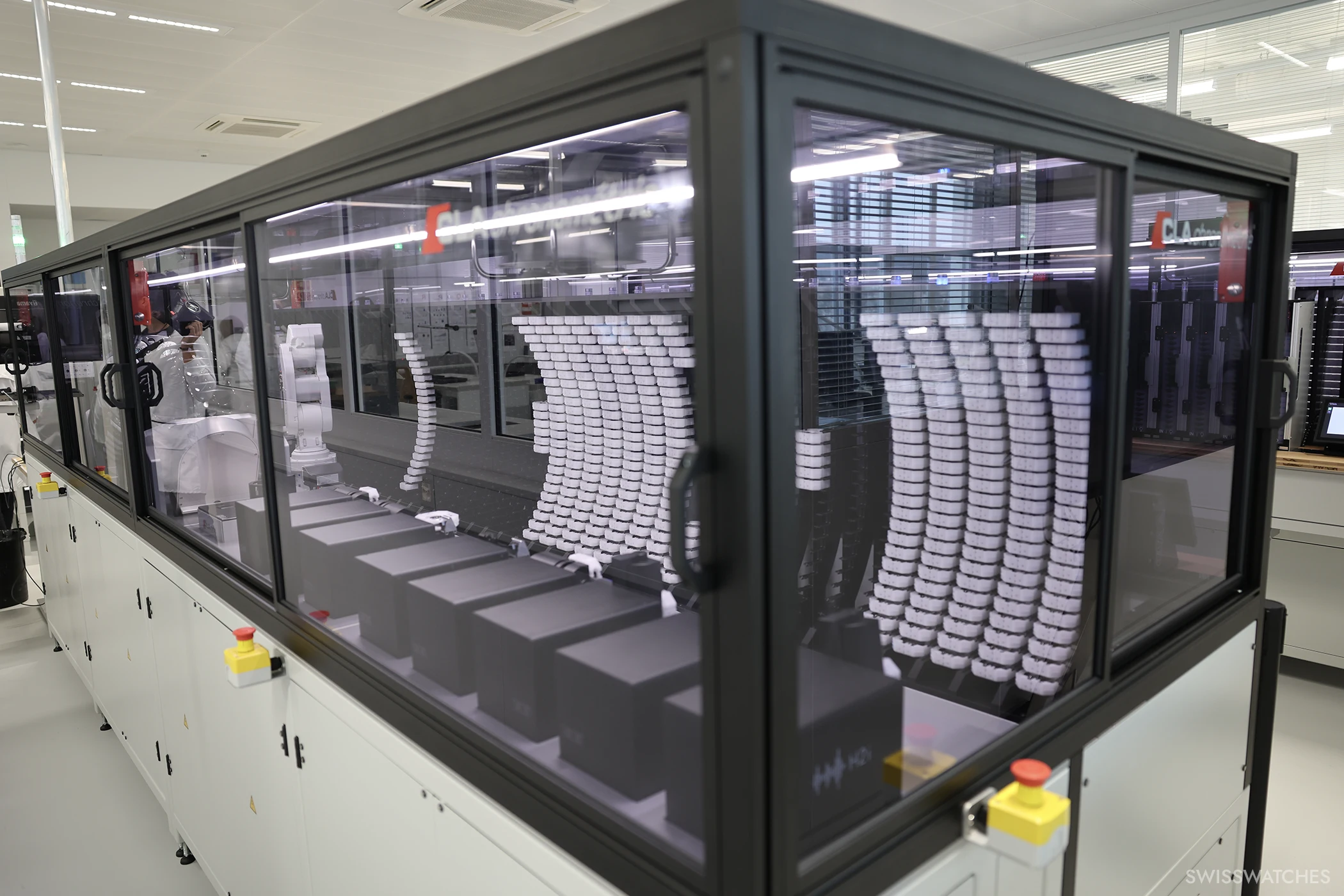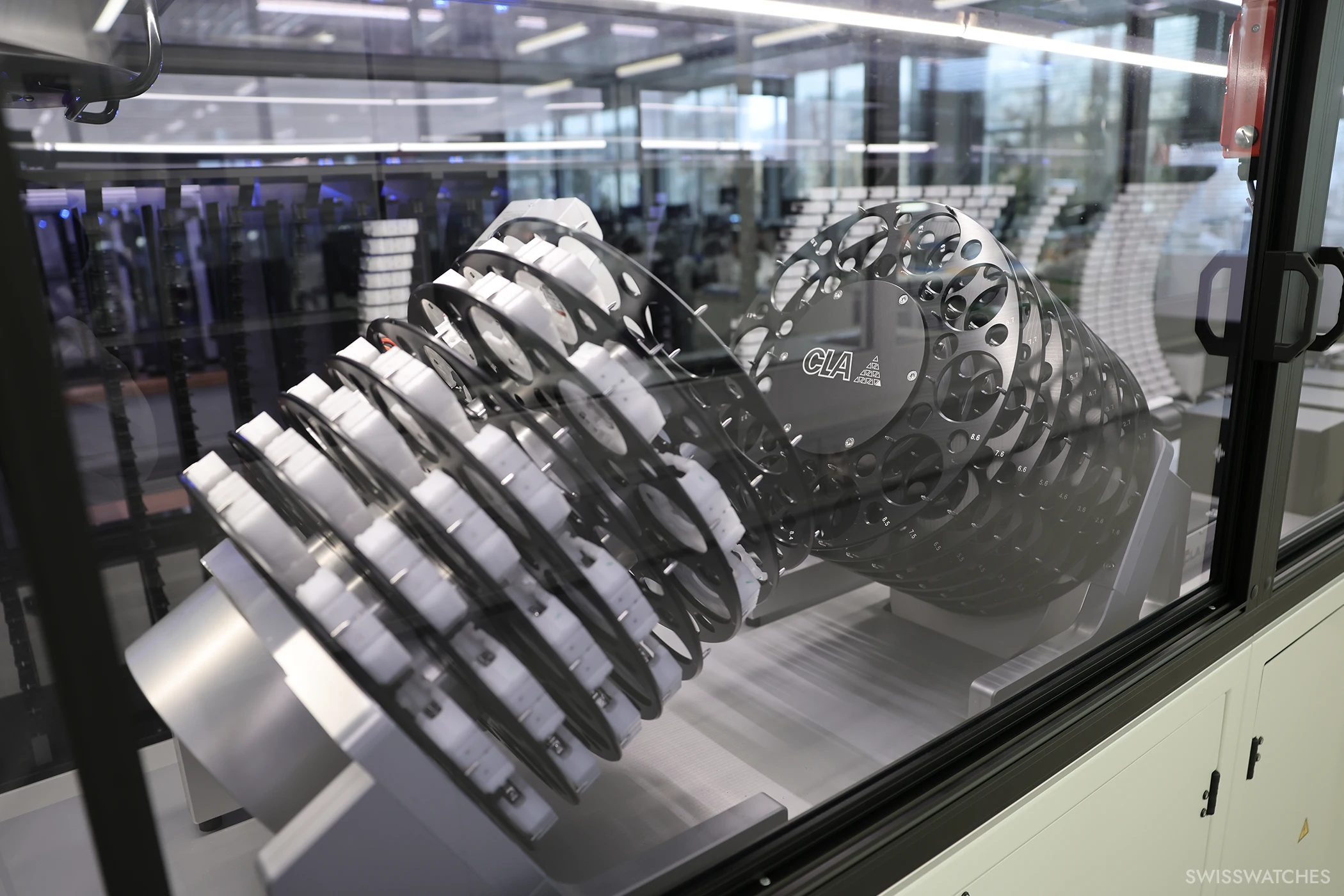 Um die große Anzahl an Serienuhren abschließend vollständig zu testen, gibt es eine vollautomatische Roboterzelle von CLA (Clinical Laboratory Automation). Hier werden die Uhren ohne Band in der Kabine einer Reihe von Tests unterzogen. Ein Roboterarm transportiert die Uhrenköpfe von Station zu Station: Zuerst wird die Aufzugsleistung getestet, dann die Ganggenauigkeit in allen sechs Lagen und zuletzt die korrekte Funktion der Drücker überprüft. Mit dem QR- und Barcode-Aufkleber auf der Rückseite können die Ergebnisse den Uhren zugeordnet werden.
