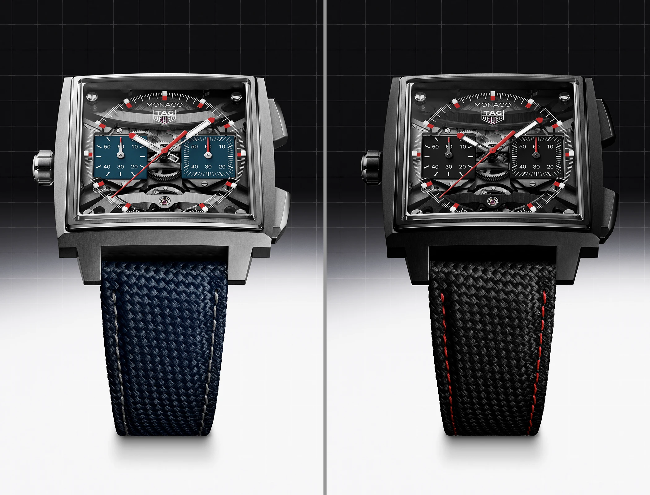 Den TAG Heuer Monaco Evergraph gibt es in zwei Versionen: im naturbelassenen Titangehäuse mit blauem Farbschema, das an die durch Steve McQueen berühmt gewordene Referenz 1133B erinnert, und in DLC-schwarzem Titangehäuse mit schwarzen Hilfszifferblättern und roten Akzenten. Beide kommen an einem Kautschukband mit Textiloptik und kosten je 25.000 Euro.