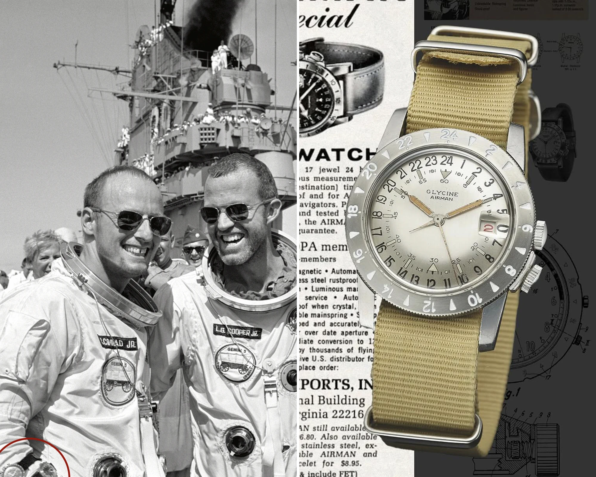 Die Glycine Watch SA ist ein Schweizer Uhrenhersteller, der 1914 in Biel von Eugène Meylan gegründet wurde, wo sich bis heute sowohl die Produktion als auch der Firmensitz befindet. Glycine erreichte im Jahr 1965 den Weltraum, als der Astronaut Charles „Pete“ Conrad eine Glycine Airman während der Mission Gemini 5 trug. Als langjähriger Liebhaber der Airman – laut der Marke bereits seit seiner Zeit als Testpilot der U.S. Air Force – nutzte Conrad das Modell bei diesem Flug, bei dem er gemeinsam mit Gordon Cooper einen neuen Raumflug-Ausdauerrekord von 7 Tagen, 22 Stunden, 55 Minuten und 14 Sekunden aufstellte und damit den bisherigen sowjetischen Rekord übertraf. Neben den beiden von der NASA ausgegebenen Omega-Speedmaster-Modellen, die Conrad während der Mission am Handgelenk trug, befand sich auch eine Glycine Airman an seinem Handgelenk und zählt somit zu einer der Uhren im Weltraum.