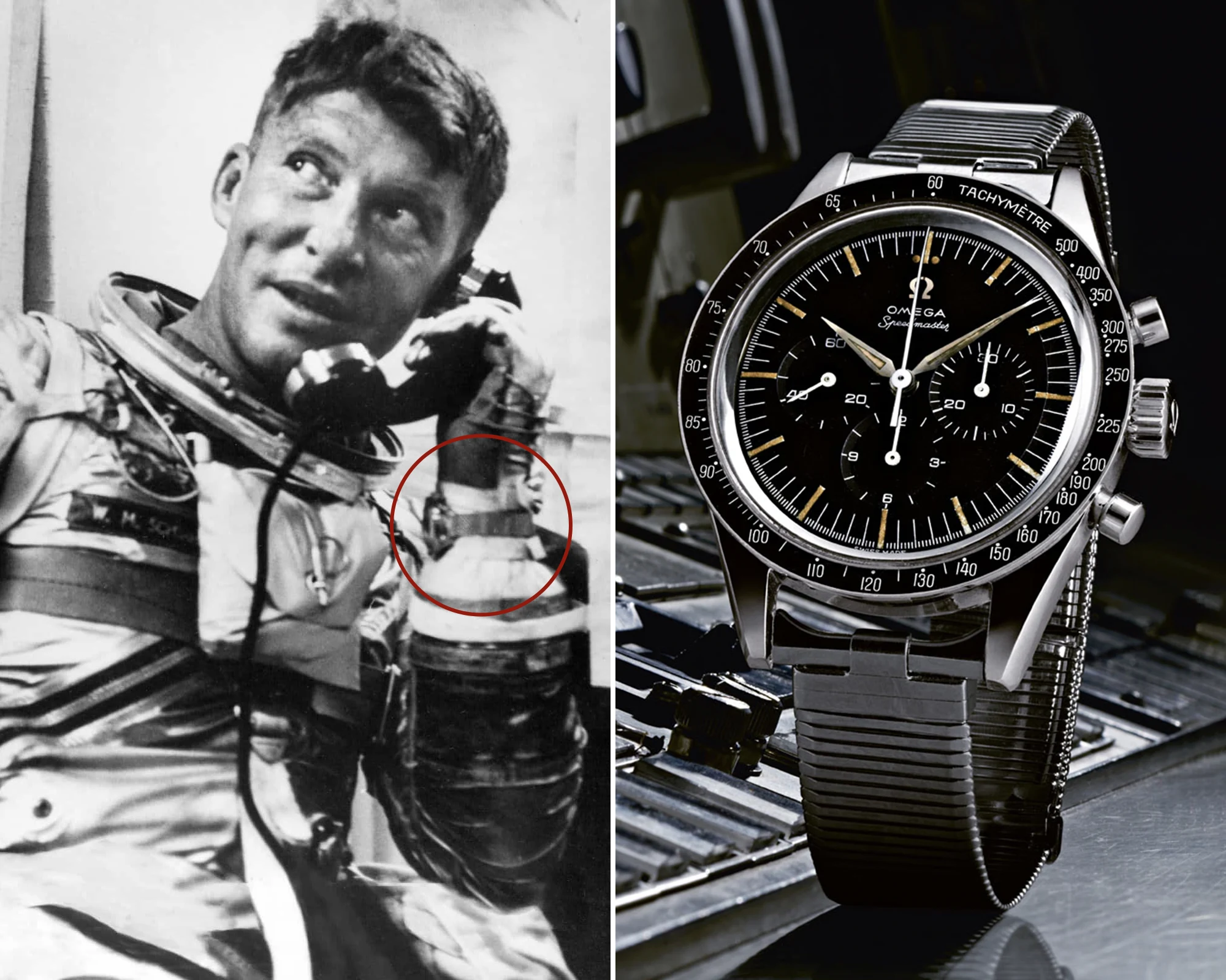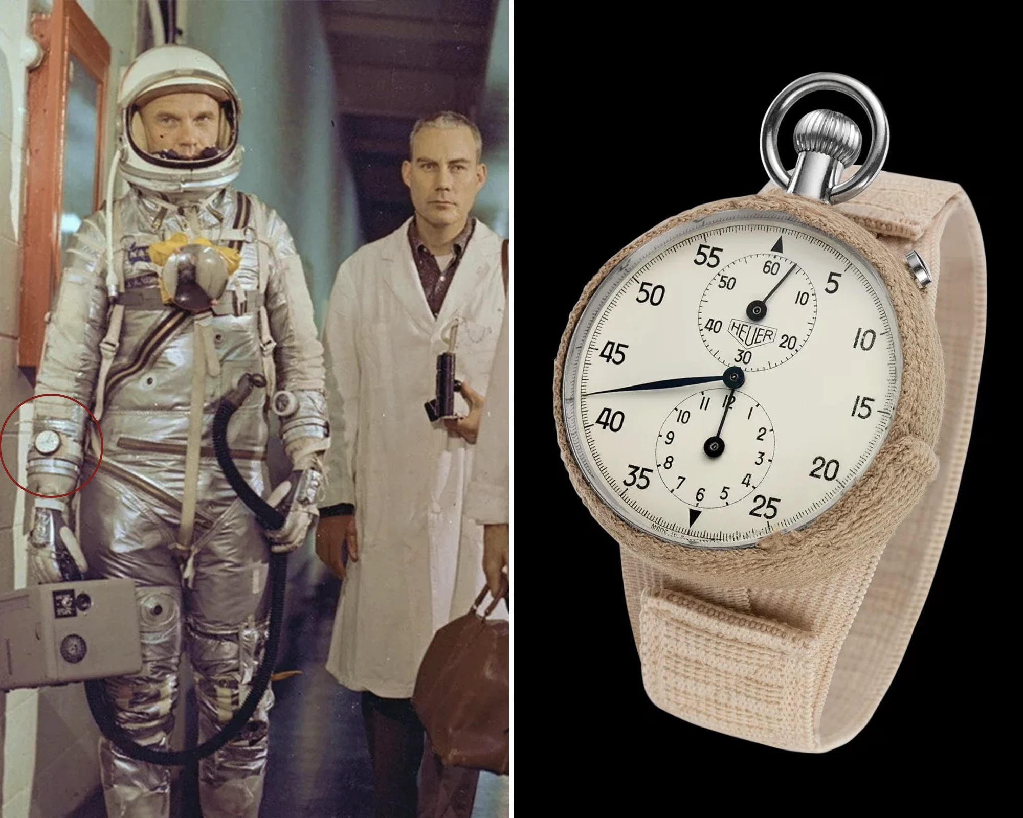 Der Heuer-Stoppchronograph mit der Referenz 2915A markiert den ersten Einsatz eines Schweizer Zeitmessers im Weltraum und nimmt deshalb eine besondere Stellung unter den Uhren im Weltraum ein. Sie wurde von John Glenn während der Mission Mercury-Atlas 6 im Jahr 1962 mitgeführt, als er als erster Amerikaner an Bord eines Raumfahrzeugs die Erde umrundete. Gemeinsam mit seiner Heuer sollte er die Erde in einer Zeit von 4 Stunden und 55 Minuten bei einer zurückgelegten Strecke von 121.793 Kilometern dreimal umrunden, eine maximale Höhe von etwa 260 Kilometern sowie eine Umlaufgeschwindigkeit von rund 7,8 Kilometern pro Sekunde erreichen – und die USA mit John Glenn als erstem US-amerikanischen Astronauten in der Erdumlaufbahn zur Sowjetunion aufschließen. Bei der Heuer Referenz 2915A, die mit elastischen Bändern über John Glenns Arm gespannt war, handelte es sich um ein Modell mit weißem Zifferblatt, dessen zentraler Chronographenzeiger eine vollständige Umdrehung in 60 Sekunden vollführte. Der kleine Zeiger des oberen Hilfszifferblatts maß dabei Zeitintervalle von bis zu 60 Minuten, während der des unteren Hilfszifferblatts Zeiten von bis zu 12 Stunden erfasste. Das Zifferblatt ermöglichte dank der Kombination aus großen Ziffern und der feinen Skala am Zifferblattrand das präzise Erfassen von Zeitintervallen mit einer Genauigkeit von 1/5 Sekunden.