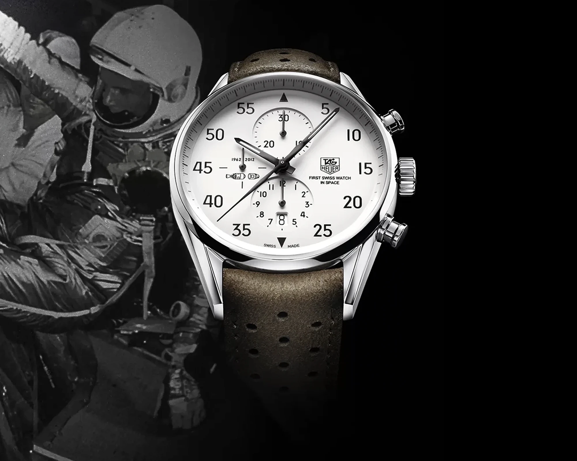 Im Jahr 2012 flog ein TAG Heuer Carrera Calibre 1887 SpaceX Chronograph an Bord einer Mission von SpaceX zur Internationalen Raumstation (ISS) ins All und kehrte unbeschadet zur Erde zurück. Diese auf 2.012 Exemplare limitierte Edition wurde von TAG Heuer anlässlich zweier Jubiläen aufgelegt: zum einen 50 Jahre seit dem ersten Schweizer Zeitmesser im All – der von John Glenn 1962 getragenen Heuer-Stoppuhr Ref. 2915A –, zum anderen zur Feier der ersten erfolgreichen ISS-Versorgungsmission von SpaceX im Jahr 2012. In ihrer Zifferblattgestaltung orientierte sich TAG Heuer an der Anordnung der historischen Referenz 2915A und übersetzte sie in das Format einer Armbanduhr. Die Jubiläumsuhr verfügte demnach über ein weißes Zifferblatt mit einem 30-Minuten-Zähler bei 12 Uhr und einem 12-Stunden-Zähler bei 6 Uhr, eingefasst in ein 43-mm-Edelstahlgehäuse. Ebenfalls übernommen wurden die Dreiecksmarkierungen bei 12 und 6 Uhr sowie die Ziffern, die in derselben Schriftart ausgeführt wurden. Völlig neu hingegen war die Verwendung eines Datumsfensters und einer grafischen Darstellung bei 3 Uhr, die ein Bild der SpaceX-Rakete Falcon 9 mit der Dragon-Kapsel im niedrigen Erdorbit zeigt.