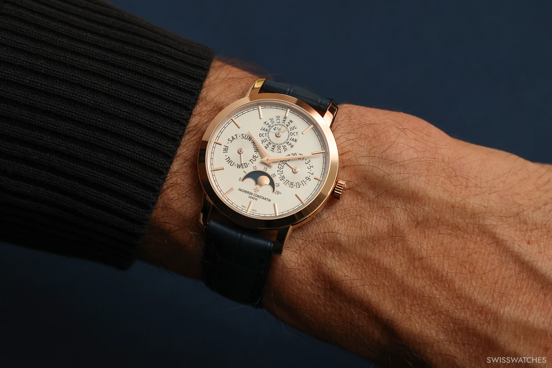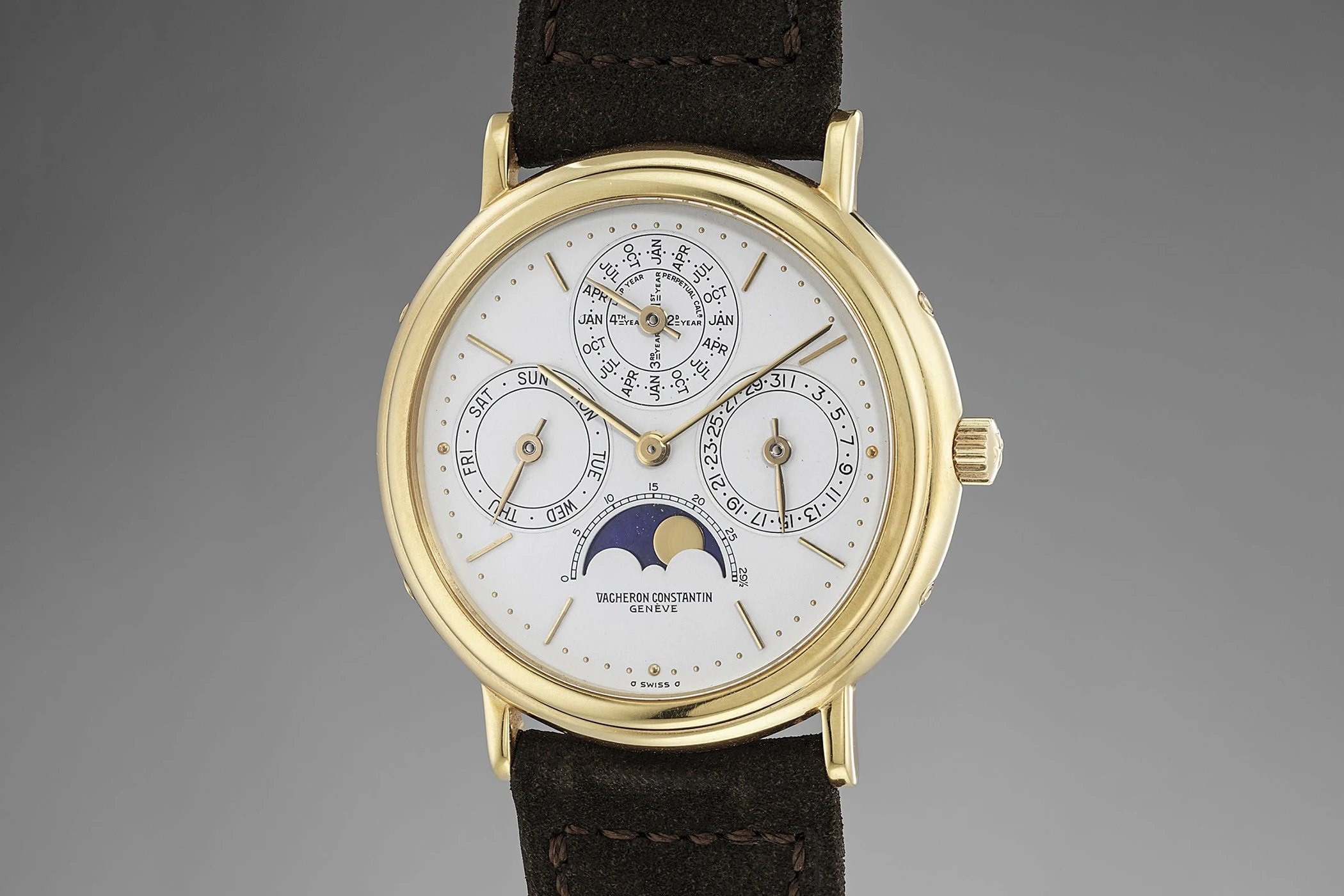 Im Falle der Referenz 43031, die über mehr als zwei Jahrzehnte hinweg (1983–2006) produziert wurde, verfügte die Uhr nicht nur über einen Gehäusedurchmesser von 36 mm bei einer Gehäusehöhe von flachen 8 mm, sondern darüber hinaus über eine Zifferblattanordnung, die die Aufgabe meisterte, die komplexen Anzeigen des Ewigen Kalenders übersichtlich zu präsentieren. Diese Gestaltung des Ewigen Kalenders erweist sich als maßgeblich stilprägend für die neuen Vacheron Constantin Traditionnelle Ewiger Kalender Extra-Flach Modelle, die wir uns nun im Detail anschauen wollen.