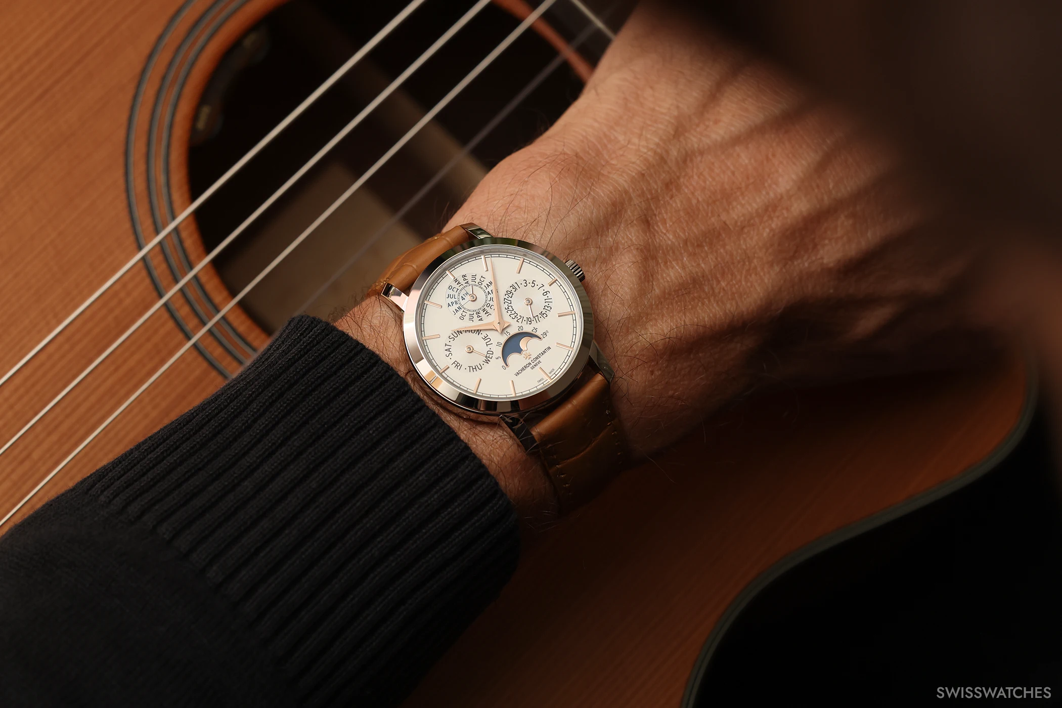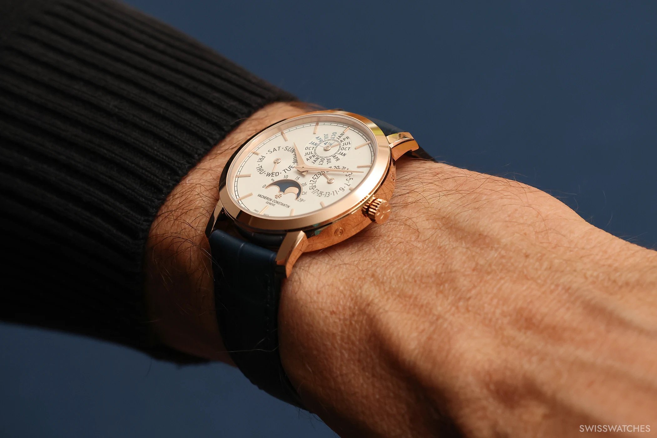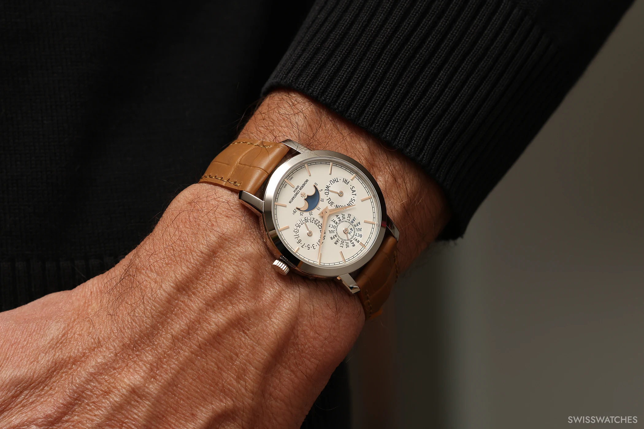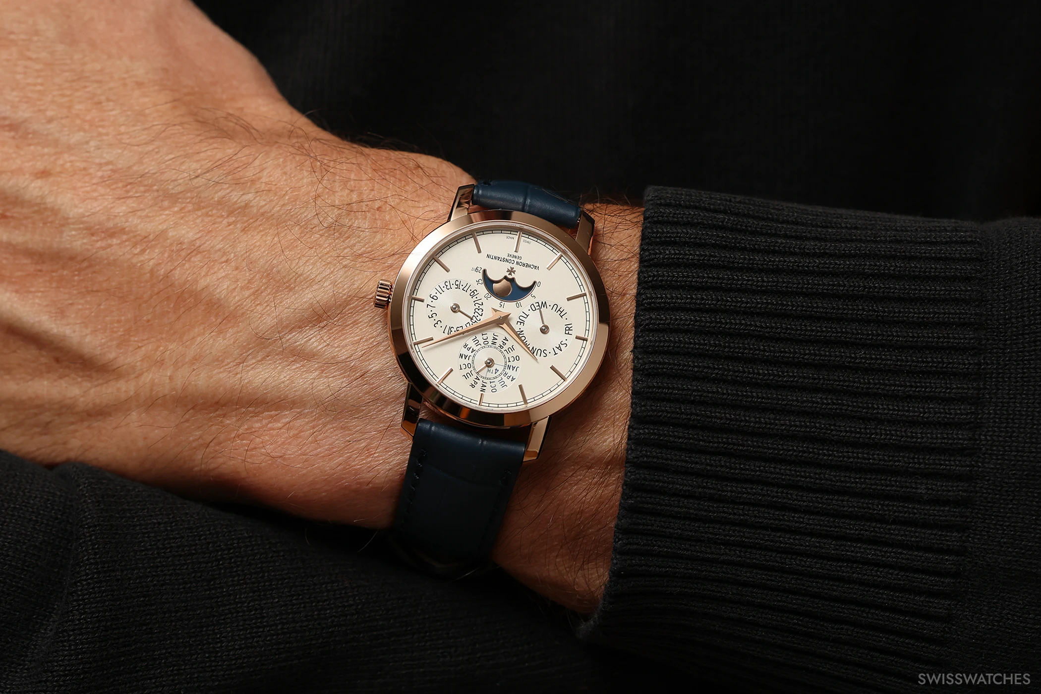 Der direkte Vergleich der Neuheit mit Uhren anderer Marken versinnbildlicht, warum die 36,5 mm der neuen Traditionnelle Ewiger Kalender Extra-Flach heute eher ungewöhnlich sind: Die Ewige Kalender Master Ultra Thin von Jaeger-LeCoultre (Ref. Q1142510) verfügt über einen Durchmesser von 39 mm bei einer Höhe von 9,2 mm. Die Classic Perpetual Calendar von Frederique Constant (Ref. FC-776ONB3H7) kommt in einem Gehäuse mit 40 mm Durchmesser und 12 mm Höhe, die Blancpain Villeret Quantième Perpétuel Phases de Lune (Ref. 6656 3642 55B) mit ewigem Kalender ist mit einem Gehäusedurchmesser von 40,30 mm bei einer Höhe von 10,70 mm erhältlich.