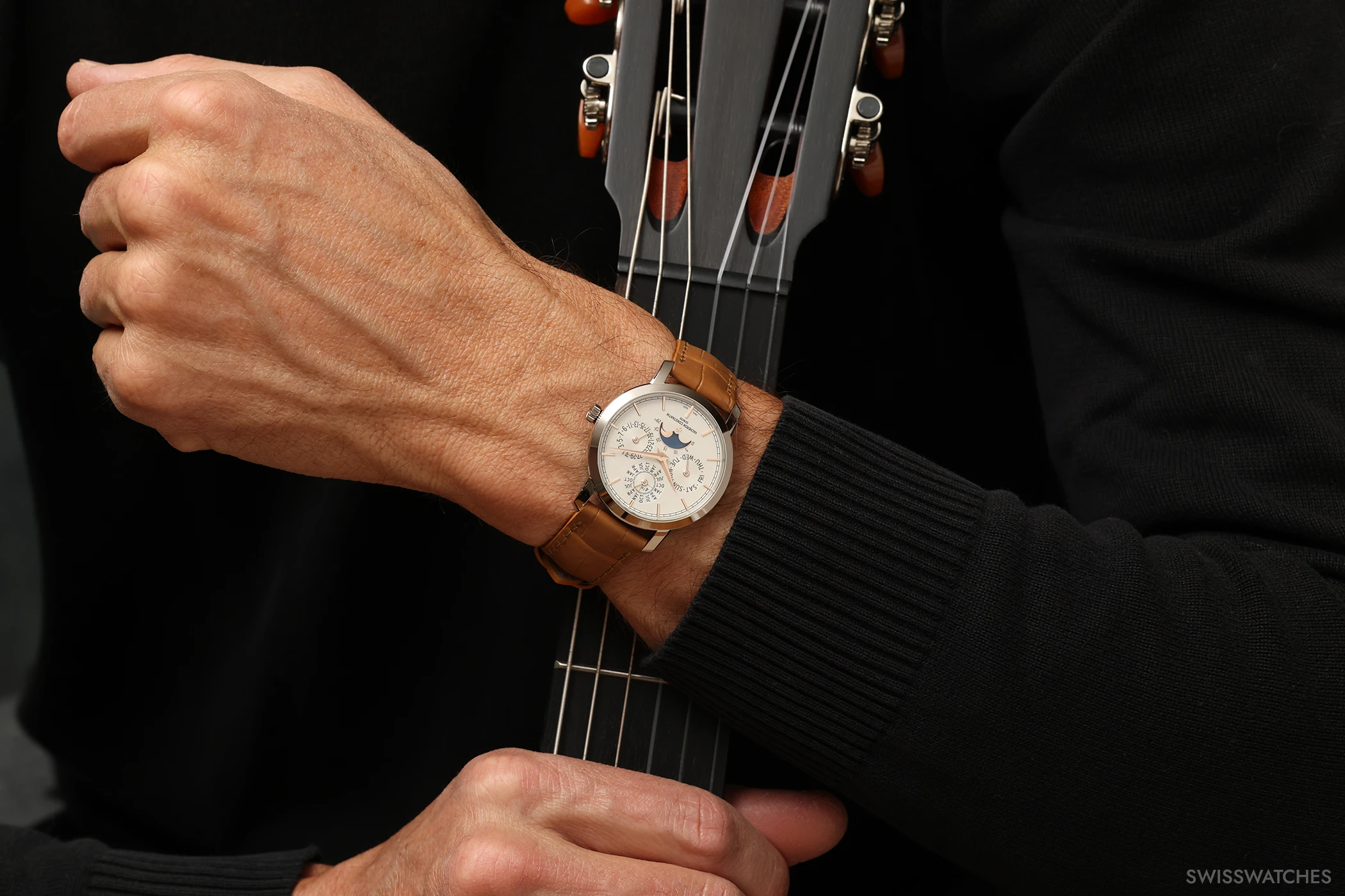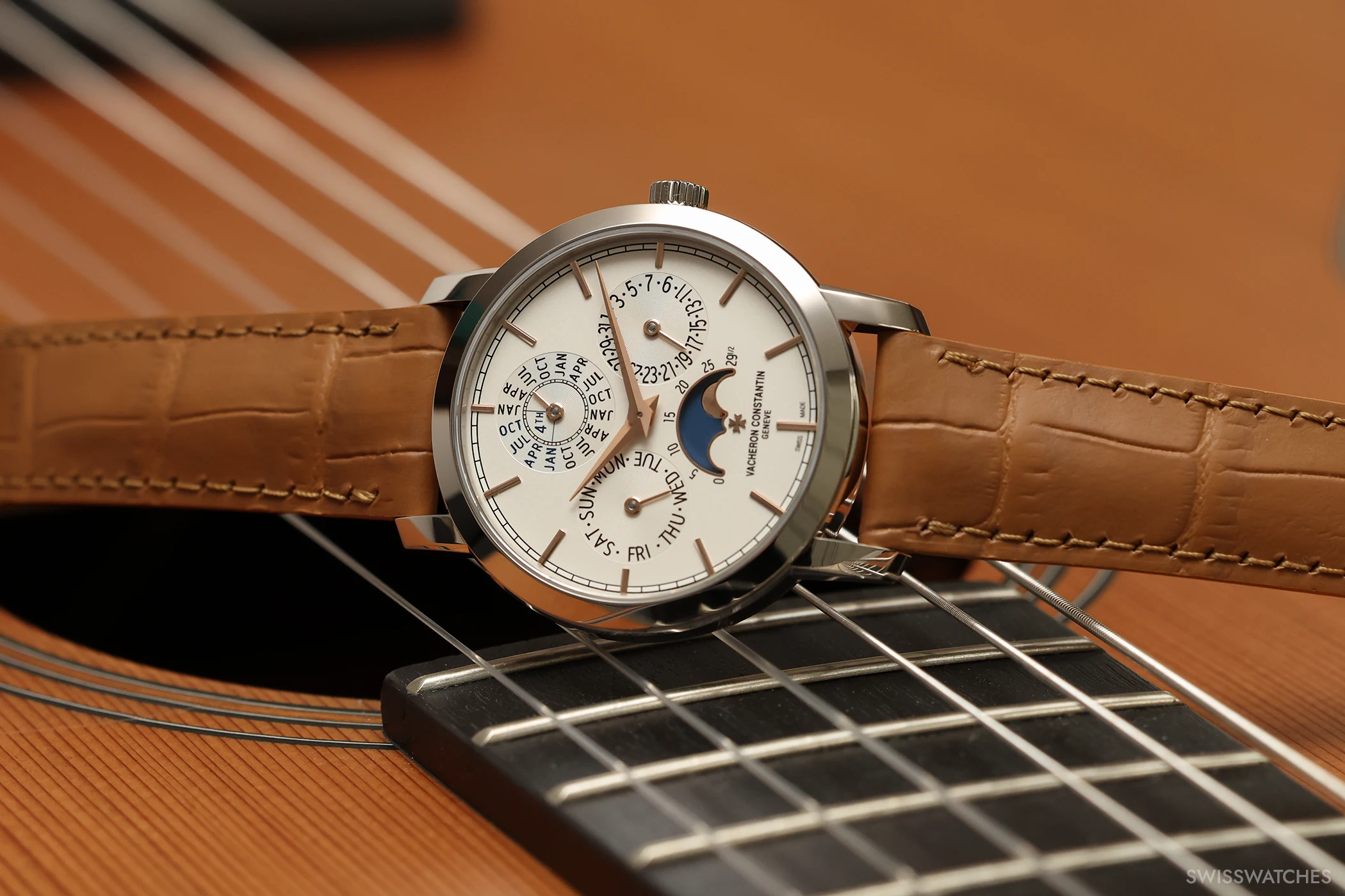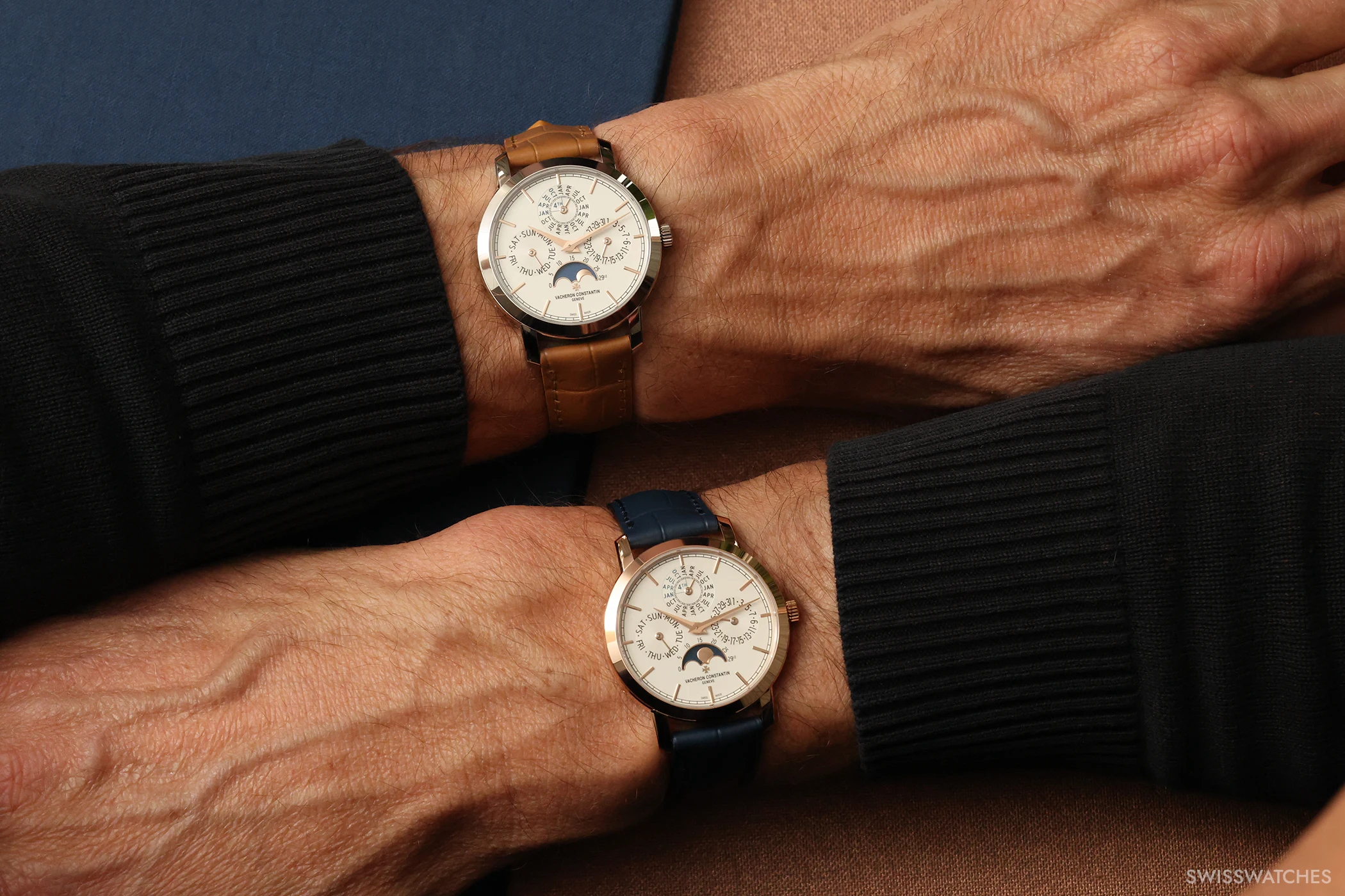 Der direkte Vergleich der Neuheit mit Uhren anderer Marken versinnbildlicht, warum die 36,5 mm der neuen Traditionnelle Ewiger Kalender Extra-Flach heute eher ungewöhnlich sind: Die Ewige Kalender Master Ultra Thin von Jaeger-LeCoultre (Ref. Q1142510) verfügt über einen Durchmesser von 39 mm bei einer Höhe von 9,2 mm. Die Classic Perpetual Calendar von Frederique Constant (Ref. FC-776ONB3H7) kommt in einem Gehäuse mit 40 mm Durchmesser und 12 mm Höhe, die Blancpain Villeret Quantième Perpétuel Phases de Lune (Ref. 6656 3642 55B) mit ewigem Kalender ist mit einem Gehäusedurchmesser von 40,30 mm bei einer Höhe von 10,70 mm erhältlich.
