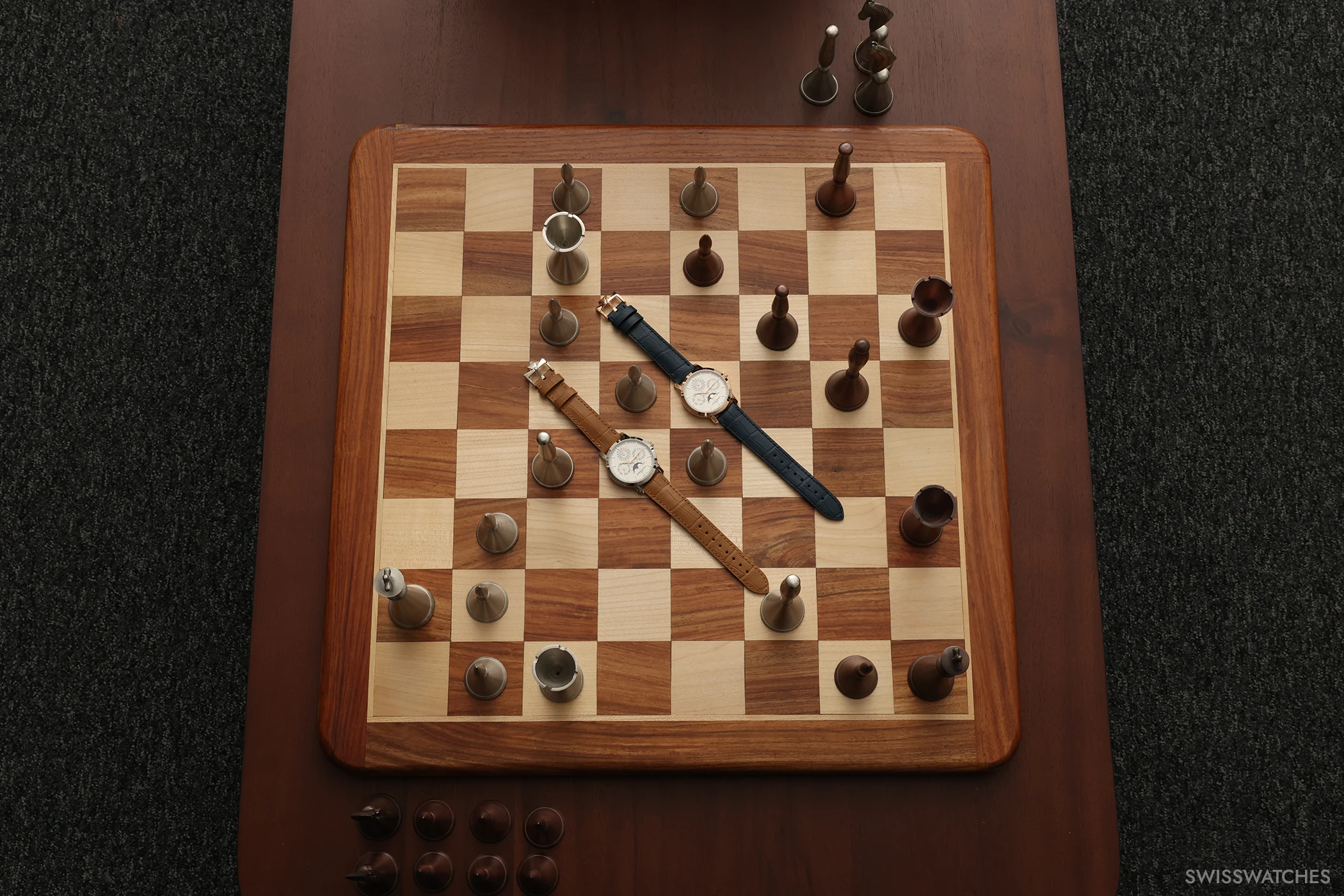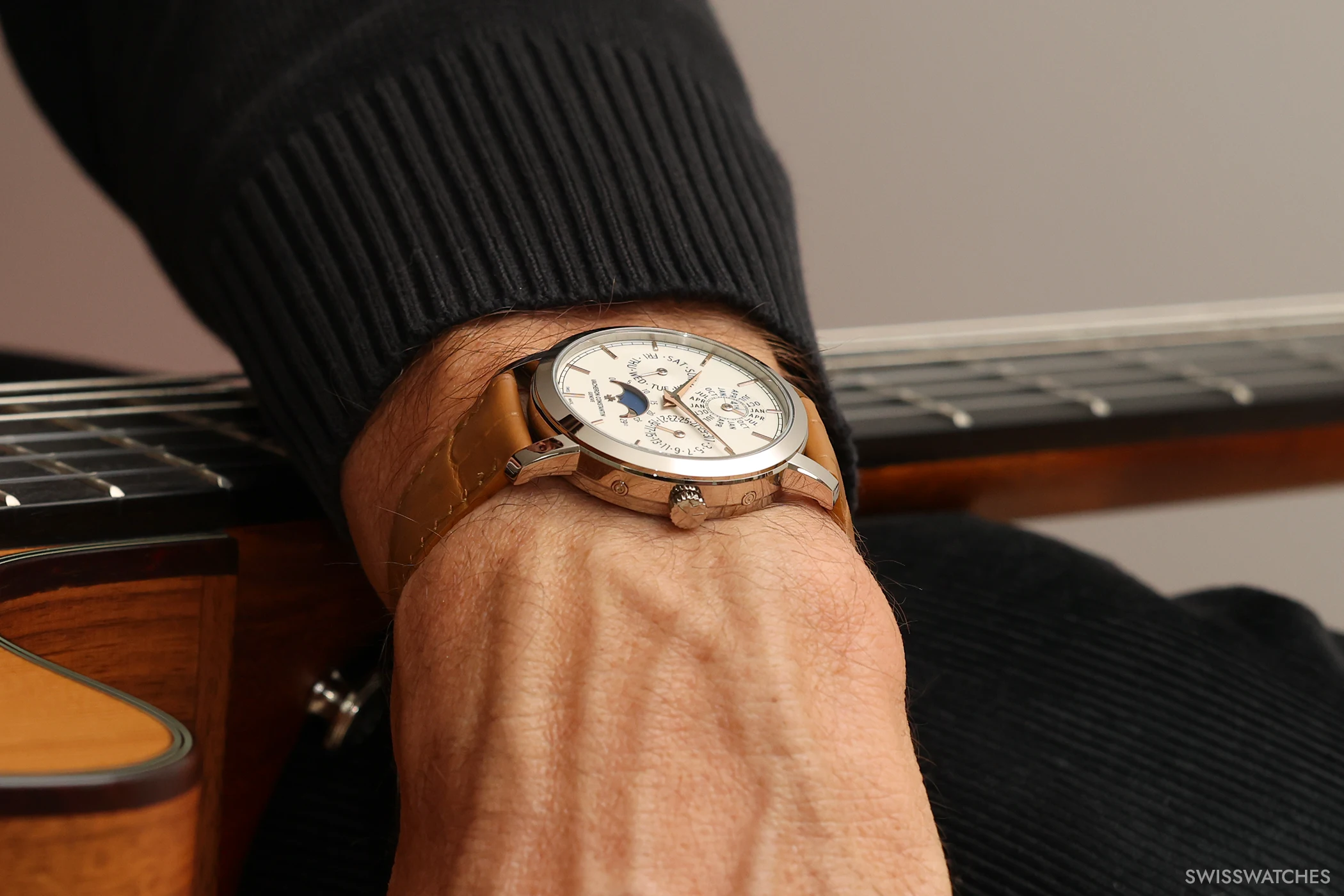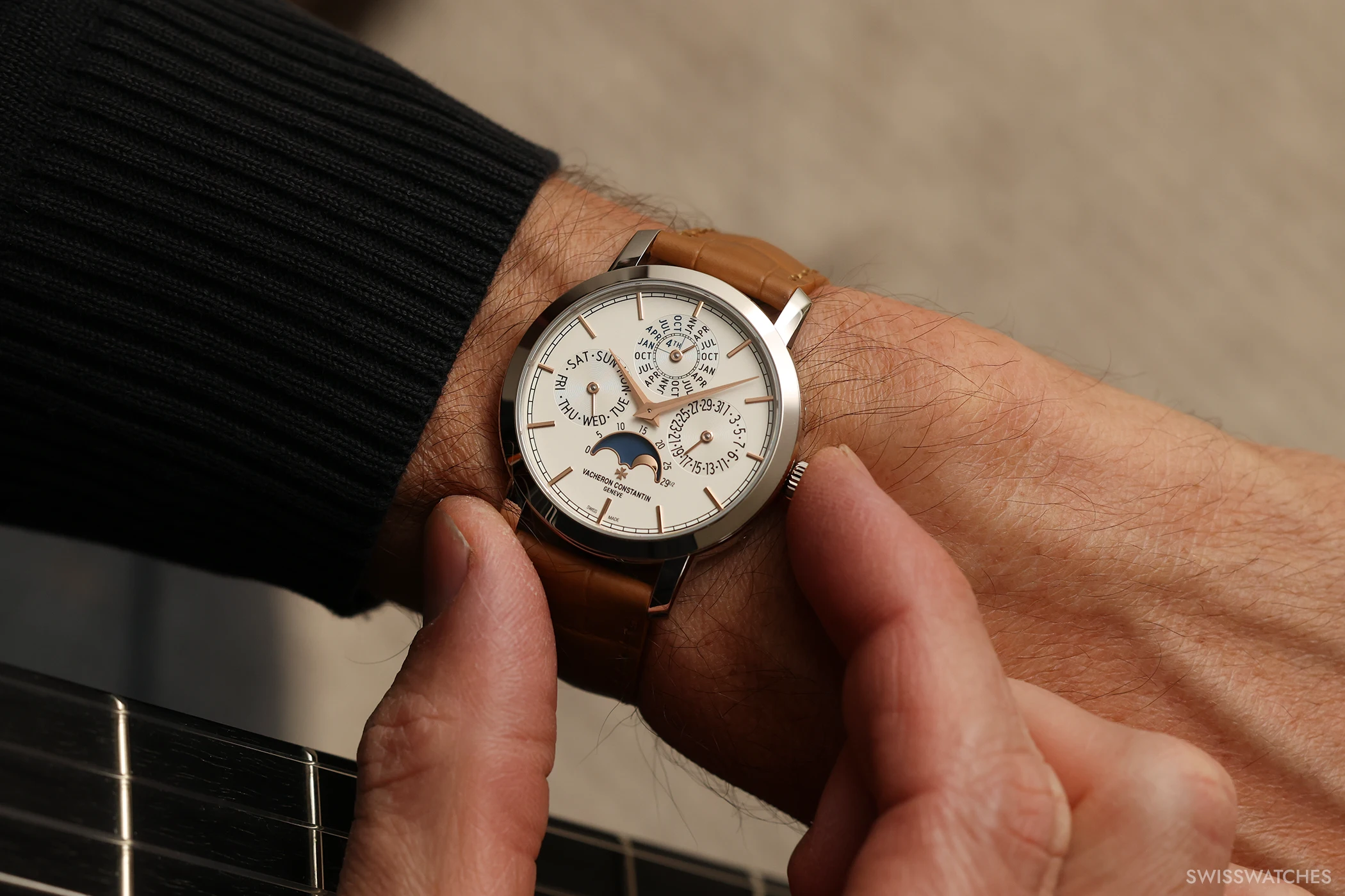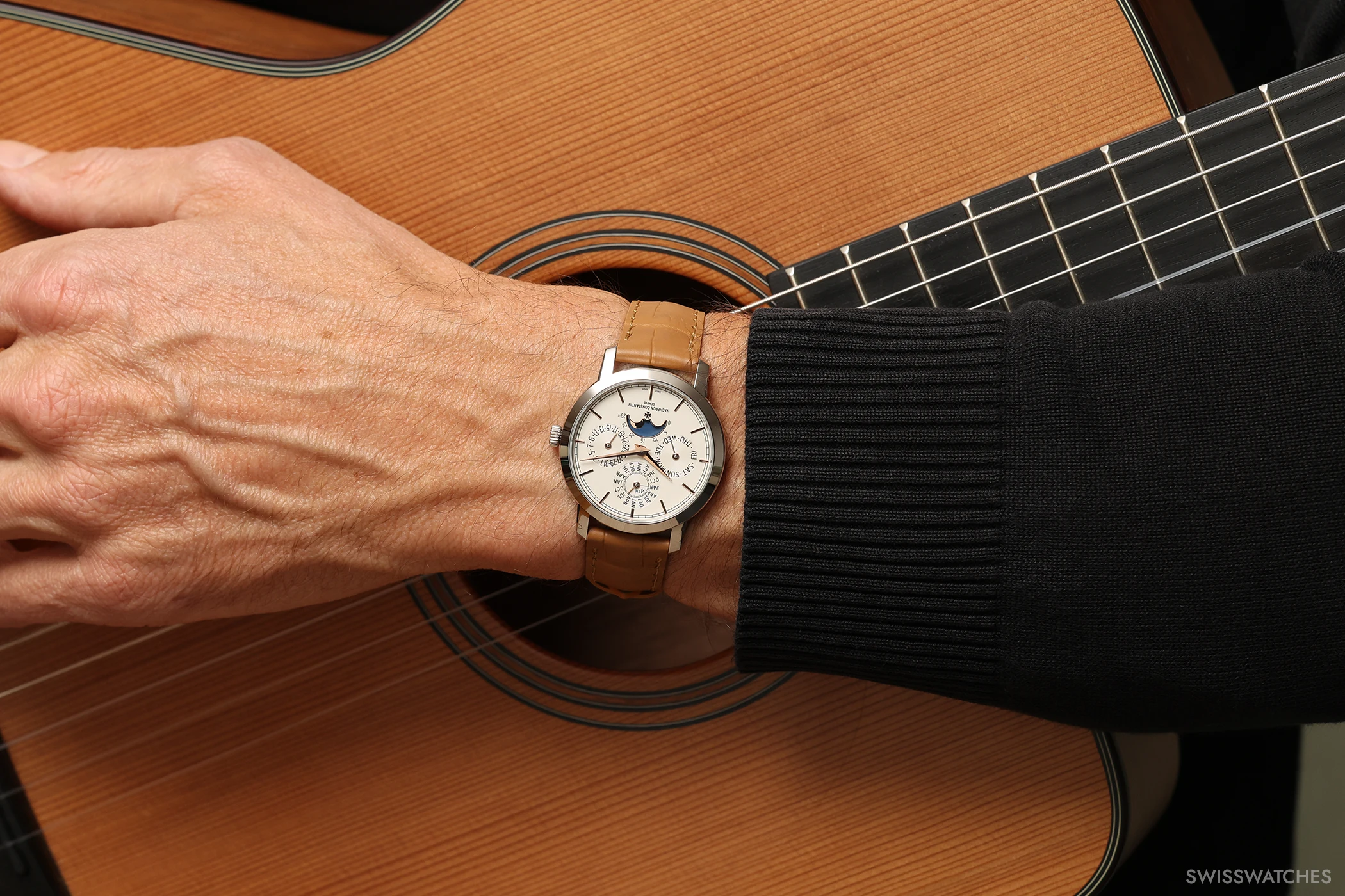 Der direkte Vergleich der Neuheit mit Uhren anderer Marken versinnbildlicht, warum die 36,5 mm der neuen Traditionnelle Ewiger Kalender Extra-Flach heute eher ungewöhnlich sind: Die Ewige Kalender Master Ultra Thin von Jaeger-LeCoultre (Ref. Q1142510) verfügt über einen Durchmesser von 39 mm bei einer Höhe von 9,2 mm. Die Classic Perpetual Calendar von Frederique Constant (Ref. FC-776ONB3H7) kommt in einem Gehäuse mit 40 mm Durchmesser und 12 mm Höhe, die Blancpain Villeret Quantième Perpétuel Phases de Lune (Ref. 6656 3642 55B) mit ewigem Kalender ist mit einem Gehäusedurchmesser von 40,30 mm bei einer Höhe von 10,70 mm erhältlich.