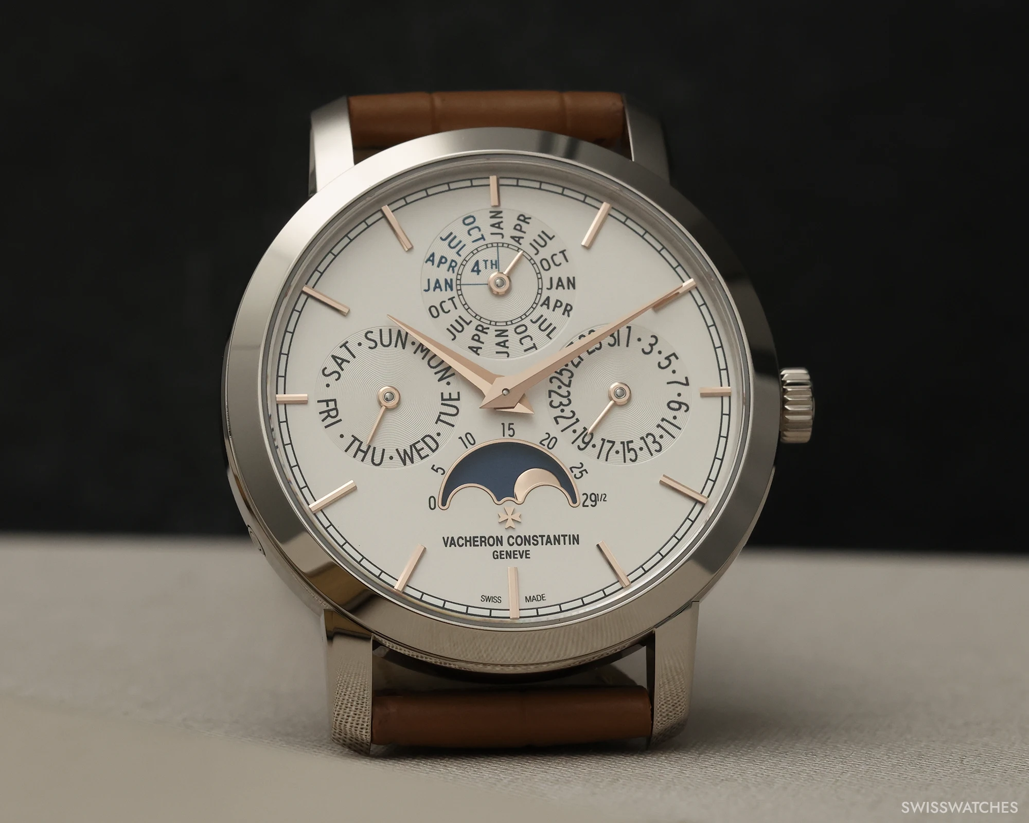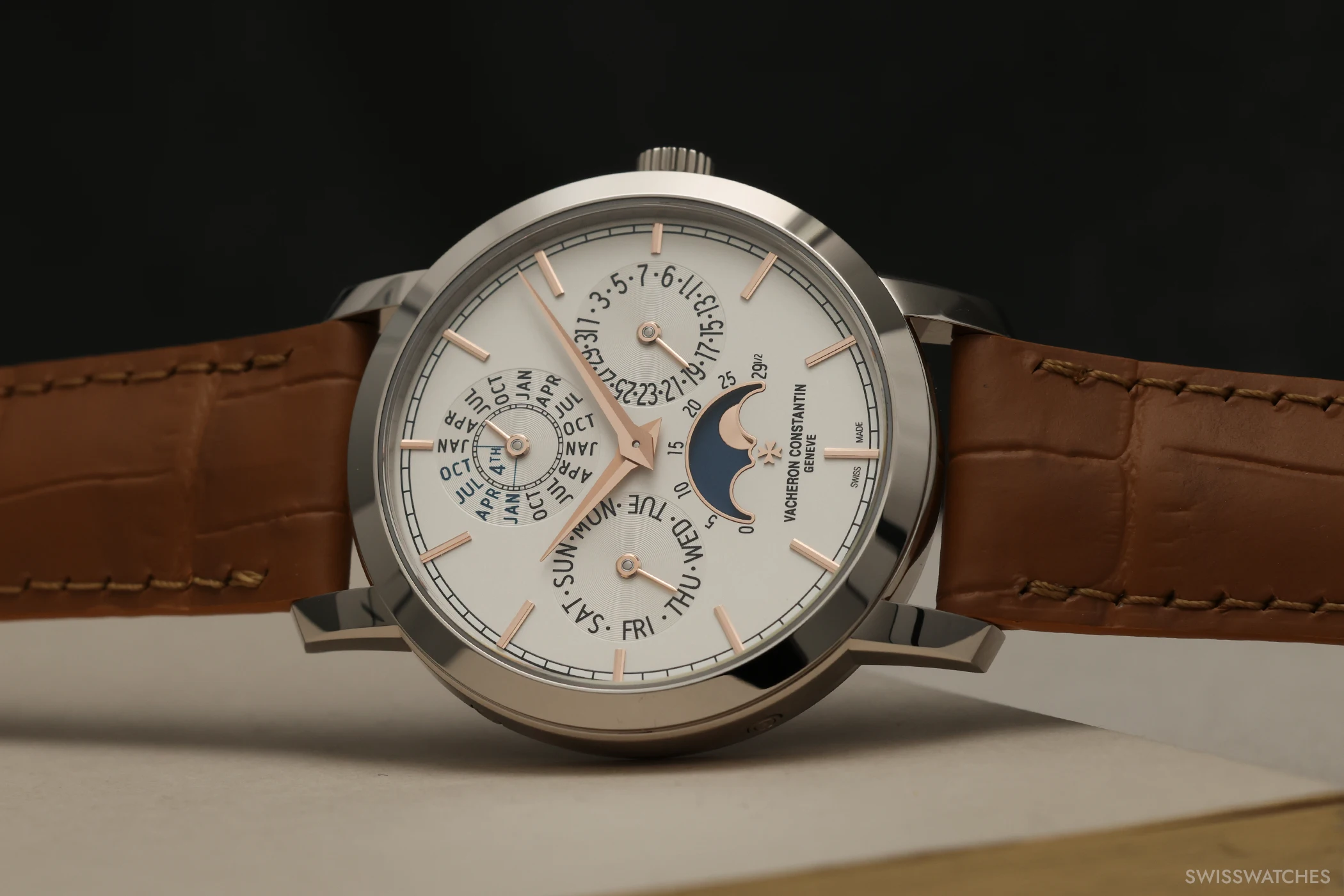 Das Weißgoldmodell der neuen Vacheron Constantin Traditionnelle Ewiger Kalender Extra-Flach präsentiert sich in einer Bicolor-Ausführung, bei der sämtliche Zeiger, Stabindizes und der Mond der Mondphasenanzeige in Roségold gehalten sind, während das Weißgoldgehäuse einen kühlen Gegenpol bildet. Das Alligatorlederband erscheint in einer neuen, hellbraunen Nuance.