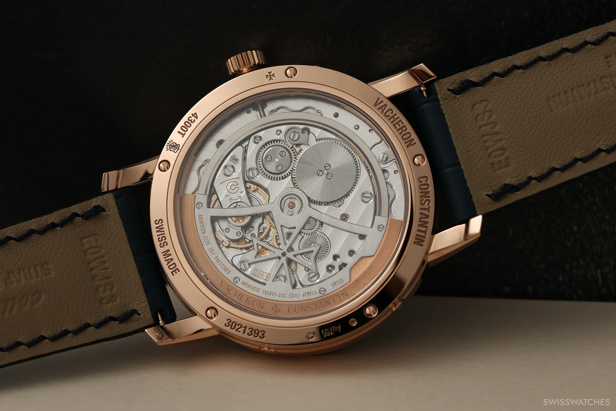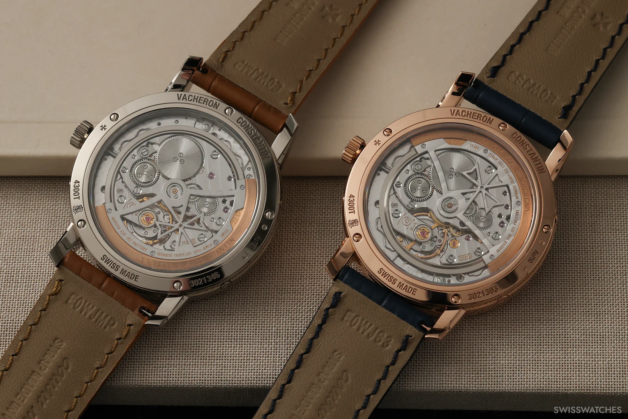 Auch bei der Konstruktion des Gehäuses knüpft Vacheron Constantin laut eigenen Angaben an die Referenz 43031 als Vorbild an: demnach verfügen die Neuheiten über ein abgestuftes Rundgehäuse mit geriffeltem Gehäuseboden, gerade Hörner und eine schmale Lünette, das bis zu 30 Meter wasserdicht ist. So sehr die neue Traditionnelle Ewiger Kalender Extra-Flach mit ihren kompakten Maßen also an einem, dem 19. Jahrhundert entstammenden, Ideal flachster Bauweise und den von der Ref. 43031 begründeten Grundformen des minimalistischen Ewigen-Kalender-Layouts anknüpft, ist sie dennoch alles andere als rückwärtsgewandt.