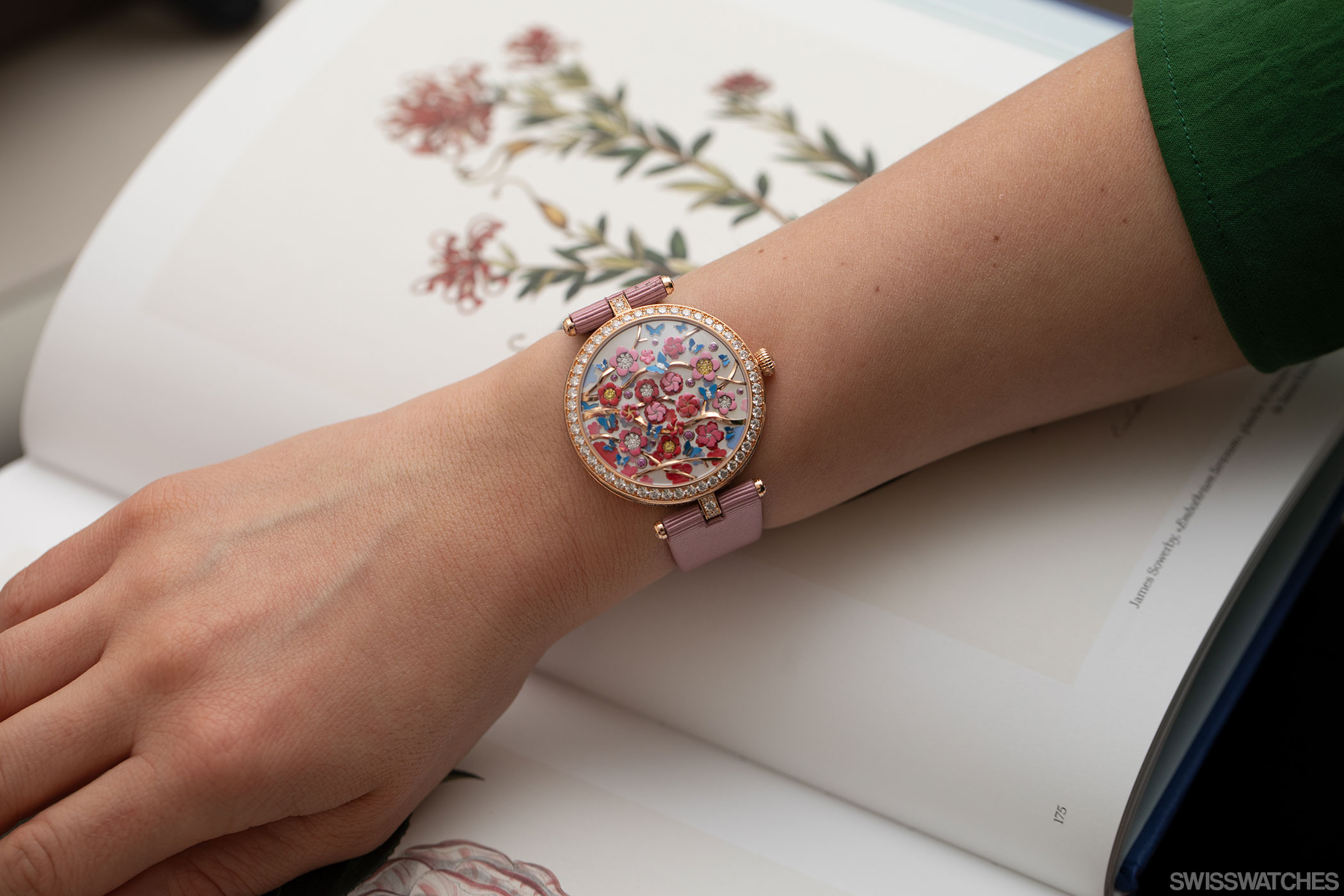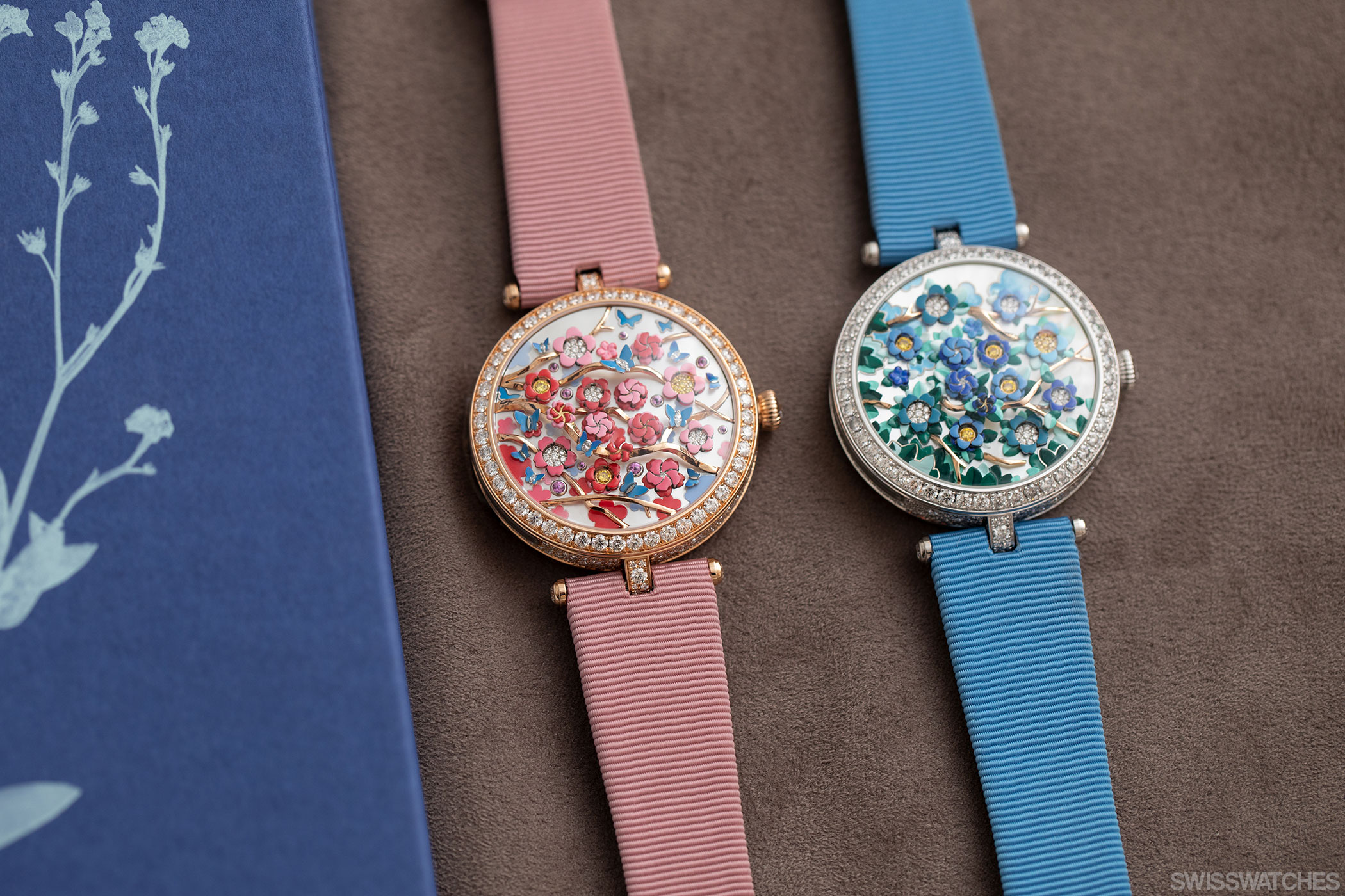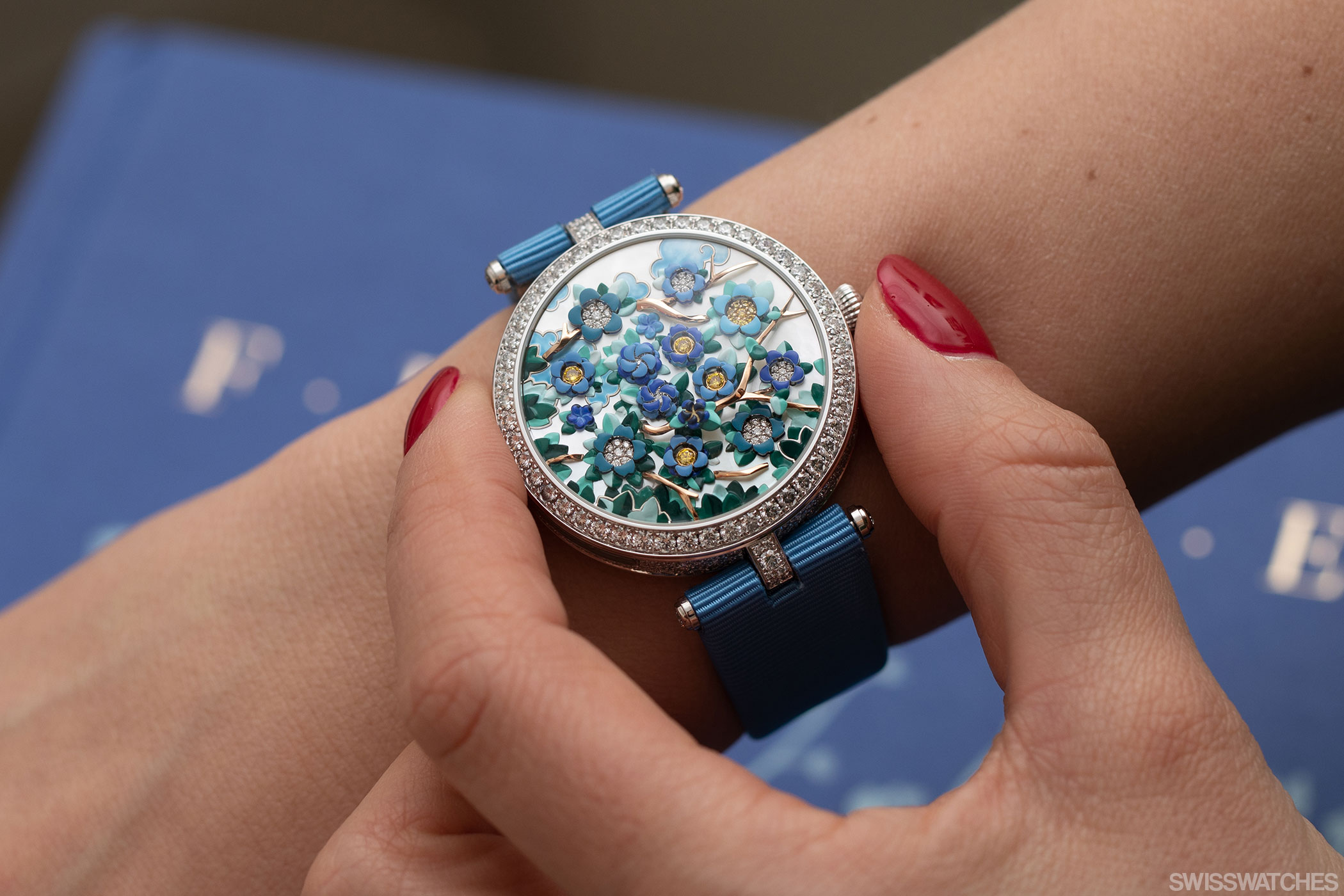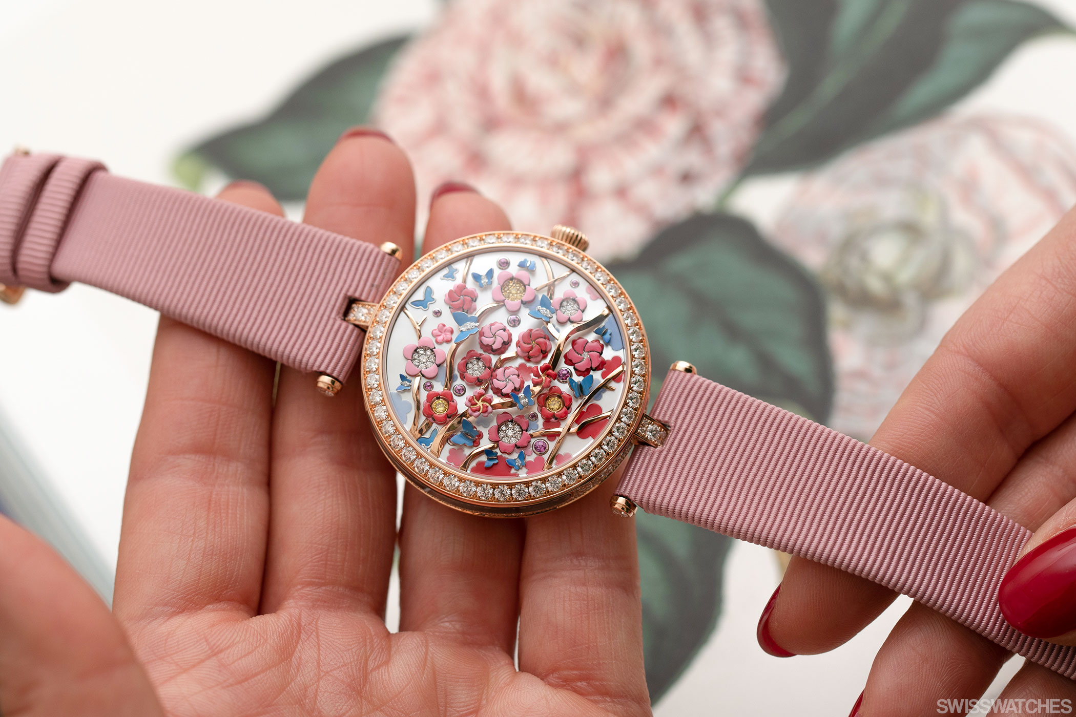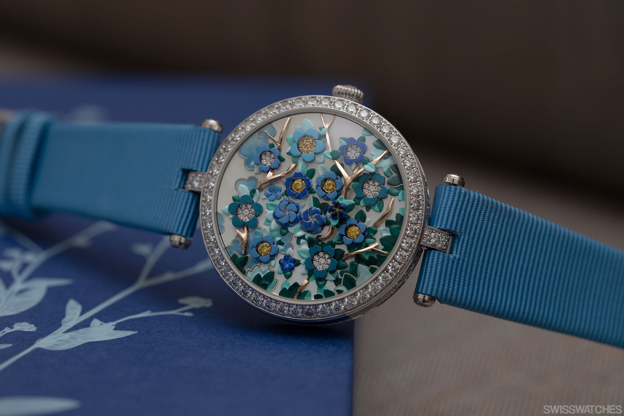 Ein weiteres Beispiel, das ich bereits zuvor eingehend betrachtet habe, ist die Lady Arpels Heures Florales. Es ist eine Uhr, die die Zeit im wahrsten Sinne des Wortes mit Blumen erzählt. Die Vorderseite der Uhr zeigt eine Ansammlung von Miniaturschmetterlingen, Diamanten und geschwungenen Zweigen aus Roségold, die sich über das Zifferblatt wölben. Doch wie der Name bereits andeutet, spielen in diesem hochkomplexen Zeitmesser die Blumen die Hauptrolle: Ihre Blütenblätter öffnen und schließen sich, um die Zeit anzuzeigen. Die Entwicklung dieses einzigartigen Modells war alles andere als einfach – von der ersten Idee bis zur Fertigstellung vergingen bei Van Cleef & Arpels ganze fünf Jahre.