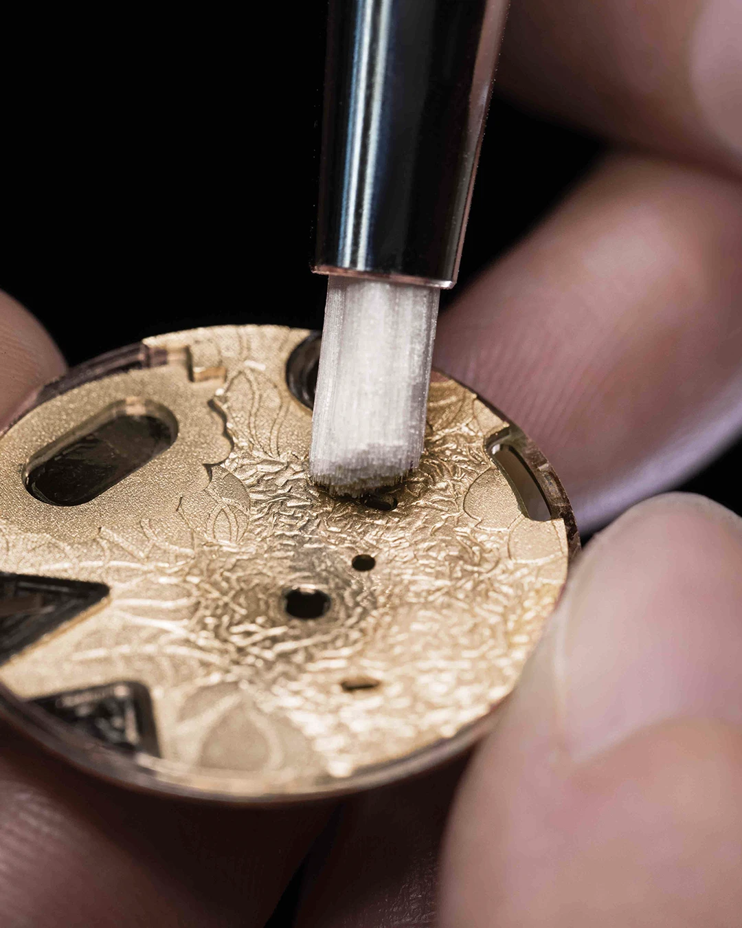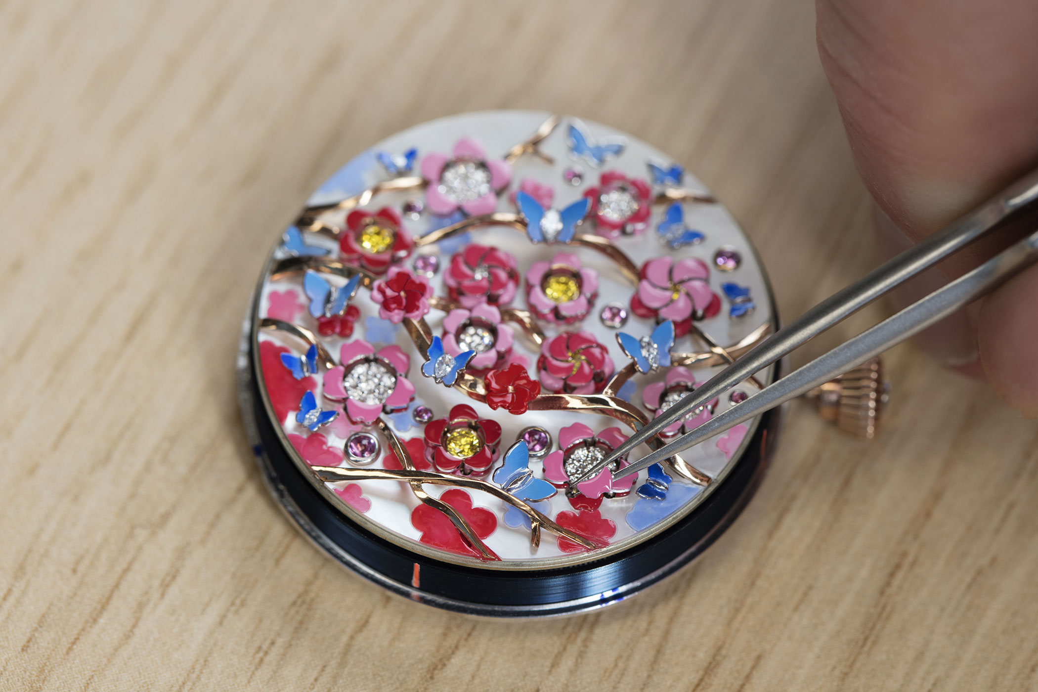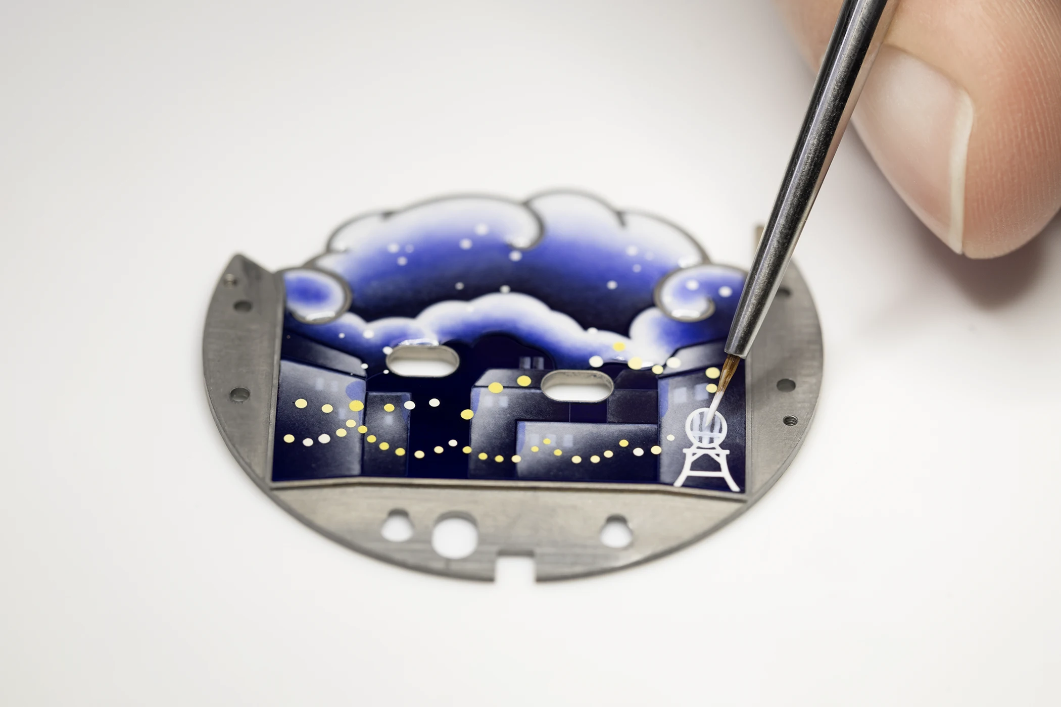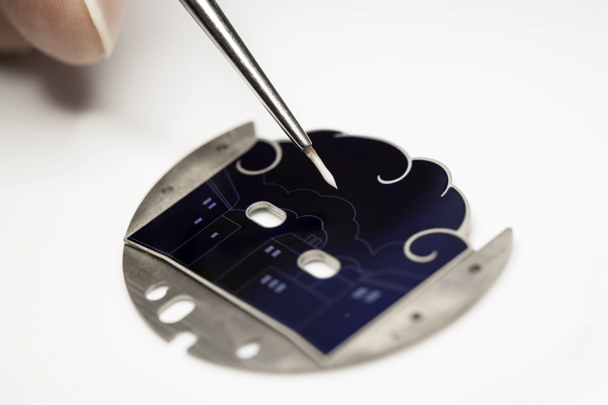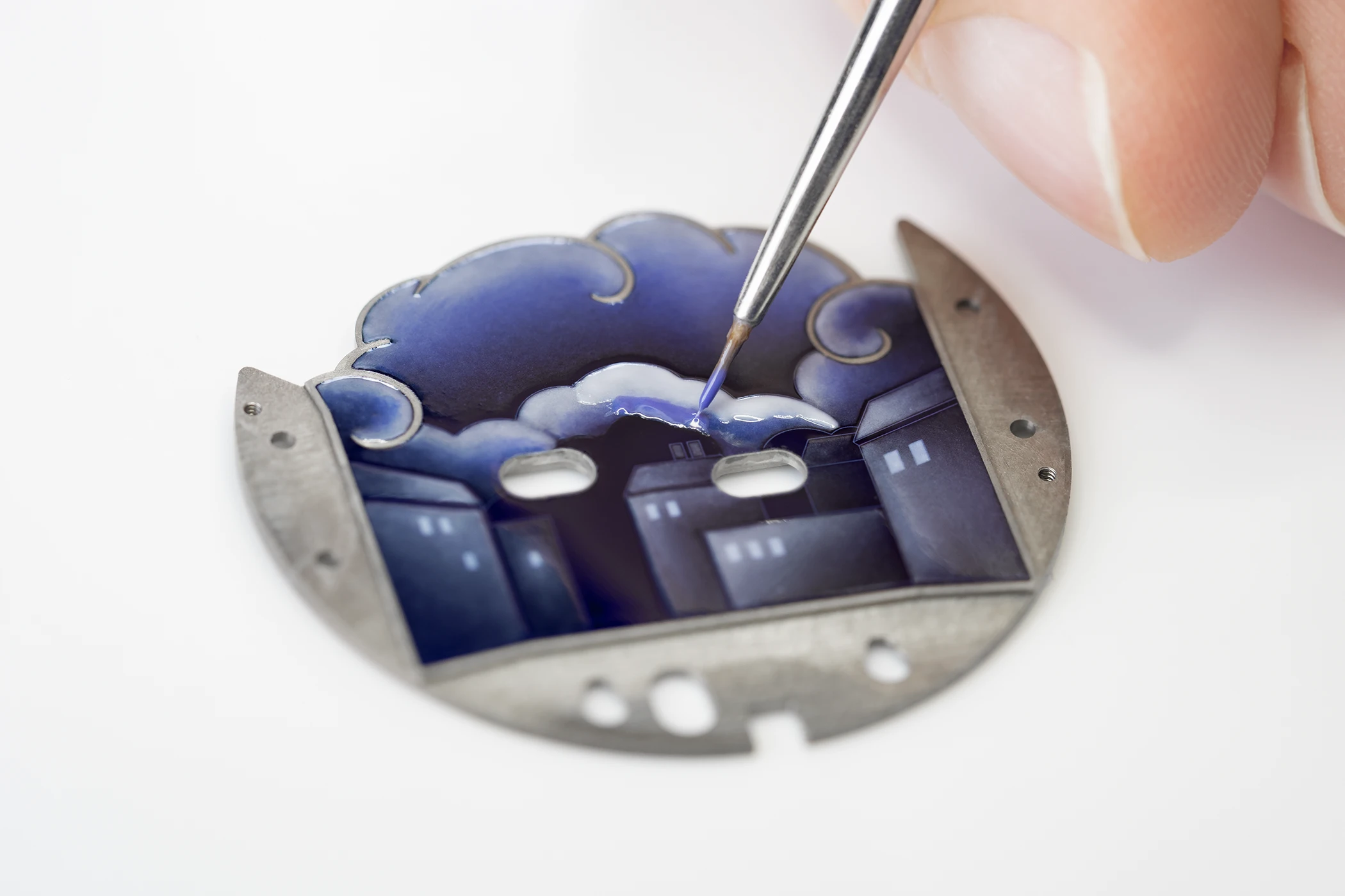 Die Emailleure halten das gewünschte Bild im Kopf und bauen das Zifferblatt durch subtile Farbverläufe auf – manchmal ein Gradient von Weiß an den Rändern, der in Blau übergeht, manchmal umgekehrt. Ein dünnes Öl wird verwendet, um bestimmte Töne abzuschwächen und den ätherischen, nebelartigen Effekt zu erzielen, wie er bei einigen Zifferblättern, etwa der Lady Arpels Bal Amoureux Automate, zu sehen ist. Jedes Zifferblatt wird anschließend vom jeweiligen Kunsthandwerker signiert und kann bis zu 45 Arbeitsstunden erfordern. Selbst wenn das Modell dasselbe ist, ist das Ergebnis niemals identisch; jedes Zifferblatt ist ein Unikat.