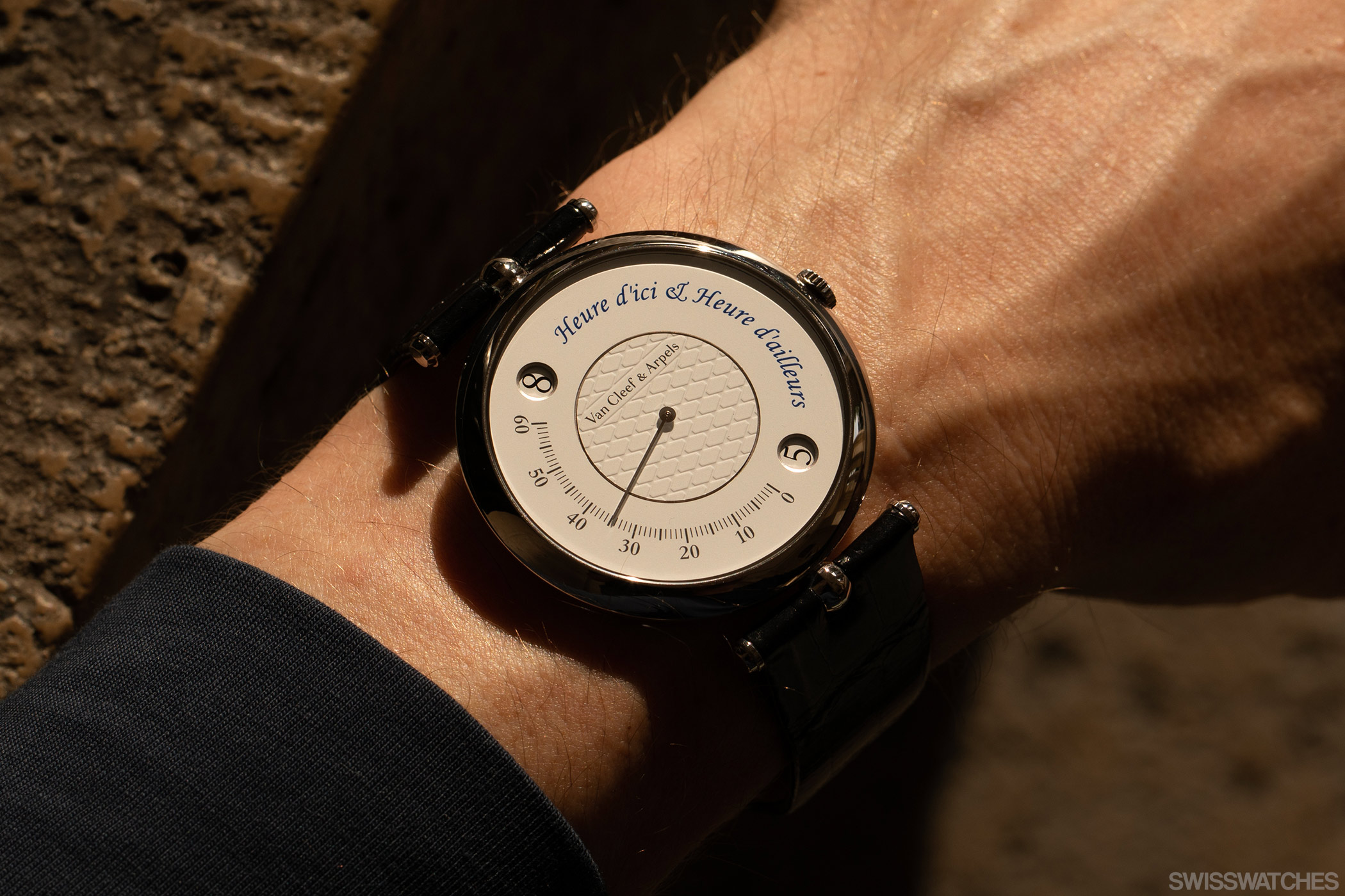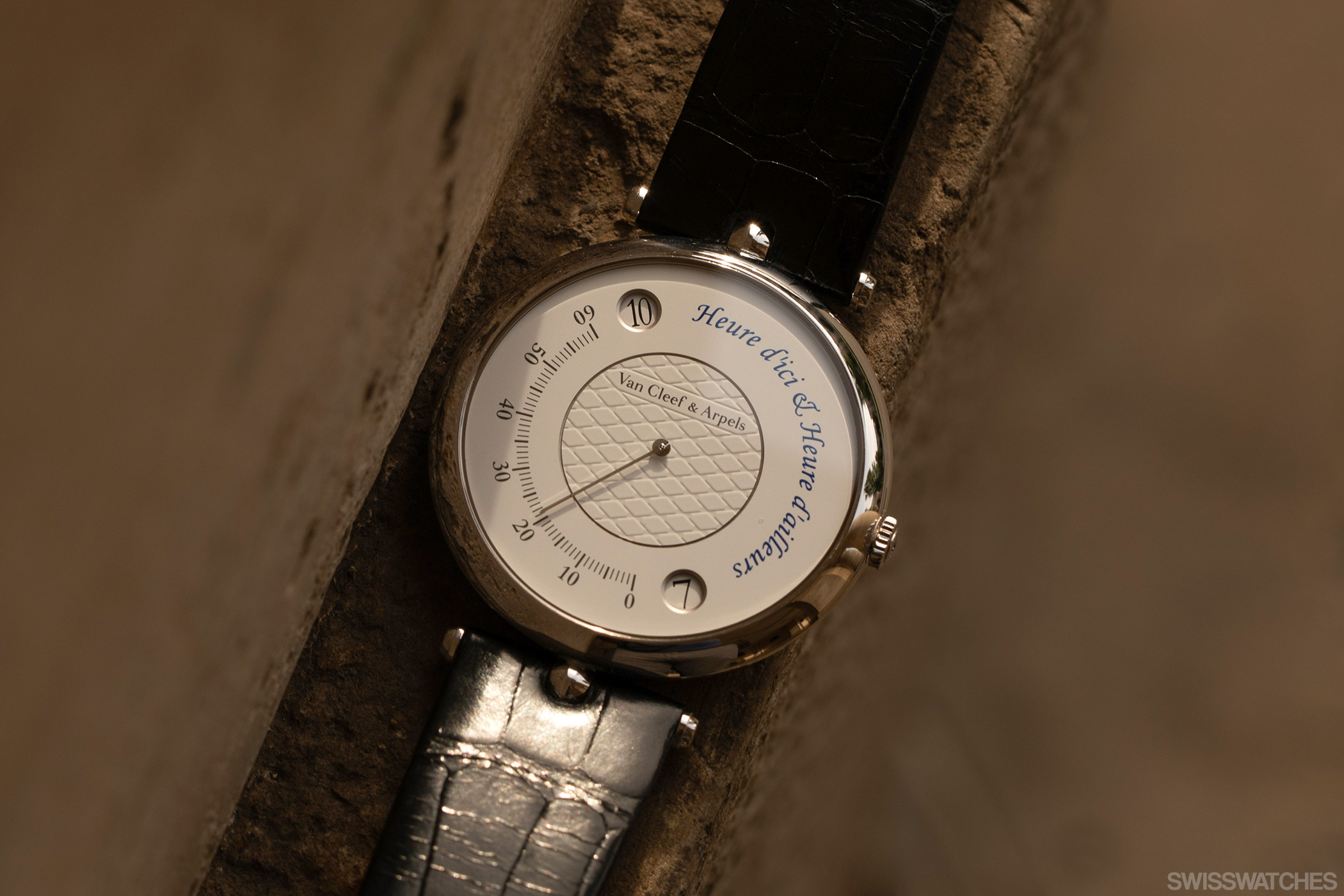 Ein weiteres bemerkenswertes Modell ist die Van Cleef & Arpels Pierre Arpels Heure d’Ici & Heure d’Ailleurs, die den altmodischen Charme der Sprungstunde aufgreift und in etwas subtil-poetisches für moderne Reisende verwandelt. Sie basiert auf einem Mechanismus, der erstmals 1883 von Josef Pallweber patentiert wurde und in der Art-déco-Ära sehr beliebt war. Die Sprungstunde verzichtet auf die traditionellen Zeiger und zeigt die Stunde stattdessen über Öffnungen an, die sich beim Übergang zur nächsten Minute „springen”. Van Cleef & Arpels geht jedoch noch einen Schritt weiter: Dieses 42 mm große Modell aus Weißgold zeigt nicht nur eine, sondern – wie der Name andeutet – zwei Zeitzonen an: die „Zeit hier“ und die „Zeit anderswo“.