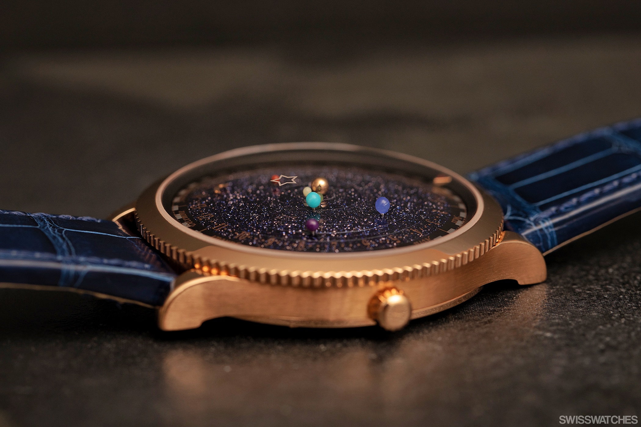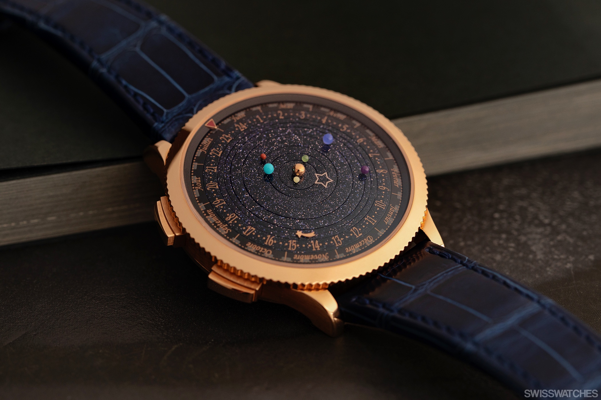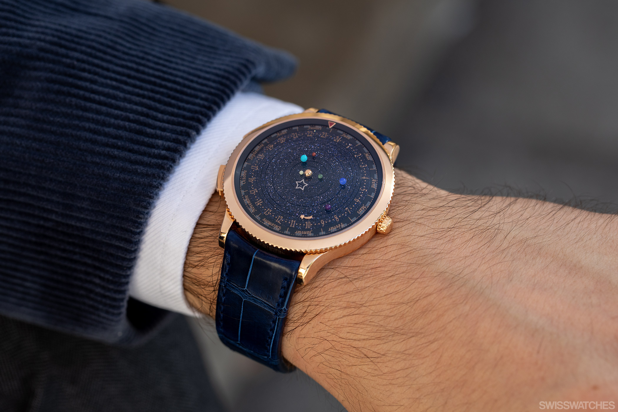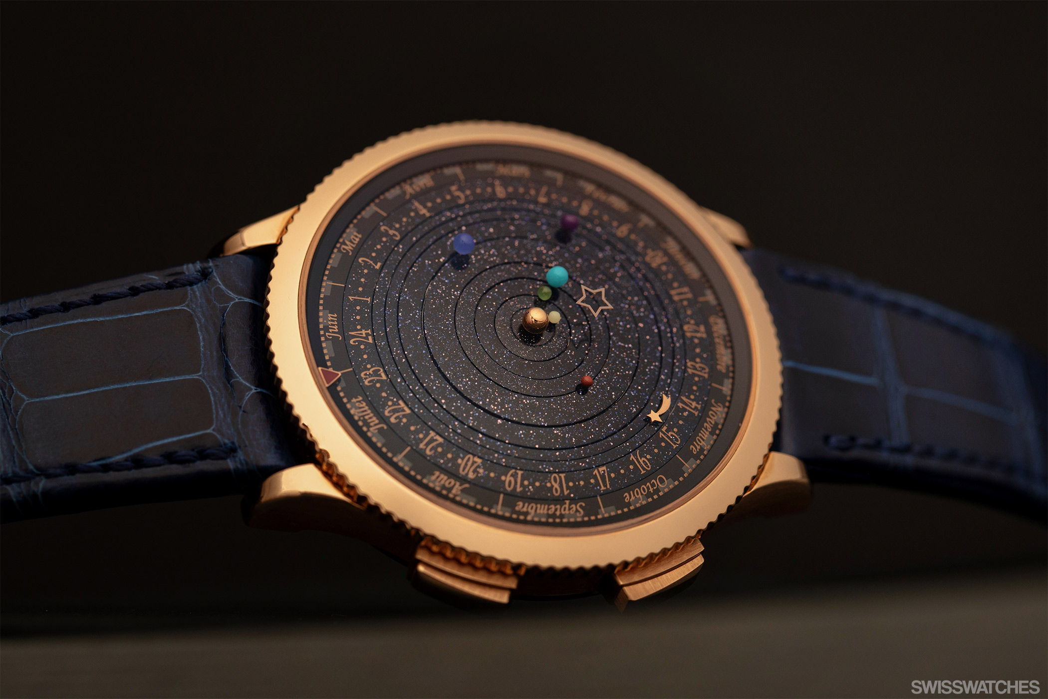 Eine der bahnbrechendsten Uhren der Manufaktur ist die Midnight Planetarium, die 2014 erstmals vorgestellt wurde. Als Teil der „Poetic Complications” des Hauses lanciert, begnügt sich auch diese Uhr nicht damit, nur die Zeit anzuzeigen: Sie stellt vielmehr das Sonnensystem nach, komprimiert auf einen Durchmesser von lediglich 44 mm. Sechs Planeten (Merkur bis Saturn) umkreisen eine Sonne aus massivem Gold in Echtzeit. Jeder Planet ist in einem handgefertigten Edelstein gefasst und folgt seinem echten kosmischen Rhythmus: Merkur umrundet die Sonne in 88 Tagen, Saturn benötigt dafür volle 29 Jahre. Aventuringlasringe bilden den Nachthimmel, unabhängige Uhrwerke treiben jede Umlaufbahn an und ein roségoldener Stern gleitet alle 24 Stunden um den äußeren Ring und zeigt so auf subtile Weise die Zeit an. Selbst die drehbare Lünette erfüllt nicht nur praktische Zwecke, sondern ermöglicht es der Trägerin auch, ein „Glücksdatum“ zu markieren. Einmal im Jahr steht die Erde dann unter einem winzigen, gravierten Stern auf dem Saphirglas – eine poetische Ausrichtung, die für Jubiläen, Neubeginne oder einen ausgewählten, besonderen Moment reserviert ist.