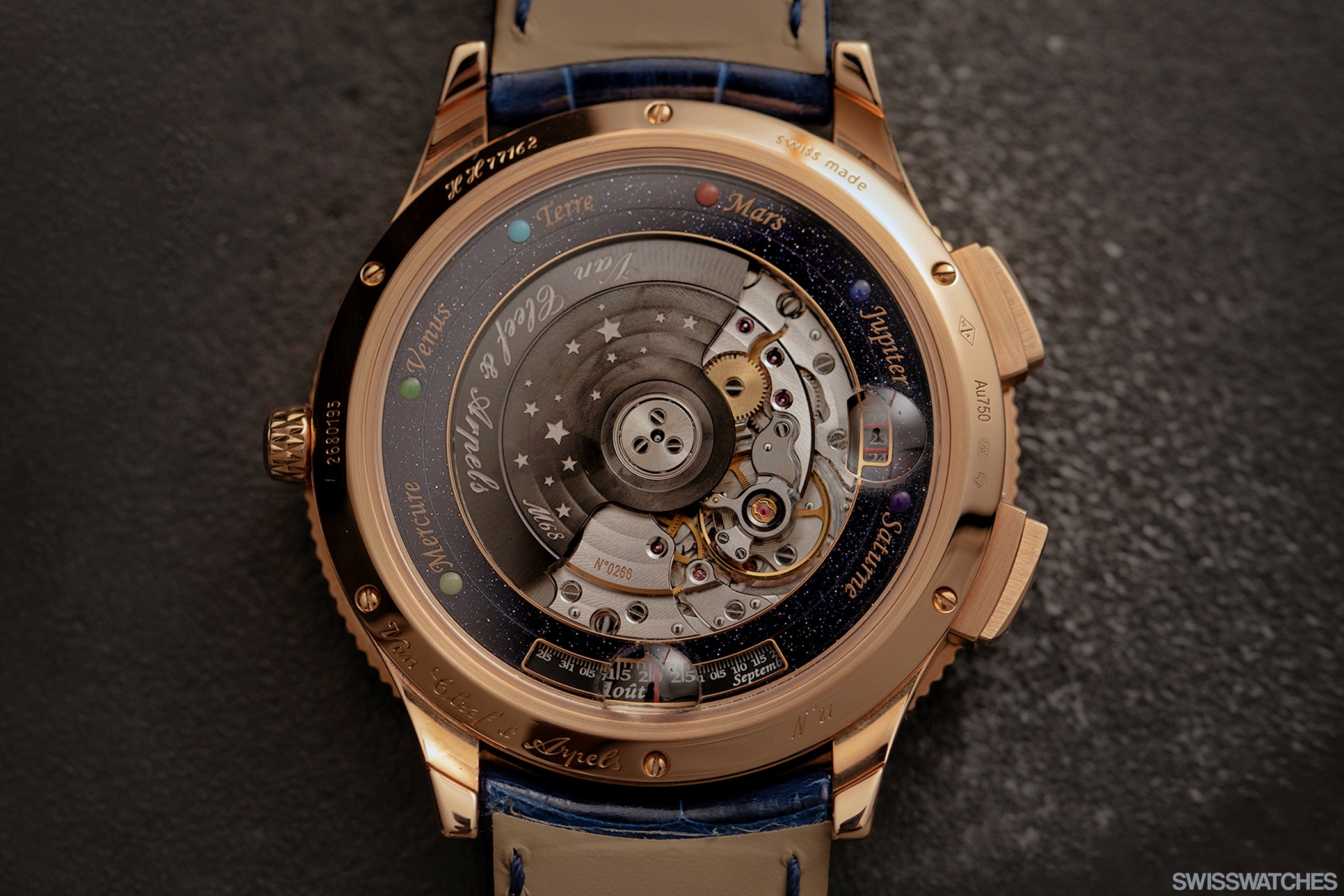 Wendet man die Uhr, setzt sich die astrologische Erzählung fort. Zwei vergrößerte Fenster zeigen Kalenderdaten, die über einen diskreten Drücker am Gehäuse eingestellt werden können. So lässt sich die Position der Planeten nicht nur für den aktuellen Tag, sondern für jedes Datum – in der Vergangenheit oder Zukunft – ablesen.