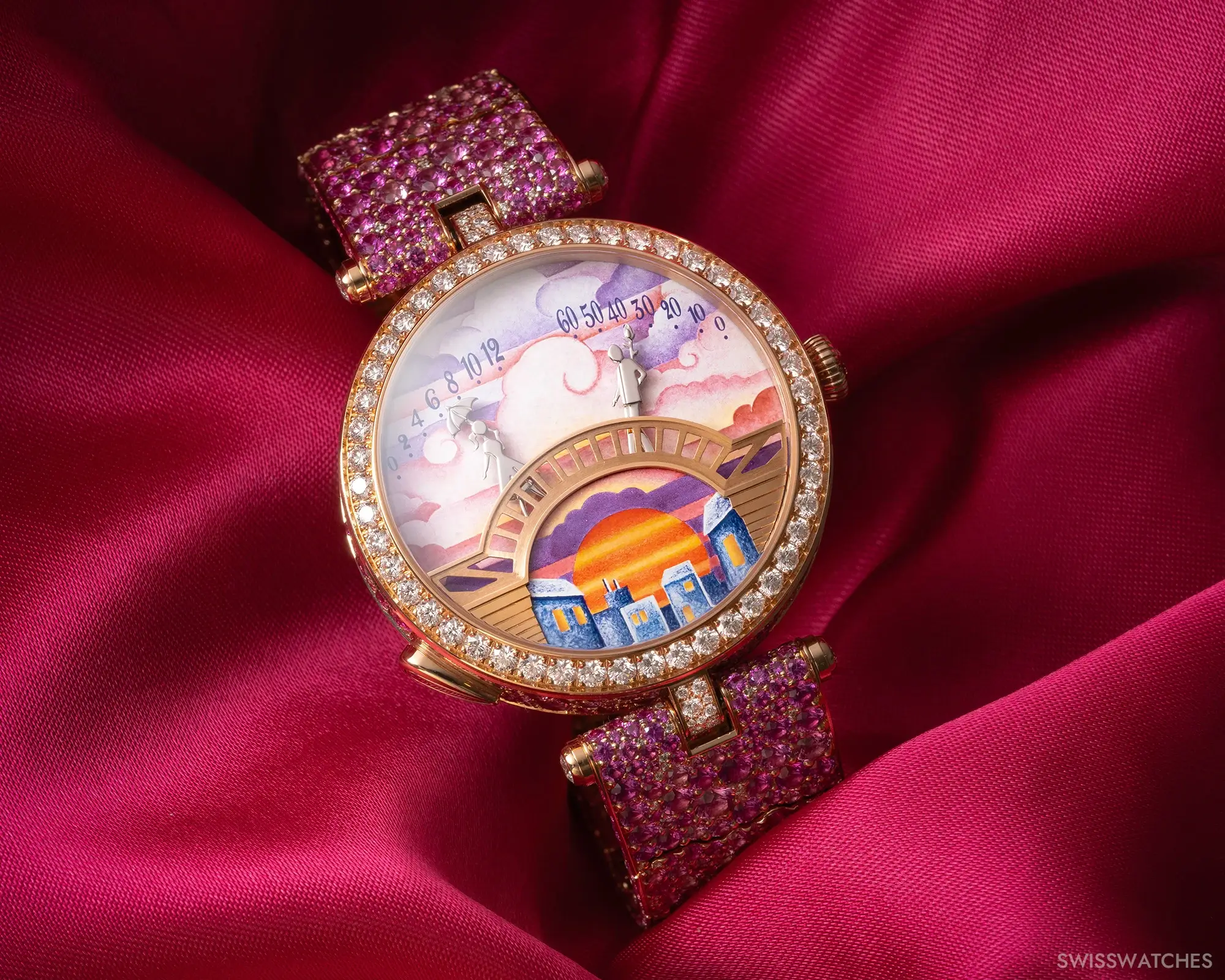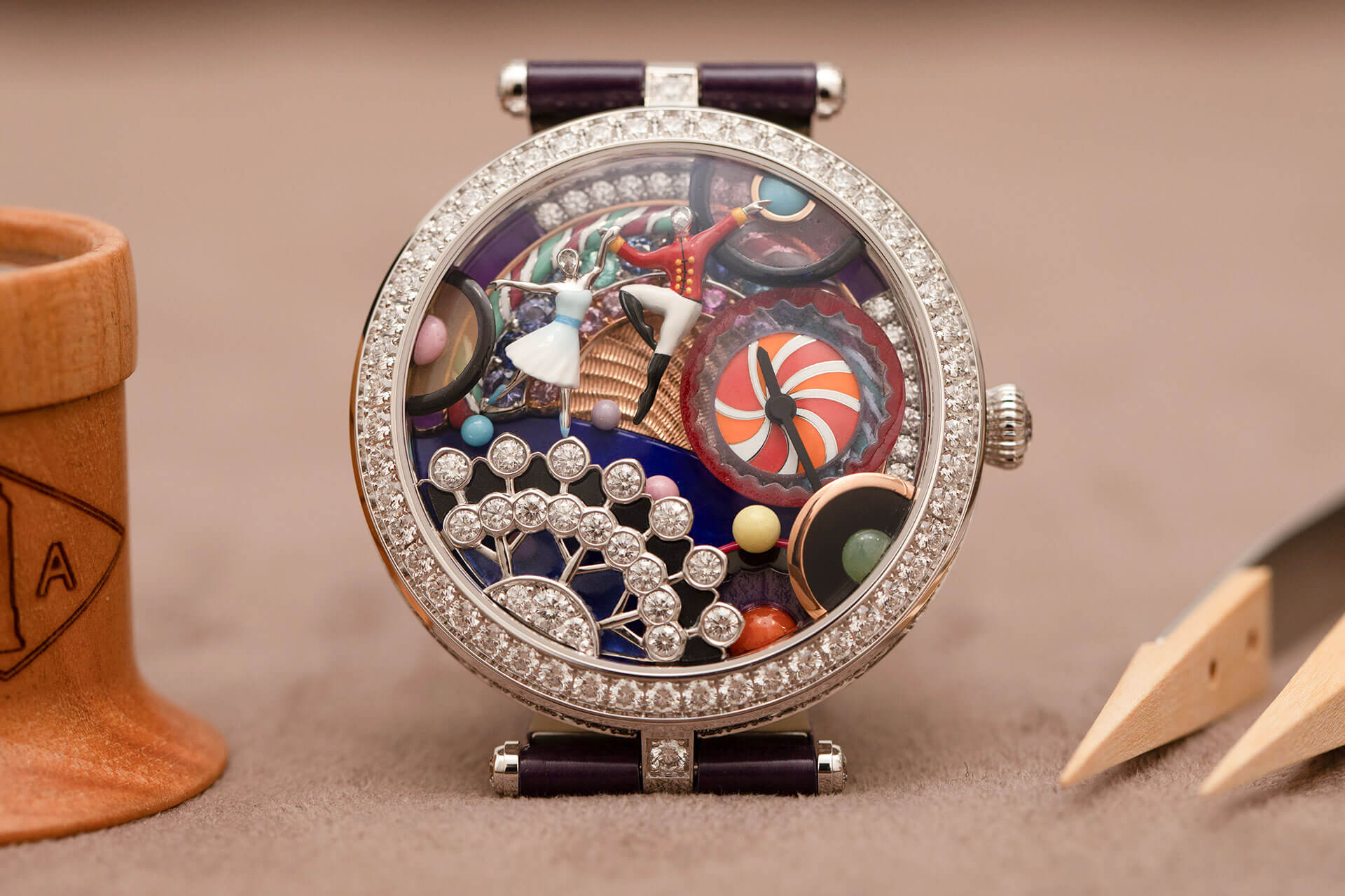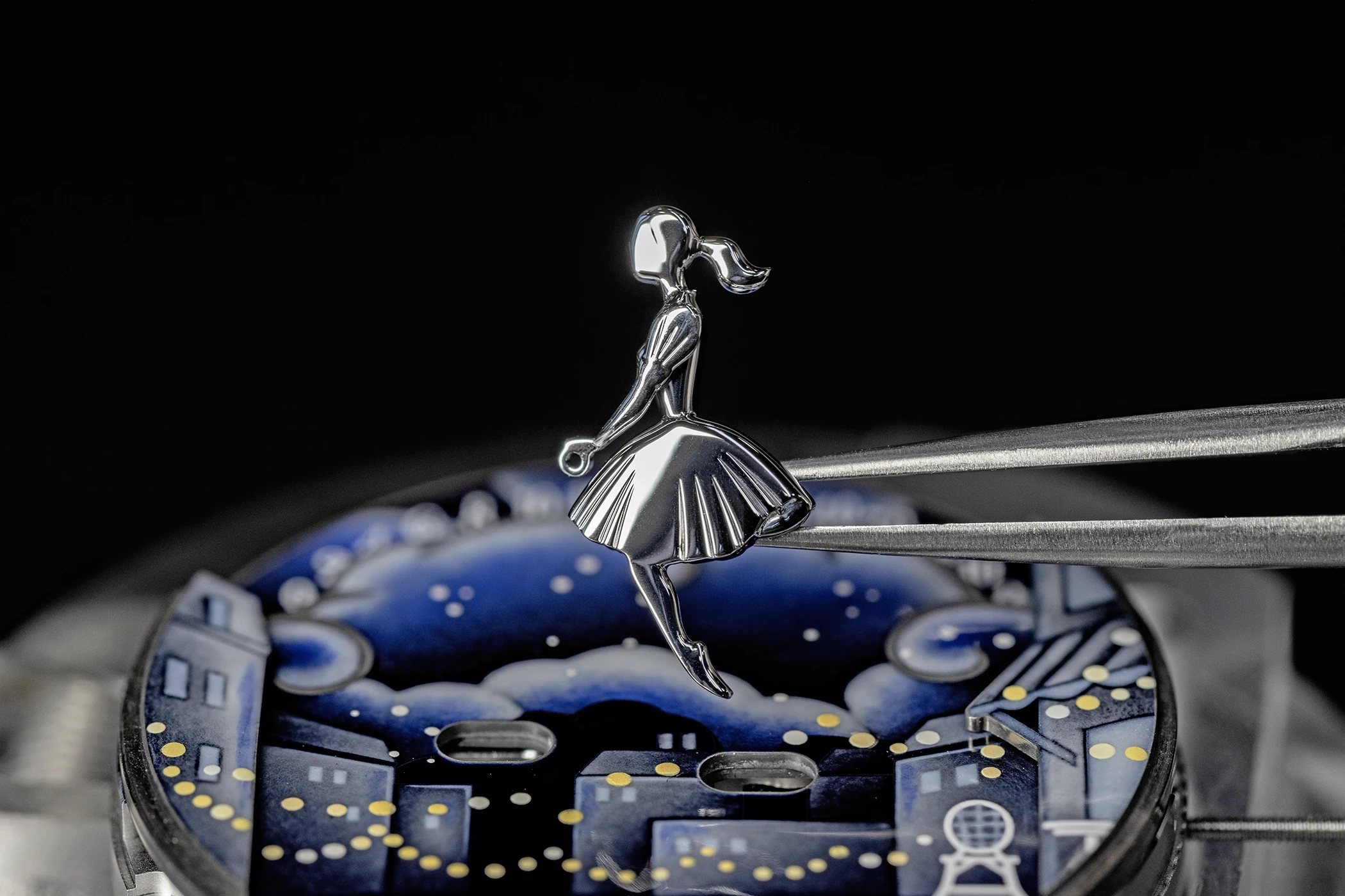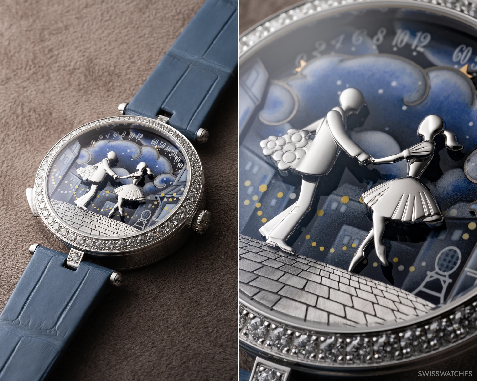 Wie bei der Vorstellung der neuesten Modelle ausführlich dargelegt wurde, ist eines der besonders spannenden Modelle die Lady Arpels Bal Amoureux Automate. Sie besticht nicht nur durch ihre faszinierenden Mechanismen, sondern auch durch die atemberaubende Verwendung von Emaille. Die Uhr zeigt zwei Figuren, die sich an den Händen halten und sich in drei Animationen (Taille, Arm und Hand) zuneigen, um sich schließlich zu küssen. Die Entwicklung dieses Mechanismus dauerte nicht weniger als vier Jahre. Das liegt unter anderem daran, dass die Ingenieure von Van Cleef & Arpels besonderen Wert auf flüssige Bewegungen legten, ohne die Präzision zu beeinträchtigen. Bemerkenswert ist, dass Van Cleef & Arpels inzwischen alle Schritte der Montage, Prototypenerstellung, Prüfung und Qualifikation seiner Zeitmesser intern durchführt.