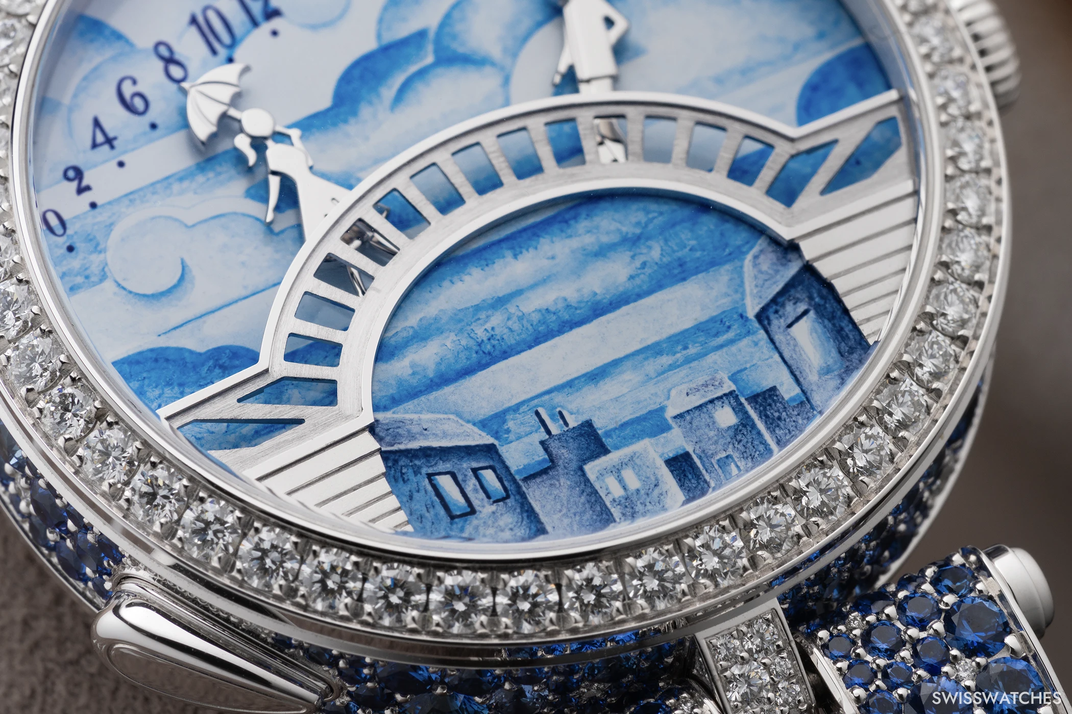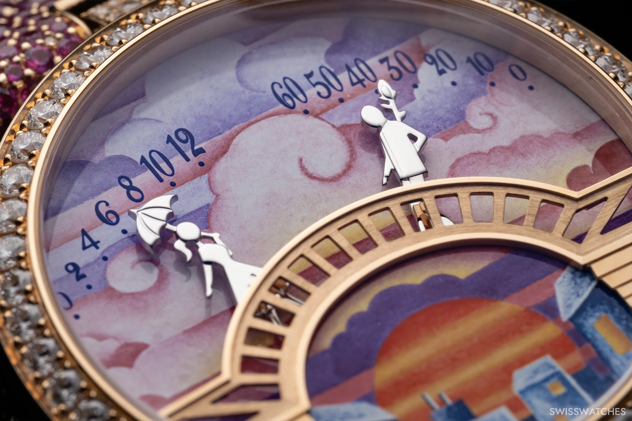 Es wäre ein Versäumnis, eine der beliebtesten Kreationen von Van Cleef & Arpels nicht zu erwähnen: die Pont-des-Amoureux-Serie. Erstmals vorgestellt im Jahr 2010, neu interpretiert im Jahr 2019 und erneut aufgelegt im Jahr 2025, zeigt sie zwei Liebende, die sich auf einer Miniaturbrücke in Paris zur Mittagszeit und Mitternacht begegnen. Eine weibliche Figur zeigt die Stunden an, während die männliche Figur die retrograde Minutenanzeige durchläuft, den Bogen hinauf- und hinabsteigt, bis sich beide zu einem Kuss treffen.