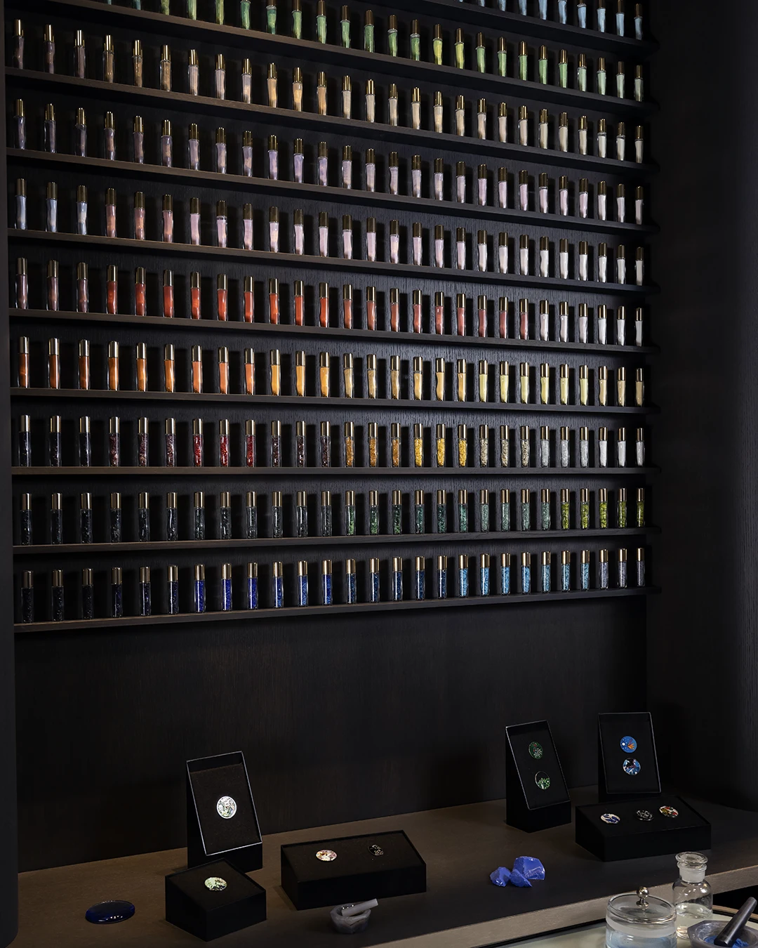 Die Lady Arpels Bal Amoureux Automate ist ein Paradebeispiel für das Können des Hauses im Bereich der Emaillemalerei. Wir besuchten das Métiers-d’Art-Emailleatelier und starteten im sogenannten „Emaillekeller“. Dieser heißt zwar „Keller“, ist aber in Wirklichkeit ein dunkler, warmer Raum, in dem Gläser mit gemahlenem Silizium (im Wesentlichen Sand) auf ihre Verwandlung warten. Auf den Regalen sind filigrane Beispiele der Emaillemalerei zu sehen – von zarten Schmetterlingsflügeln bis hin zu elegant wirbelnden Koi-Fischen. Die Emailleure und Emauilleurinnen von Van Cleef & Arpels sind in allen Techniken ausgebildet. Man erklärt mich jedoch, dass sich jeder auf einen bestimmten Bereich spezialisiert.