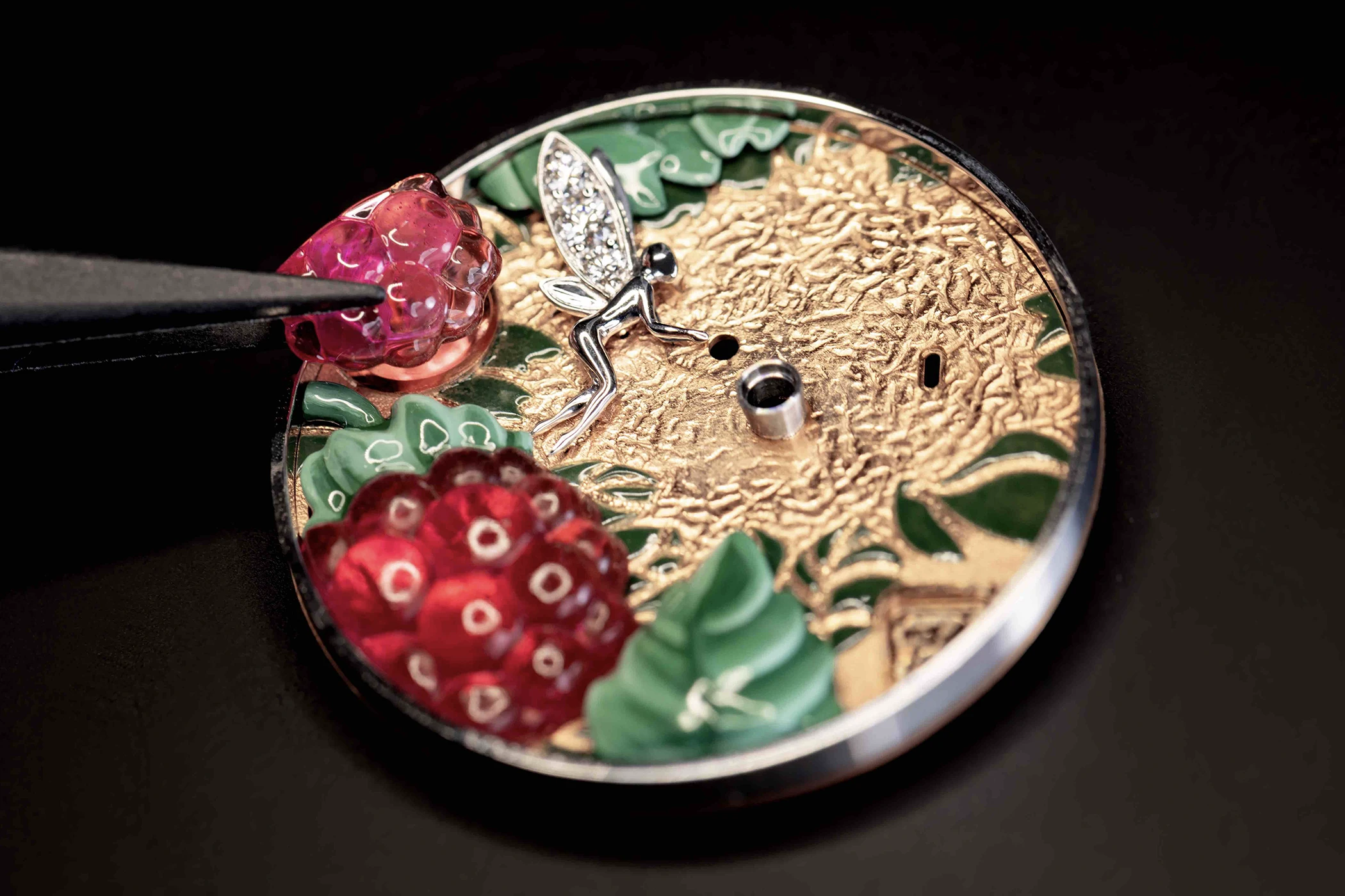 Im Laufe der Jahre sind bestimmte Motive zu den Markenzeichen der Welt von Van Cleef & Arpels geworden: Ballerinen, Feen, Flora und Fauna, astrologische Darstellungen – und natürlich die Liebe. Laut Bernard lassen diese vielfältig miteinander verwobenen Motive viel Raum für Vorstellungskraft und Kreativität. „Jeder in der Maison kann seine Idee vortragen“, sagt Bernard. Ein passionierter Gärtner könnte Gräser vorschlagen, die sich scheinbar im Wind wiegen; ein Vogelbeobachter könnte schildern, wie eine Mutter ihr Junges im Nest füttert. Alles kann nachgebildet werden; nichts ist unmöglich. Um tatsächlich eine Uhr zu schaffen, die den Eindruck erweckt, sich im Wind zu bewegen, entwickelte Van Cleef & Arpels eigens einen speziellen Mechanismus im Werk, der einen lebensechten Effekt erzeugt. Solche Bestrebungen sind für die Maison gängige Praxis – bei vielen anderen Manufakturen jedoch kaum vorstellbar.