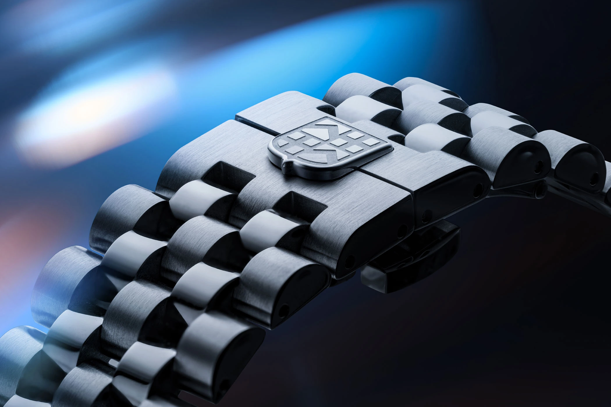 Das polierte Edelstahlgehäuse ist bis fünf Bar wasserdicht und misst 12,53 Millimeter in der Höhe. Den oberen Abschluss bildet ein gewölbtes, entspiegeltes Saphirglas.