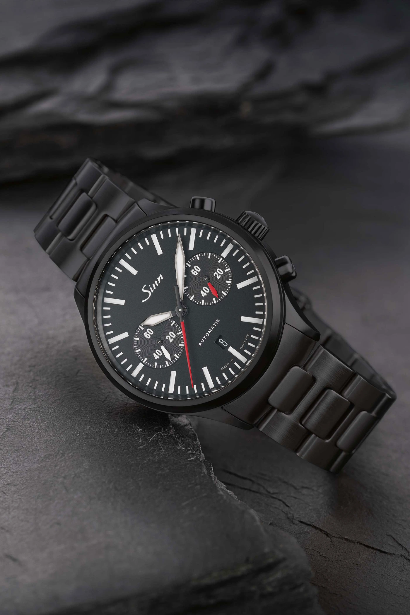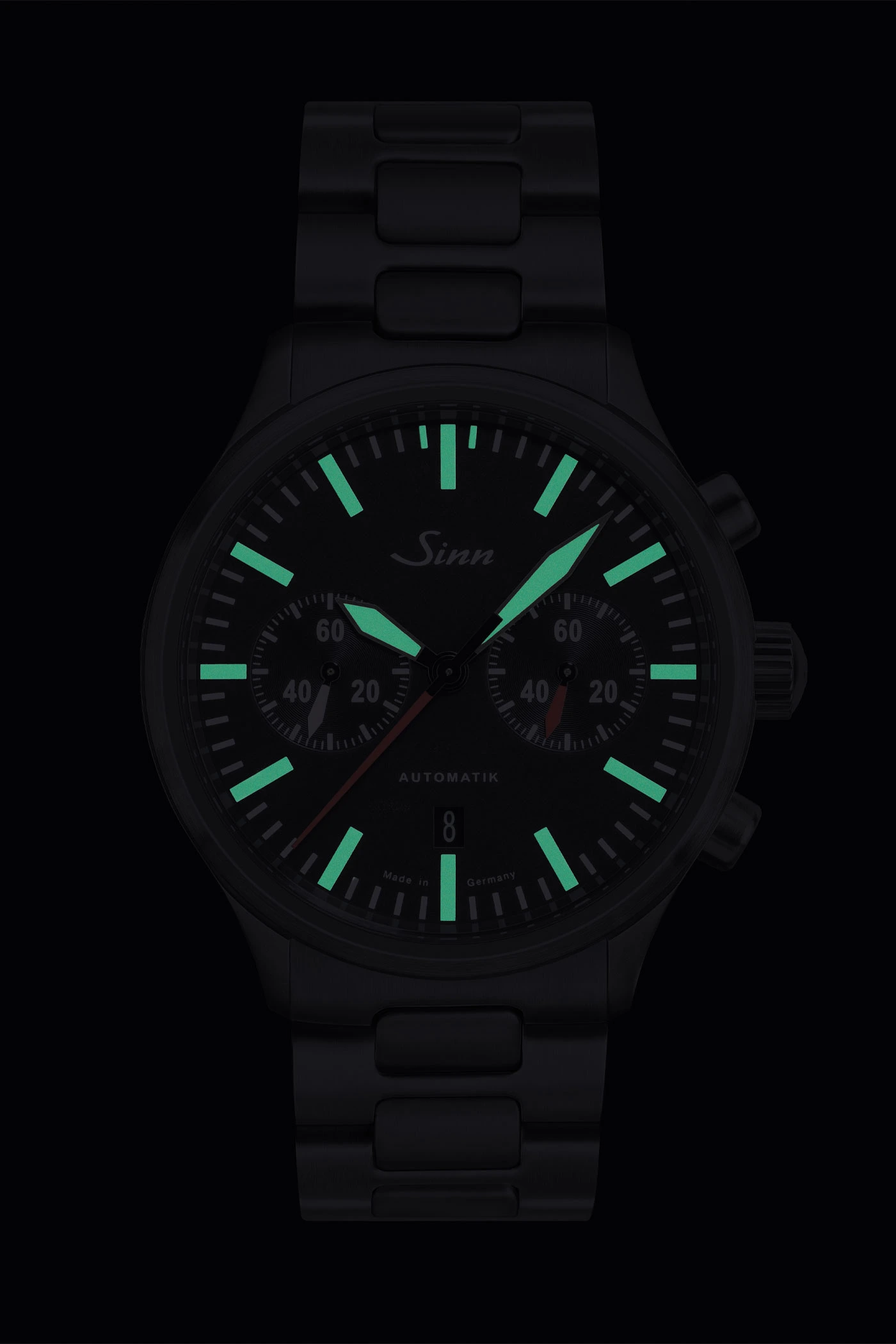 Das Gehäuse des neuen SINN-Chronographen bringt weitere robuste Eigenschaften mit. Dazu gehört der Magnetfeldschutz bis 100 mT (80.000 A/m), der die Anforderungen der DIN 8309 (deutsche Industrienorm für antimagnetische Armbanduhren) deutlich übertrifft. Erreicht wird dieser hohe Wert durch die Konstruktion eines geschlossenen, weichmagnetischen Innenraums, bestehend aus Zifferblatt, Werkhaltering und Gehäuseboden.