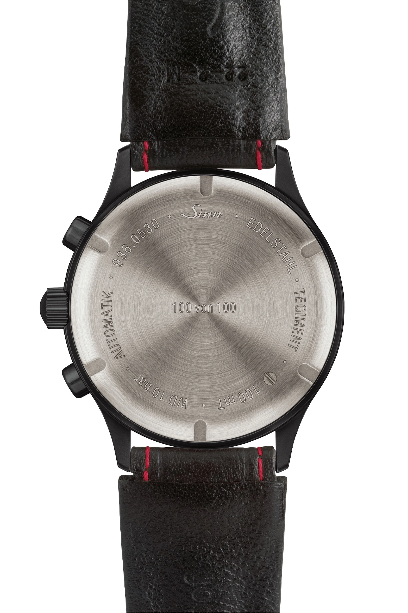 Im Unterschied zum Vorgängermodell präsentiert sich das 43 Millimeter große und 15 Millimeter hohe Edelstahlmodell 936 S mit einer schwarzen Hartstoffbeschichtung. Um den sogenannten Eierschaleneffekt zu verhindern – das Abplatzen harter Farbschichten auf weichem Grundmaterial – setzt SINN diese Technologie ausschließlich auf Tegiment-Oberflächen ein.